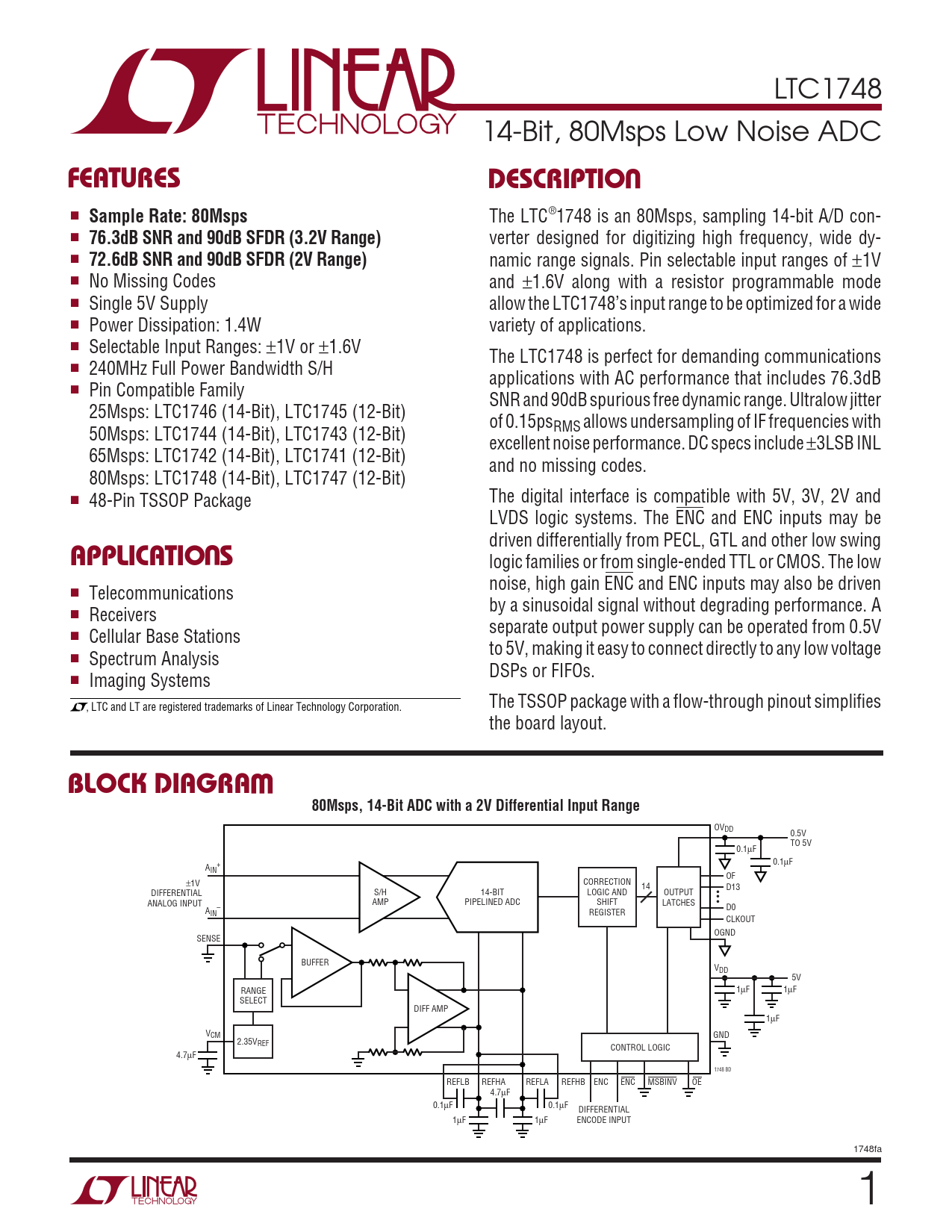 The LTC®1748 is an 80Msps, sampling 14-bit A/D con- ■