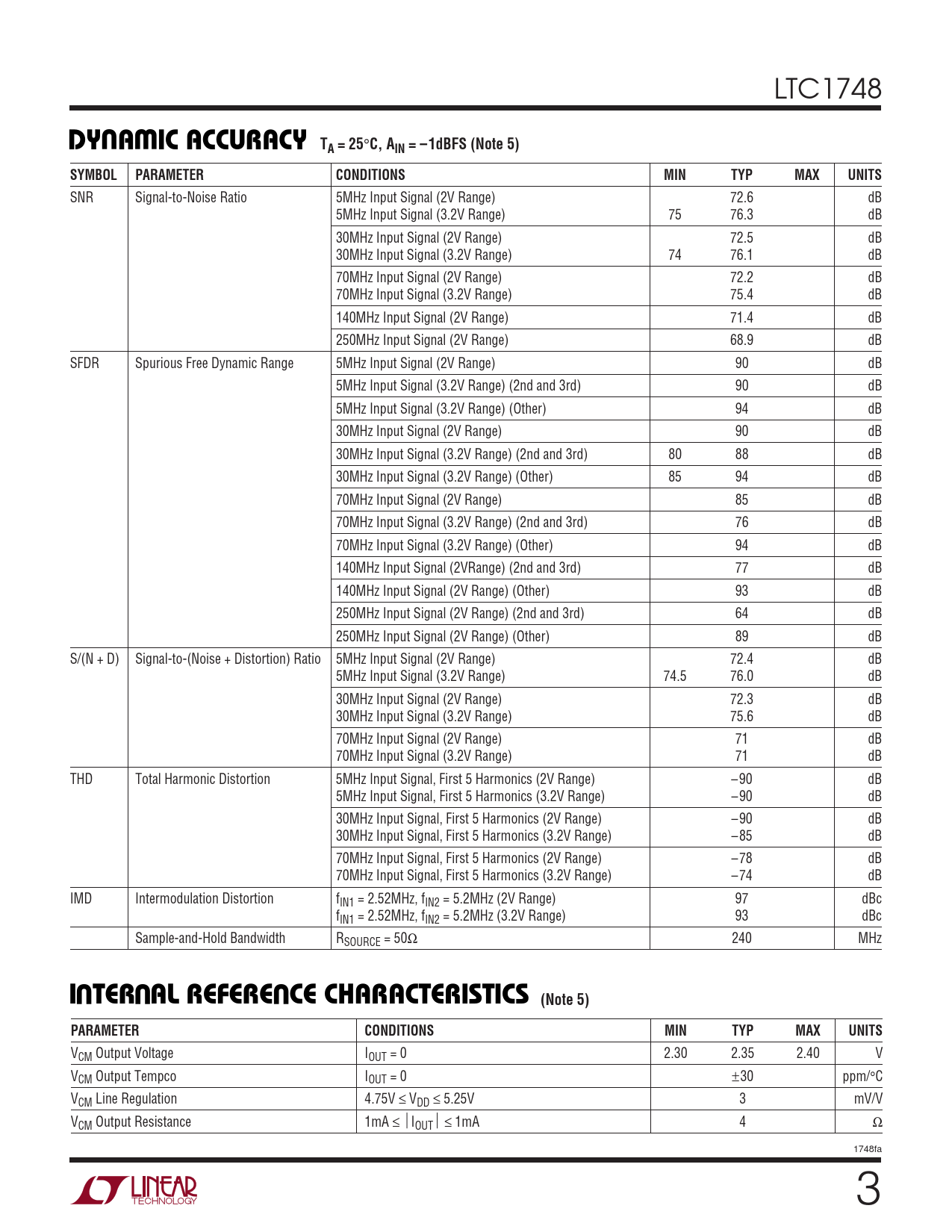 VCM Output Voltage IOUT = 0 2.30 2.35 2.40 V VCM Output Tempco IOUT = 0 ±30 ppm/°C VCM Line Regulation 4.75V ≤ VDD ≤ 5.25V 3 mV/V VCM Output Resistance 1mA ≤ IOUT ≤ 1mA 4 Ω 1748fa 3