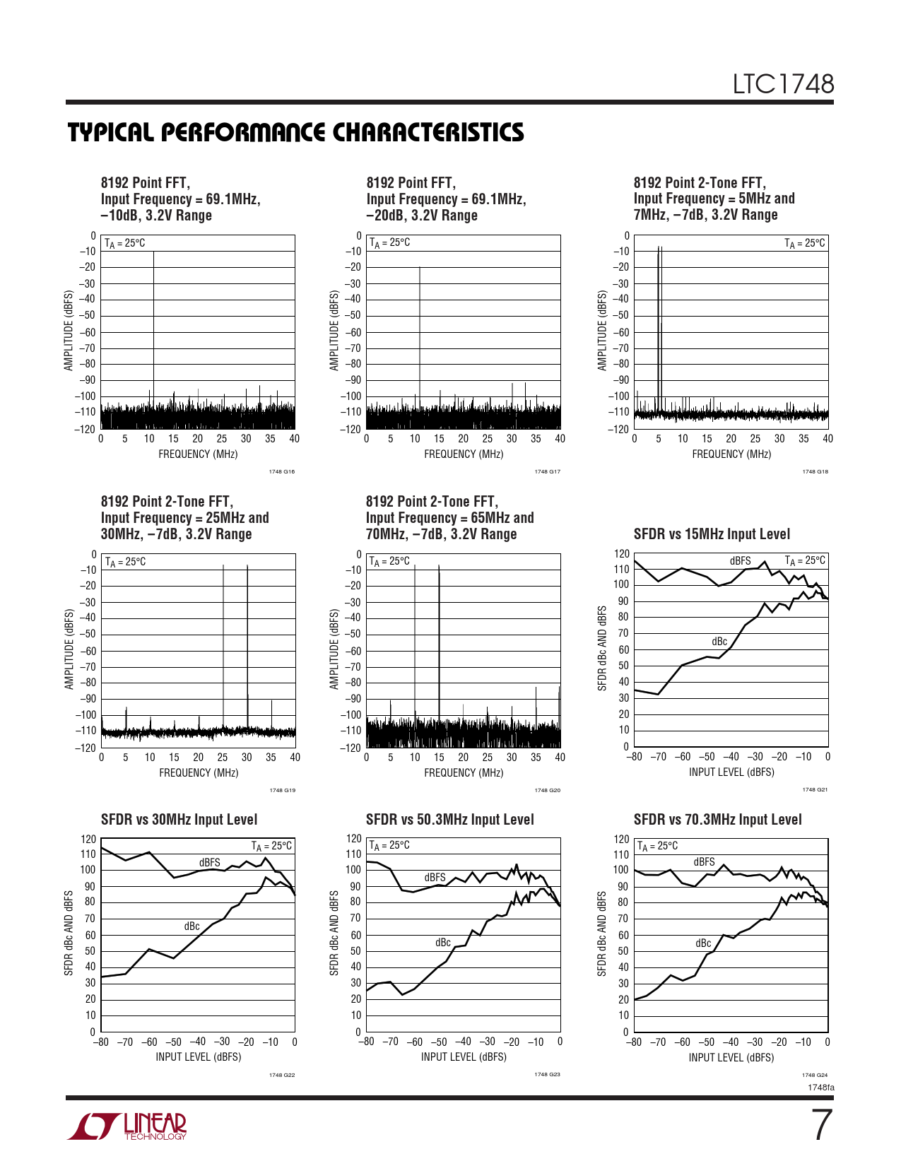 120 120 120 TA = 25°C TA = 25°C TA = 25°C 110 110 110 dBFS dBFS 100 100 100 dBFS 90 90 90 80 80 80 70 70 70 dBc 60 60 60 dBc dBc 50 50 50 40 40 40 SFDR dBc AND dBFS SFDR dBc AND dBFS SFDR dBc AND dBFS 30 30 30 20 20 20 10 10 10 0 0 0 –80 –70 –60 –50 –40 –30 –20 –10 0 –80 –70 –60 –50 –40 –30 –20 –10 0 –80 –70 –60 –50 –40 –30 –20 –10 0 INPUT LEVEL (dBFS) INPUT LEVEL (dBFS) INPUT LEVEL (dBFS) 1748 G22 1748 G23 1748 G24 1748fa 7