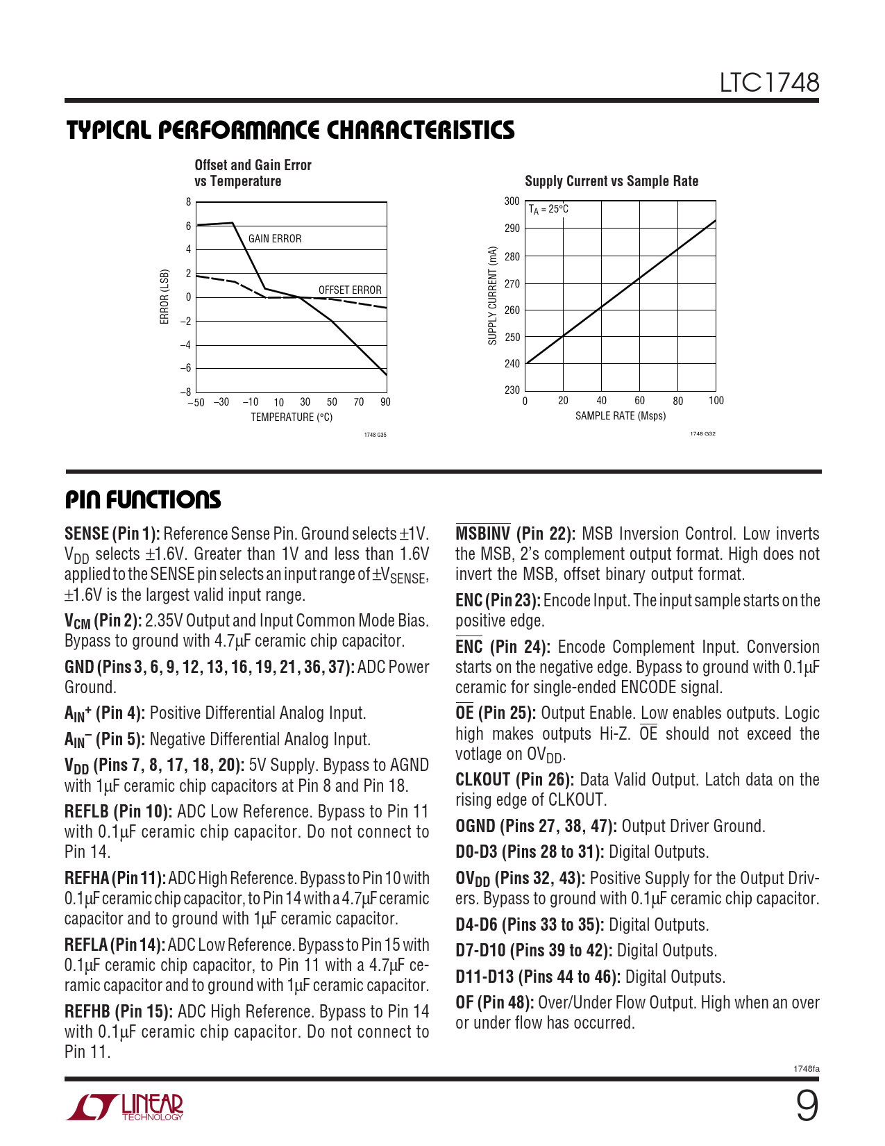 LTC1748 WUTYPICAL PERFOR A CE CHARACTERISTICSOffset and Gain Error vs TemperatureSupply Current vs Sample Rate 8 300 TA = 25°C 6 290 GAIN ERROR 4 280 2 270 OFFSET ERROR 0 260 ERROR (LSB) –2 250 SUPPLY CURRENT (mA) –4 240 –6 230 –8 – 50 –30 –10 10 30 50 70 90 0 20 40 60 80 100 TEMPERATURE (°C) SAMPLE RATE (Msps) 1748 G32 1748 G35 UUUPI FU CTIO SSENSE (Pin 1): Reference Sense Pin. Ground selects ±1V. MSBINV (Pin 22): MSB Inversion Control. Low inverts VDD selects ±1.6V. Greater than 1V and less than 1.6V the MSB, 2’s complement output format. High does not applied to the SENSE pin selects an input range of ±VSENSE, invert the MSB, offset binary output format. ±1.6V is the largest valid input range. ENC (Pin 23): Encode Input. The input sample starts on the VCM (Pin 2): 2.35V Output and Input Common Mode Bias. positive edge. Bypass to ground with 4.7µF ceramic chip capacitor. ENC (Pin 24): Encode Complement Input. Conversion GND (Pins 3, 6, 9, 12, 13, 16, 19, 21, 36, 37): ADC Power starts on the negative edge. Bypass to ground with 0.1µF Ground. ceramic for single-ended ENCODE signal. A +IN (Pin 4): Positive Differential Analog Input. OE (Pin 25): Output Enable. Low enables outputs. Logic A – high makes outputs Hi-Z. OE should not exceed the IN (Pin 5): Negative Differential Analog Input. votlage on OV V DD. DD (Pins 7, 8, 17, 18, 20): 5V Supply. Bypass to AGND with 1µF ceramic chip capacitors at Pin 8 and Pin 18. CLKOUT (Pin 26): Data Valid Output. Latch data on the rising edge of CLKOUT. REFLB (Pin 10): ADC Low Reference. Bypass to Pin 11 with 0.1µF ceramic chip capacitor. Do not connect to OGND (Pins 27, 38, 47): Output Driver Ground. Pin␣ 14. D0-D3 (Pins 28 to 31): Digital Outputs. REFHA (Pin 11): ADC High Reference. Bypass to Pin 10 with OVDD (Pins 32, 43): Positive Supply for the Output Driv- 0.1µF ceramic chip capacitor, to Pin 14 with a 4.7µF ceramic ers. Bypass to ground with 0.1µF ceramic chip capacitor. capacitor and to ground with 1µF ceramic capacitor. D4-D6 (Pins 33 to 35): Digital Outputs. REFLA (Pin 14): ADC Low Reference. Bypass to Pin 15 with D7-D10 (Pins 39 to 42): Digital Outputs. 0.1µF ceramic chip capacitor, to Pin 11 with a 4.7µF ce- D11-D13 (Pins 44 to 46): Digital Outputs. ramic capacitor and to ground with 1µF ceramic capacitor. OF (Pin 48): Over/Under Flow Output. High when an over REFHB (Pin 15): ADC High Reference. Bypass to Pin 14 or under flow has occurred. with 0.1µF ceramic chip capacitor. Do not connect to Pin␣ 11. 1748fa 9