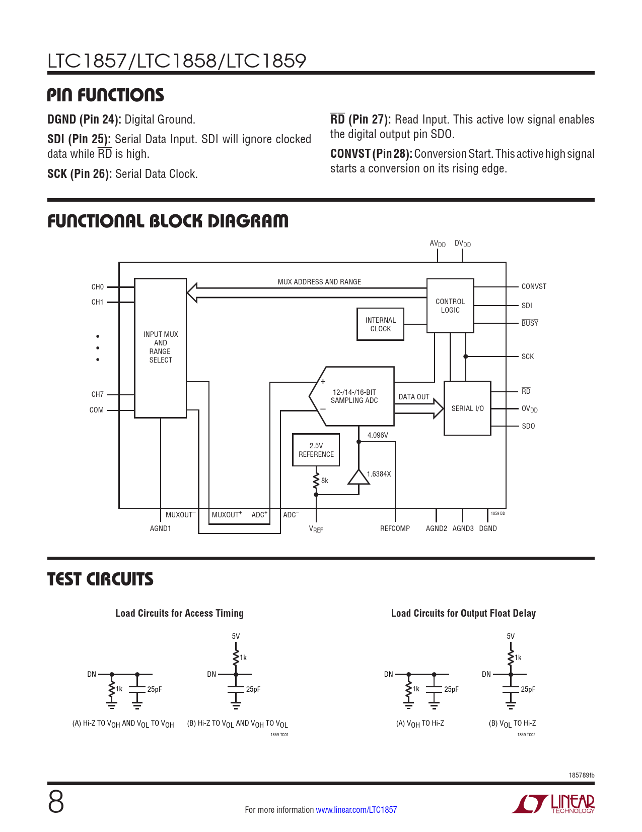 PIN FUNCTIONS DGND (Pin 24): RD (Pin 27): SDI (Pin 25): CONVST (Pin 28): SCK (Pin 26): FUNCTIONAL BLOCK DIAGRAM TEST CIRCUITS