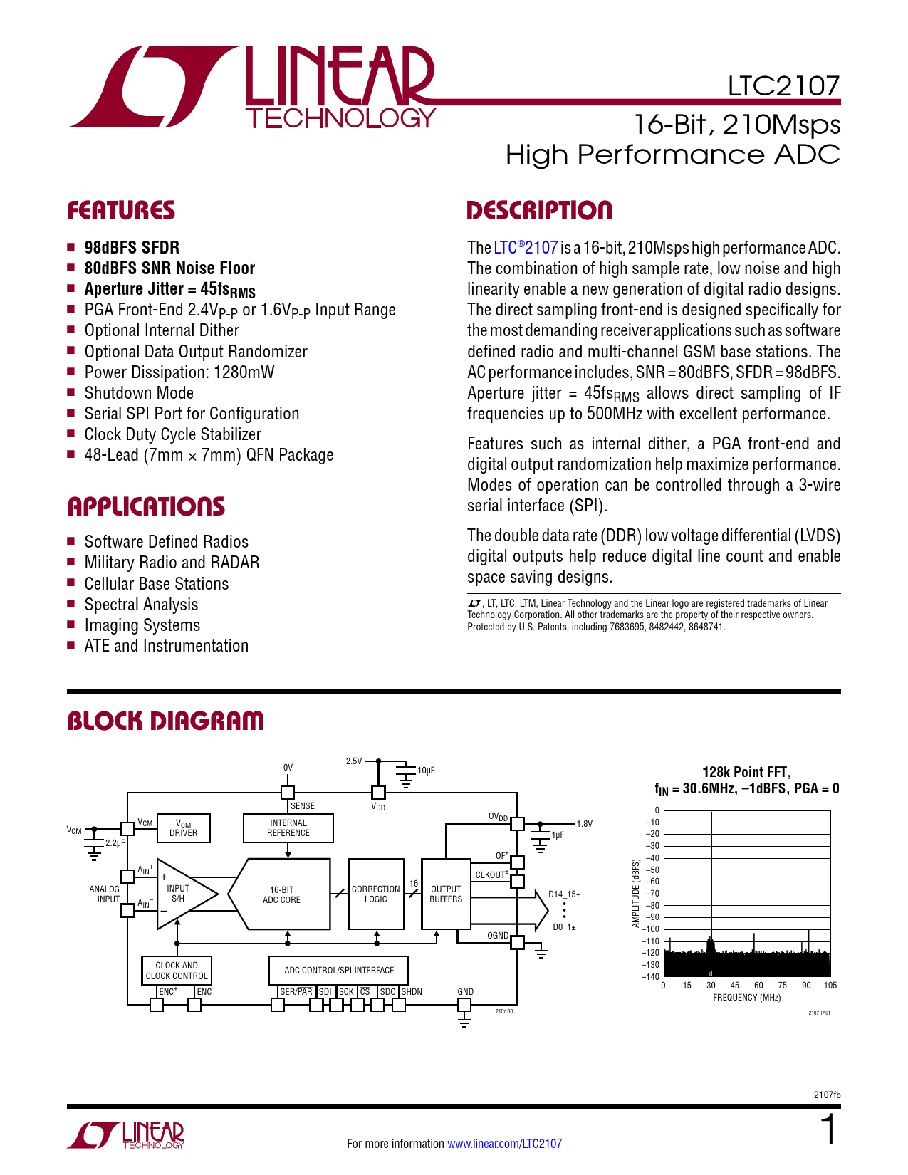 LTC2107 16-Bit, 210Msps High Performance ADC FeaturesDescription n 98dBFS SFDR The LTC®2107 is a 16-bit, 210Msps high performance ADC. n 80dBFS SNR Noise Floor The combination of high sample rate, low noise and high n Aperture Jitter = 45fsRMS linearity enable a new generation of digital radio designs. n PGA Front-End 2.4VP-P or 1.6VP-P Input Range The direct sampling front-end is designed specifically for n Optional Internal Dither the most demanding receiver applications such as software n Optional Data Output Randomizer defined radio and multi-channel GSM base stations. The n Power Dissipation: 1280mW AC performance includes, SNR = 80dBFS, SFDR = 98dBFS. n Shutdown Mode Aperture jitter = 45fsRMS allows direct sampling of IF n Serial SPI Port for Configuration frequencies up to 500MHz with excellent performance. n Clock Duty Cycle Stabilizer Features such as internal dither, a PGA front-end and n 48-Lead (7mm × 7mm) QFN Package digital output randomization help maximize performance. Modes of operation can be controlled through a 3-wire applications serial interface (SPI). n The double data rate (DDR) low voltage differential (LVDS) Software Defined Radios n digital outputs help reduce digital line count and enable Military Radio and RADAR n space saving designs. Cellular Base Stations n Spectral Analysis L, LT, LTC, LTM, Linear Technology and the Linear logo are registered trademarks of Linear Technology Corporation. All other trademarks are the property of their respective owners. n Imaging Systems Protected by U.S. Patents, including 7683695, 8482442, 8648741. n ATE and Instrumentation Block Diagram 2.5V 0V 10µF 128k Point FFT,fIN = 30.6MHz, –1dBFS, PGA = 0 SENSE VDD 0 V OVDD CM VCM INTERNAL 1.8V –10 VCM DRIVER REFERENCE 1µF –20 2.2µF –30 OF± –40 A + IN + CLKOUT± –50 –60 ANALOG INPUT 16 16-BIT CORRECTION OUTPUT –70 INPUT – S/H D14_15± ADC CORE LOGIC BUFFERS AIN – • • –80 • –90 D0_1± AMPLITUDE (dBFS) –100 OGND –110 –120 CLOCK AND –130 ADC CONTROL/SPI INTERFACE CLOCK CONTROL –140 0 15 30 45 60 75 90 105 ENC+ ENC– SER/PAR SDI SCK CS SDO SHDN GND FREQUENCY (MHz) 2107 BD 2107 TA01 2107fb For more information www.linear.com/LTC2107 1 Document Outline Features Applications Description Block Diagram Absolute Maximum Ratings Pin Configuration Order Information Converter Characteristics Analog Input Dynamic Accuracy VCM Output Digital Inputs and OUtputs Power Requirements Timing Characteristics Timing Diagrams Typical Performance Characteristics Pin Functions Block Diagram Applications Information Package Description Typical Application Related Parts