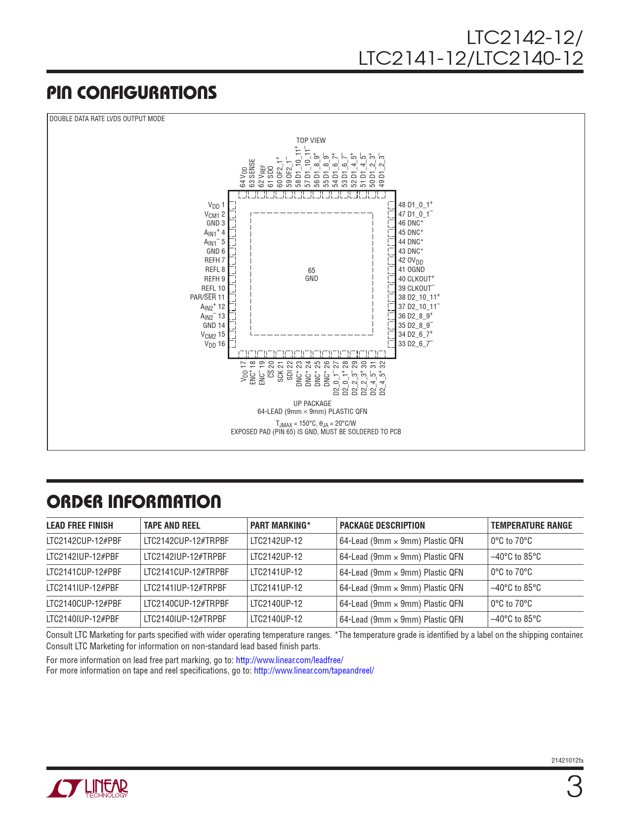 LTC2142CUP-12#PBF LTC2142CUP-12#TRPBF LTC2142UP-12 64-Lead (9mm × 9mm) Plastic QFN 0°C to 70°C LTC2142IUP-12#PBF LTC2142IUP-12#TRPBF LTC2142UP-12 64-Lead (9mm × 9mm) Plastic QFN –40°C to 85°C LTC2141CUP-12#PBF LTC2141CUP-12#TRPBF LTC2141UP-12 64-Lead (9mm × 9mm) Plastic QFN 0°C to 70°C LTC2141IUP-12#PBF LTC2141IUP-12#TRPBF LTC2141UP-12 64-Lead (9mm × 9mm) Plastic QFN –40°C to 85°C LTC2140CUP-12#PBF LTC2140CUP-12#TRPBF LTC2140UP-12 64-Lead (9mm × 9mm) Plastic QFN 0°C to 70°C LTC2140IUP-12#PBF LTC2140IUP-12#TRPBF LTC2140UP-12 64-Lead (9mm × 9mm) Plastic QFN –40°C to 85°C Consult LTC Marketing for parts specified with wider operating temperature ranges. *The temperature grade is identified by a label on the shipping container. Consult LTC Marketing for information on non-standard lead based finish parts. For more information on lead free part marking, go to: http://www.linear.com/leadfree/ For more information on tape and reel specifications, go to: http://www.linear.com/tapeandreel/ 21421012fa 3
