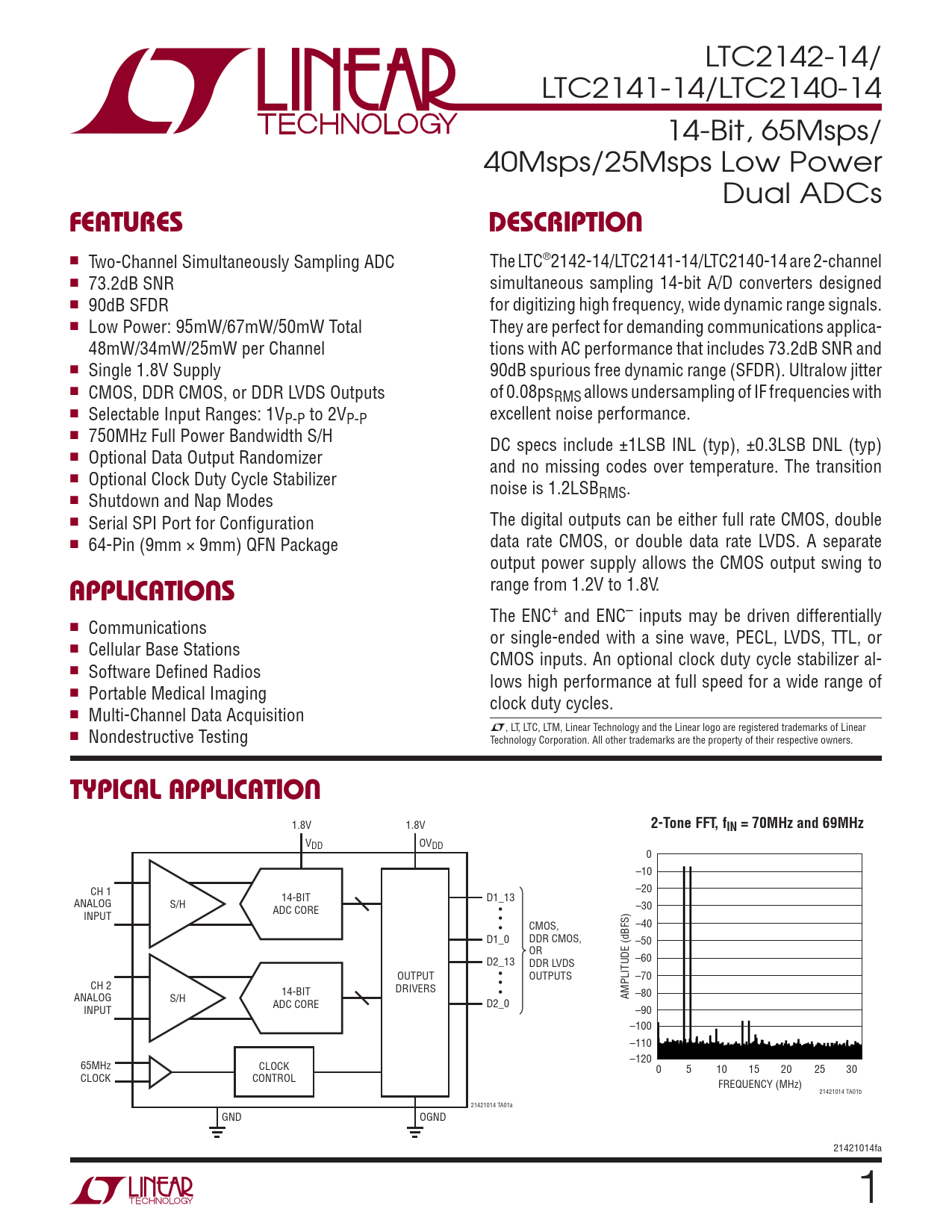 LTC2142-14/ LTC2141-14/LTC2140-14 14-Bit, 65Msps/ 40Msps/25Msps Low Power Dual ADCs FEATURESDESCRIPTION n Two-Channel Simultaneously Sampling ADC The LTC®2142-14/LTC2141-14/LTC2140-14 are 2-channel n 73.2dB SNR simultaneous sampling 14-bit A/D converters designed n 90dB SFDR for digitizing high frequency, wide dynamic range signals. n Low Power: 95mW/67mW/50mW Total They are perfect for demanding communications applica- 48mW/34mW/25mW per Channel tions with AC performance that includes 73.2dB SNR and n Single 1.8V Supply 90dB spurious free dynamic range (SFDR). Ultralow jitter n CMOS, DDR CMOS, or DDR LVDS Outputs of 0.08psRMS allows undersampling of IF frequencies with n Selectable Input Ranges: 1VP-P to 2VP-P excellent noise performance. n 750MHz Full Power Bandwidth S/H DC specs include ±1LSB INL (typ), ±0.3LSB DNL (typ) n Optional Data Output Randomizer and no missing codes over temperature. The transition n Optional Clock Duty Cycle Stabilizer noise is 1.2LSB n Shutdown and Nap Modes RMS. n Serial SPI Port for Configuration The digital outputs can be either full rate CMOS, double n 64-Pin (9mm × 9mm) QFN Package data rate CMOS, or double data rate LVDS. A separate output power supply allows the CMOS output swing to APPLICATIONS range from 1.2V to 1.8V. The ENC+ and ENC– inputs may be driven differentially n Communications or single-ended with a sine wave, PECL, LVDS, TTL, or n Cellular Base Stations CMOS inputs. An optional clock duty cycle stabilizer al- n Software Defined Radios lows high performance at full speed for a wide range of n Portable Medical Imaging clock duty cycles. n Multi-Channel Data Acquisition L, LT, LTC, LTM, Linear Technology and the Linear logo are registered trademarks of Linear n Nondestructive Testing Technology Corporation. All other trademarks are the property of their respective owners. TYPICAL APPLICATION 1.8V 1.8V 2-Tone FFT, fIN = 70MHz and 69MHz VDD OVDD 0 –10 CH 1 –20 14-BIT D1_13 ANALOG S/H ADC CORE t –30 INPUT t CMOS, t –40 D1_0 DDR CMOS, –50 OR D2_13 DDR LVDS –60 OUTPUT t OUTPUTS –70 CH 2 t DRIVERS 14-BIT t ANALOG S/H AMPLITUDE (dBFS) –80 ADC CORE D2_0 INPUT –90 –100 –110 –120 65MHz CLOCK 0 5 10 15 20 25 30 CLOCK CONTROL FREQUENCY (MHz) 21421014 TA01b 21421014 TA01a GND OGND 21421014fa 1