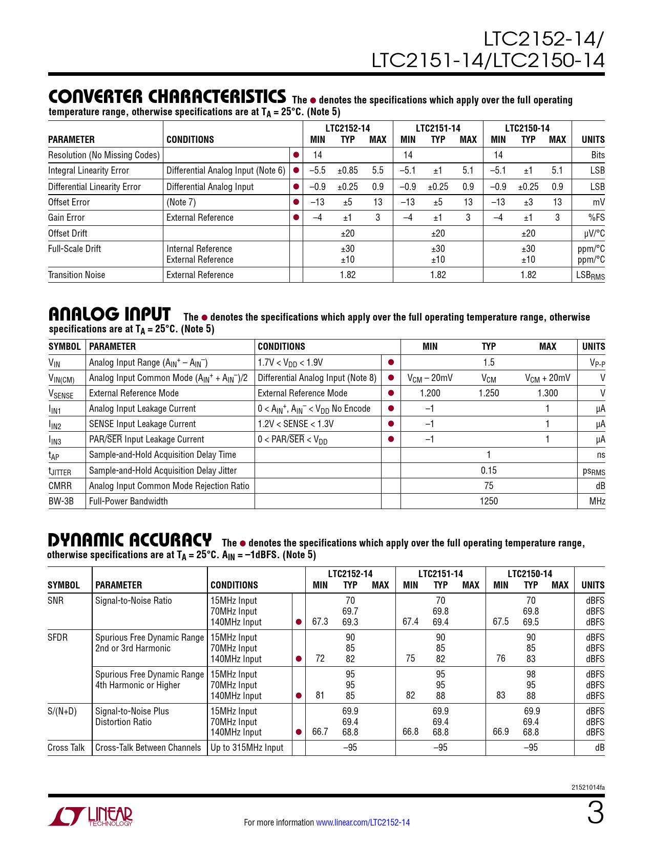 LTC2152-14/ LTC2151-14/LTC2150-14 CONVERTERCHARACTERISTICS The l denotes the specifications which apply over the full operatingtemperature range, otherwise specifications are at TA = 25°C. (Note 5)LTC2152-14LTC2151-14LTC2150-14PARAMETERCONDITIONSMINTYPMAXMINTYPMAXMINTYPMAXUNITS Resolution (No Missing Codes) l 14 14 14 Bits Integral Linearity Error Differential Analog Input (Note 6) l –5.5 ±0.85 5.5 –5.1 ±1 5.1 –5.1 ±1 5.1 LSB Differential Linearity Error Differential Analog Input l –0.9 ±0.25 0.9 –0.9 ±0.25 0.9 –0.9 ±0.25 0.9 LSB Offset Error (Note 7) l –13 ±5 13 –13 ±5 13 –13 ±3 13 mV Gain Error External Reference l –4 ±1 3 –4 ±1 3 –4 ±1 3 %FS Offset Drift ±20 ±20 ±20 µV/°C Full-Scale Drift Internal Reference ±30 ±30 ±30 ppm/°C External Reference ±10 ±10 ±10 ppm/°C Transition Noise External Reference 1.82 1.82 1.82 LSBRMS ANALOGINPUT The l denotes the specifications which apply over the full operating temperature range, otherwisespecifications are at TA = 25°C. (Note 5)SYMBOL PARAMETERCONDITIONSMINTYPMAXUNITS V + – IN Analog Input Range (AIN – AIN ) 1.7V < VDD < 1.9V l 1.5 VP-P V + – IN(CM) Analog Input Common Mode (AIN + AIN )/2 Differential Analog Input (Note 8) l VCM – 20mV VCM VCM + 20mV V VSENSE External Reference Mode External Reference Mode l 1.200 1.250 1.300 V I + – IN1 Analog Input Leakage Current 0 < AIN , AIN < VDD No Encode l –1 1 µA IIN2 SENSE Input Leakage Current 1.2V < SENSE < 1.3V l –1 1 µA IIN3 PAR/SER Input Leakage Current 0 < PAR/SER < VDD l –1 1 µA tAP Sample-and-Hold Acquisition Delay Time 1 ns tJITTER Sample-and-Hold Acquisition Delay Jitter 0.15 psRMS CMRR Analog Input Common Mode Rejection Ratio 75 dB BW-3B Full-Power Bandwidth 1250 MHz DYNAMICACCURACY The l denotes the specifications which apply over the full operating temperature range,otherwise specifications are at TA = 25°C. AIN = –1dBFS. (Note 5)LTC2152-14LTC2151-14LTC2150-14SYMBOLPARAMETERCONDITIONSMINTYPMAXMINTYPMAXMINTYPMAXUNITS SNR Signal-to-Noise Ratio 15MHz Input 70 70 70 dBFS 70MHz Input 69.7 69.8 69.8 dBFS 140MHz Input l 67.3 69.3 67.4 69.4 67.5 69.5 dBFS SFDR Spurious Free Dynamic Range 15MHz Input 90 90 90 dBFS 2nd or 3rd Harmonic 70MHz Input 85 85 85 dBFS 140MHz Input l 72 82 75 82 76 83 dBFS Spurious Free Dynamic Range 15MHz Input 95 95 98 dBFS 4th Harmonic or Higher 70MHz Input 95 95 95 dBFS 140MHz Input l 81 85 82 88 83 88 dBFS S/(N+D) Signal-to-Noise Plus 15MHz Input 69.9 69.9 69.9 dBFS Distortion Ratio 70MHz Input 69.4 69.4 69.4 dBFS 140MHz Input l 66.7 68.8 66.8 68.8 66.9 68.8 dBFS Cross Talk Cross-Talk Between Channels Up to 315MHz Input –95 –95 –95 dB 21521014fa For more information www.linear.com/LTC2152-14 3 Document Outline Features Applications Description Typical Application Absolute Maximum Ratings Pin Configuration Order Information Converter Characteristics Analog Input Dynamic Accuracy Internal Reference Characteristics Power Requirements Digital Inputs And Outputs Timing Characteristics Typical Performance Characteristics Pin Functions Functional Block Diagram Timing Diagrams Applications Information Typical Applications Package Description Typical Application Related Parts
