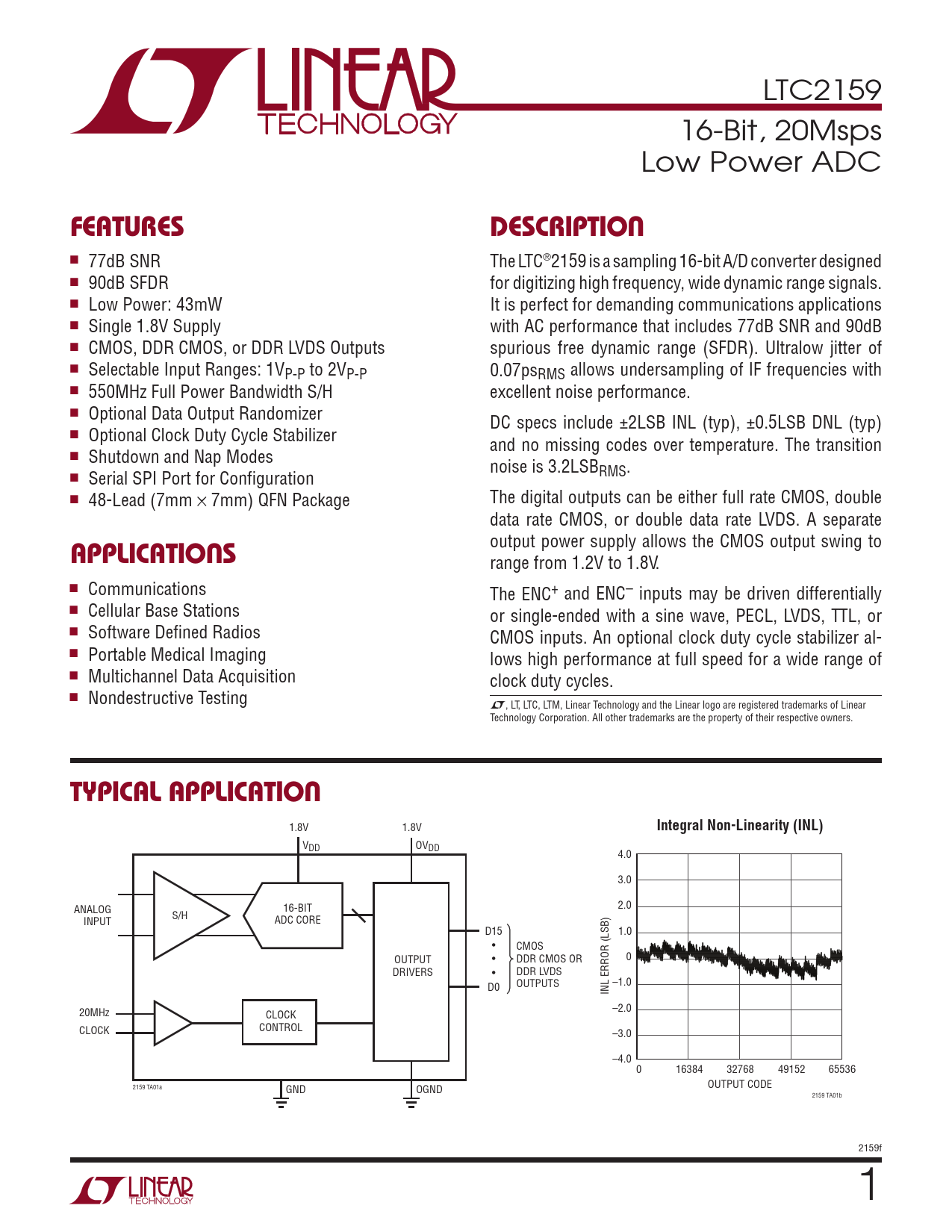 LTC2159 16-Bit, 20Msps Low Power ADC FeaTuresDescripTion n 77dB SNR The LTC®2159 is a sampling 16-bit A/D converter designed n 90dB SFDR for digitizing high frequency, wide dynamic range signals. n Low Power: 43mW It is perfect for demanding communications applications n Single 1.8V Supply with AC performance that includes 77dB SNR and 90dB n CMOS, DDR CMOS, or DDR LVDS Outputs spurious free dynamic range (SFDR). Ultralow jitter of n Selectable Input Ranges: 1VP-P to 2VP-P 0.07psRMS allows undersampling of IF frequencies with n 550MHz Full Power Bandwidth S/H excellent noise performance. n Optional Data Output Randomizer DC specs include ±2LSB INL (typ), ±0.5LSB DNL (typ) n Optional Clock Duty Cycle Stabilizer and no missing codes over temperature. The transition n Shutdown and Nap Modes noise is 3.2LSBRMS. n Serial SPI Port for Configuration n 48-Lead (7mm × 7mm) QFN Package The digital outputs can be either full rate CMOS, double data rate CMOS, or double data rate LVDS. A separate output power supply allows the CMOS output swing to applicaTions range from 1.2V to 1.8V. n Communications The ENC+ and ENC– inputs may be driven differentially n Cellular Base Stations or single-ended with a sine wave, PECL, LVDS, TTL, or n Software Defined Radios CMOS inputs. An optional clock duty cycle stabilizer al- n Portable Medical Imaging lows high performance at full speed for a wide range of n Multichannel Data Acquisition clock duty cycles. n Nondestructive Testing L, LT, LTC, LTM, Linear Technology and the Linear logo are registered trademarks of Linear Technology Corporation. All other trademarks are the property of their respective owners. Typical applicaTion 1.8V 1.8V Integral Non-Linearity (INL) VDD OVDD 4.0 3.0 ANALOG 16-BIT 2.0 S/H INPUT ADC CORE D15 1.0 • CMOS OUTPUT • DDR CMOS OR 0 DRIVERS • DDR LVDS D0 OUTPUTS –1.0 INL ERROR (LSB) 20MHz –2.0 CLOCK CONTROL CLOCK –3.0 –4.0 0 16384 32768 49152 65536 2159 TA01a GND OGND OUTPUT CODE 2159 TA01b 2159f 1 Document Outline Features Applications Description Typical Application Absolute Maximum Ratings Pin Configuration Order Information Converter Characteristics Analog Input Dynamic Accuracy Internal Reference Characteristics Digital Inputs and Outputs Power Requirements Timing Characteristics Electrical Characteristics Timing Diagrams Typical Performance Characteristics Pin Functions Functional Block Diagram Applications Information Typical Applications Package Description Typical Application Related Parts