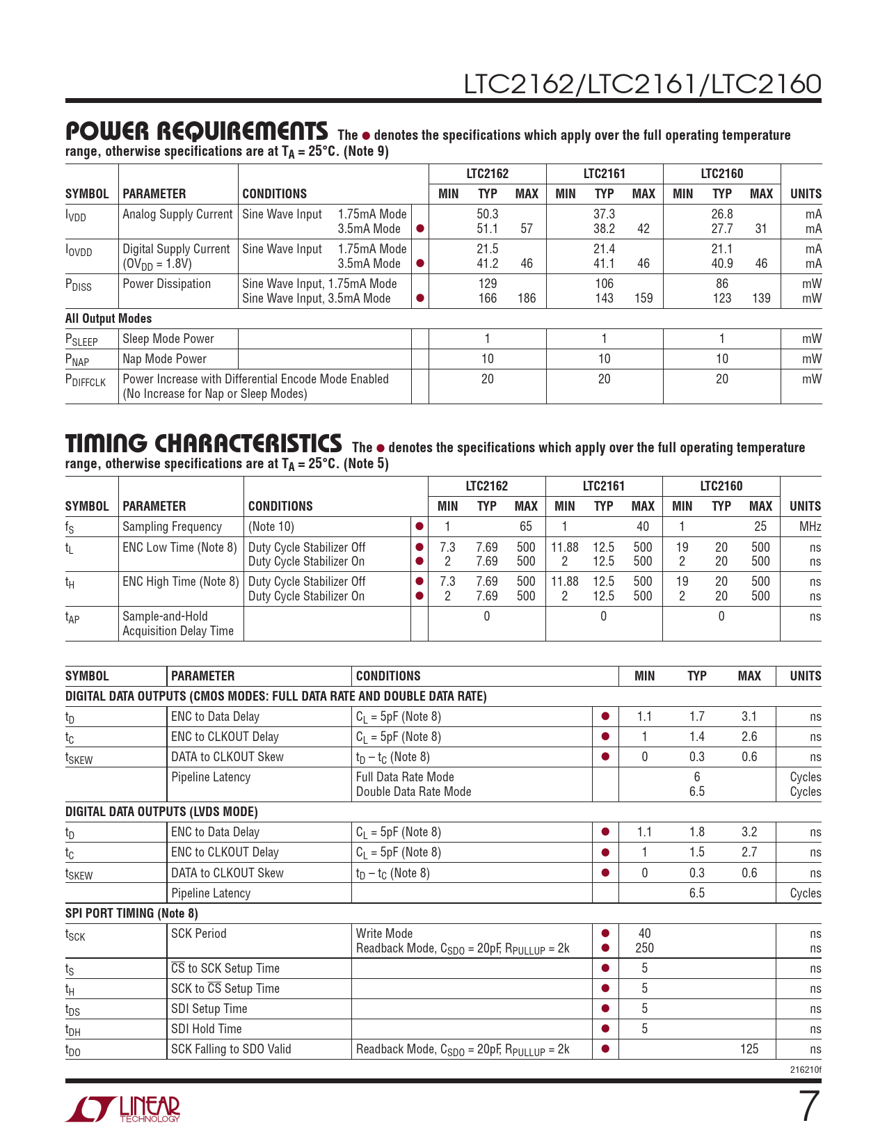 LTC2162/LTC2161/LTC2160 power requireMenTsThe l denotes the specifications which apply over the full operating temperaturerange, otherwise specifications are at TA = 25°C. (Note 9)LTC2162LTC2161LTC2160SYMBOL PARAMETERCONDITIONSMINTYPMAXMINTYPMAXMINTYPMAXUNITS IVDD Analog Supply Current Sine Wave Input 1.75mA Mode 50.3 37.3 26.8 mA 3.5mA Mode l 51.1 57 38.2 42 27.7 31 mA IOVDD Digital Supply Current Sine Wave Input 1.75mA Mode 21.5 21.4 21.1 mA (OVDD = 1.8V) 3.5mA Mode l 41.2 46 41.1 46 40.9 46 mA PDISS Power Dissipation Sine Wave Input, 1.75mA Mode 129 106 86 mW Sine Wave Input, 3.5mA Mode l 166 186 143 159 123 139 mW All Output Modes PSLEEP Sleep Mode Power 1 1 1 mW PNAP Nap Mode Power 10 10 10 mW PDIFFCLK Power Increase with Differential Encode Mode Enabled 20 20 20 mW (No Increase for Nap or Sleep Modes) TiMing characTerisTicsThe l denotes the specifications which apply over the full operating temperaturerange, otherwise specifications are at TA = 25°C. (Note 5)LTC2162LTC2161LTC2160SYMBOL PARAMETERCONDITIONSMINTYPMAXMINTYPMAXMINTYPMAXUNITS fS Sampling Frequency (Note 10) l 1 65 1 40 1 25 MHz tL ENC Low Time (Note 8) Duty Cycle Stabilizer Off l 7.3 7.69 500 11.88 12.5 500 19 20 500 ns Duty Cycle Stabilizer On l 2 7.69 500 2 12.5 500 2 20 500 ns tH ENC High Time (Note 8) Duty Cycle Stabilizer Off l 7.3 7.69 500 11.88 12.5 500 19 20 500 ns Duty Cycle Stabilizer On l 2 7.69 500 2 12.5 500 2 20 500 ns tAP Sample-and-Hold 0 0 0 ns Acquisition Delay Time SYMBOLPARAMETERCONDITIONSMINTYPMAXUNITSDIGITAL DATA OUTPUTS (CMOS MODES: FULL DATA RATE AND DOUBLE DATA RATE) tD ENC to Data Delay CL = 5pF (Note 8) l 1.1 1.7 3.1 ns tC ENC to CLKOUT Delay CL = 5pF (Note 8) l 1 1.4 2.6 ns tSKEW DATA to CLKOUT Skew tD – tC (Note 8) l 0 0.3 0.6 ns Pipeline Latency Full Data Rate Mode 6 Cycles Double Data Rate Mode 6.5 Cycles DIGITAL DATA OUTPUTS (LVDS MODE) tD ENC to Data Delay CL = 5pF (Note 8) l 1.1 1.8 3.2 ns tC ENC to CLKOUT Delay CL = 5pF (Note 8) l 1 1.5 2.7 ns tSKEW DATA to CLKOUT Skew tD – tC (Note 8) l 0 0.3 0.6 ns Pipeline Latency 6.5 Cycles SPI PORT TIMING (Note 8) tSCK SCK Period Write Mode l 40 ns Readback Mode, CSDO = 20pF, RPULLUP = 2k l 250 ns tS CS to SCK Setup Time l 5 ns tH SCK to CS Setup Time l 5 ns tDS SDI Setup Time l 5 ns tDH SDI Hold Time l 5 ns tDO SCK Falling to SDO Valid Readback Mode, CSDO = 20pF, RPULLUP = 2k l 125 ns 216210f 7 Document Outline Features Applications Description Typical Application Absolute Maximum Ratings Pin Configuration Order Information Converter Characteristics Analog input Dynamic Accuracy Internal Reference Characteristics Digital Inputs and Outputs Power Requirements Timing Characteristics Electrical Characteristics Timing Diagrams Typical Performance Characteristics Pin Functions Functional Block Diagram Applications Information Typical Applications Package Description Typical Application Related Parts