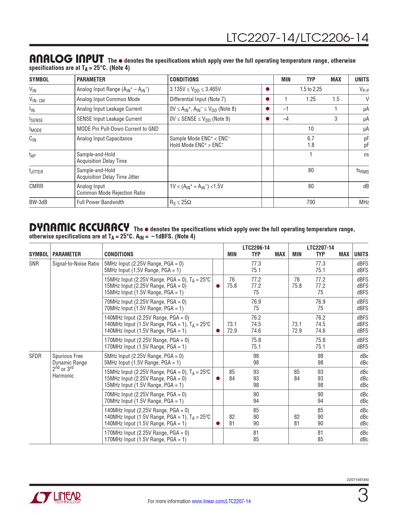 Datasheet LTC2207-14, LTC2206-14 (Analog Devices) - 3