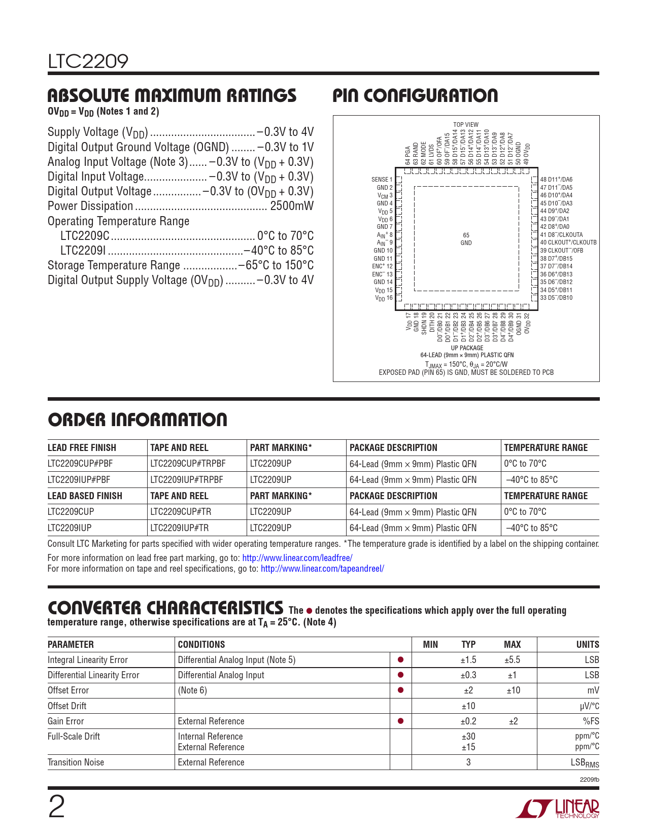 LTC2209CUP#PBF LTC2209CUP#TRPBF LTC2209UP 64-Lead (9mm × 9mm) Plastic QFN 0°C to 70°C LTC2209IUP#PBF LTC2209IUP#TRPBF LTC2209UP 64-Lead (9mm × 9mm) Plastic QFN –40°C to 85°C