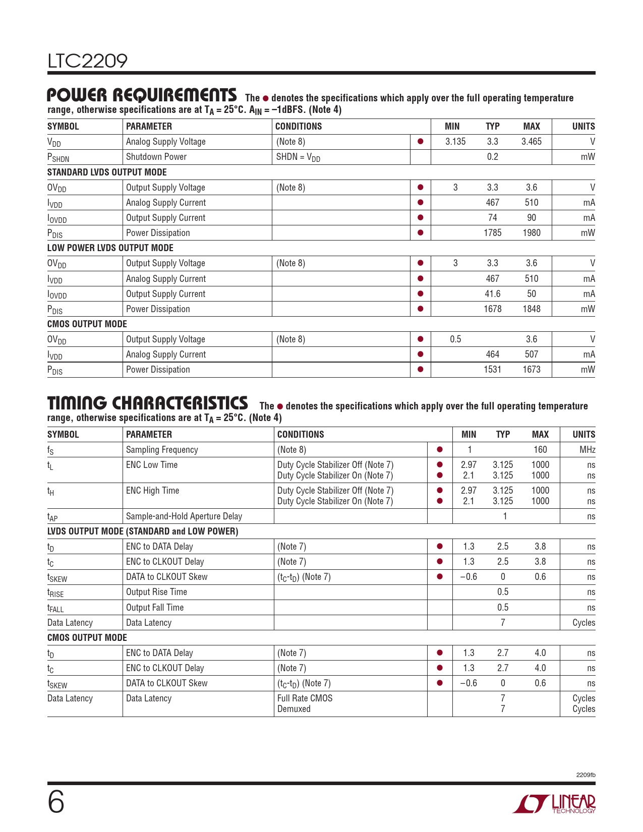tD ENC to DATA Delay (Note 7) l 1.3 2.7 4.0 ns tC ENC to CLKOUT Delay (Note 7) l 1.3 2.7 4.0 ns tSKEW DATA to CLKOUT Skew (tC-tD) (Note 7) l –0.6 0 0.6 ns Data Latency Data Latency Full Rate CMOS 7 Cycles Demuxed 7 Cycles 2209fb 6 Document Outline Features Applications Description Typical Application Absolute Maximum Ratings Pin Configuration Order Information Converter Characteristics Analog Input Dynamic Accuracy Common Mode Bias Characteristics Digital Inputs and Digital Outputs Power Requirements Timing Characteristics Electrical Characteristics Timing Diagram Typical Performance Characteristics Pin Functions Block Diagram Definitions Applications Information Package Description Revision History Related Parts
