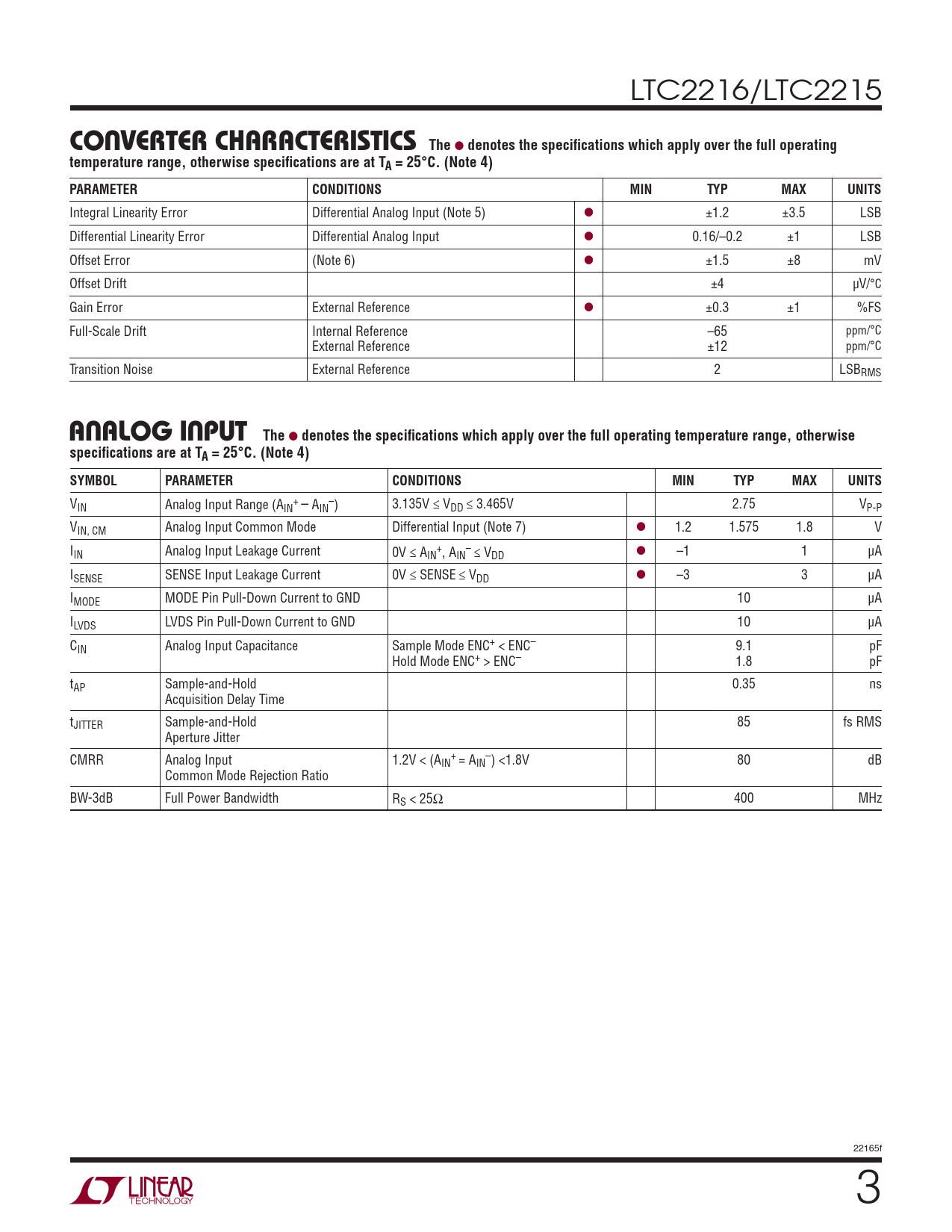 V + – IN Analog Input Range (AIN – AIN ) 3.135V ≤ VDD ≤ 3.465V 2.75 VP-P VIN, CM Analog Input Common Mode Differential Input (Note 7) l 1.2 1.575 1.8 V I + – IN Analog Input Leakage Current 0V ≤ A l IN , AIN ≤ VDD –1 1 μA ISENSE SENSE Input Leakage Current 0V ≤ SENSE ≤ VDD l –3 3 μA IMODE MODE Pin Pull-Down Current to GND 10 μA ILVDS LVDS Pin Pull-Down Current to GND 10 μA CIN Analog Input Capacitance Sample Mode ENC+ < ENC– 9.1 pF Hold Mode ENC+ > ENC– 1.8 pF tAP Sample-and-Hold 0.35 ns Acquisition Delay Time tJITTER Sample-and-Hold 85 fs RMS Aperture Jitter CMRR Analog Input 1.2V < (A + – IN = AIN ) <1.8V 80 dB Common Mode Rejection Ratio BW-3dB Full Power Bandwidth RS < 25Ω 400 MHz 22165f 3