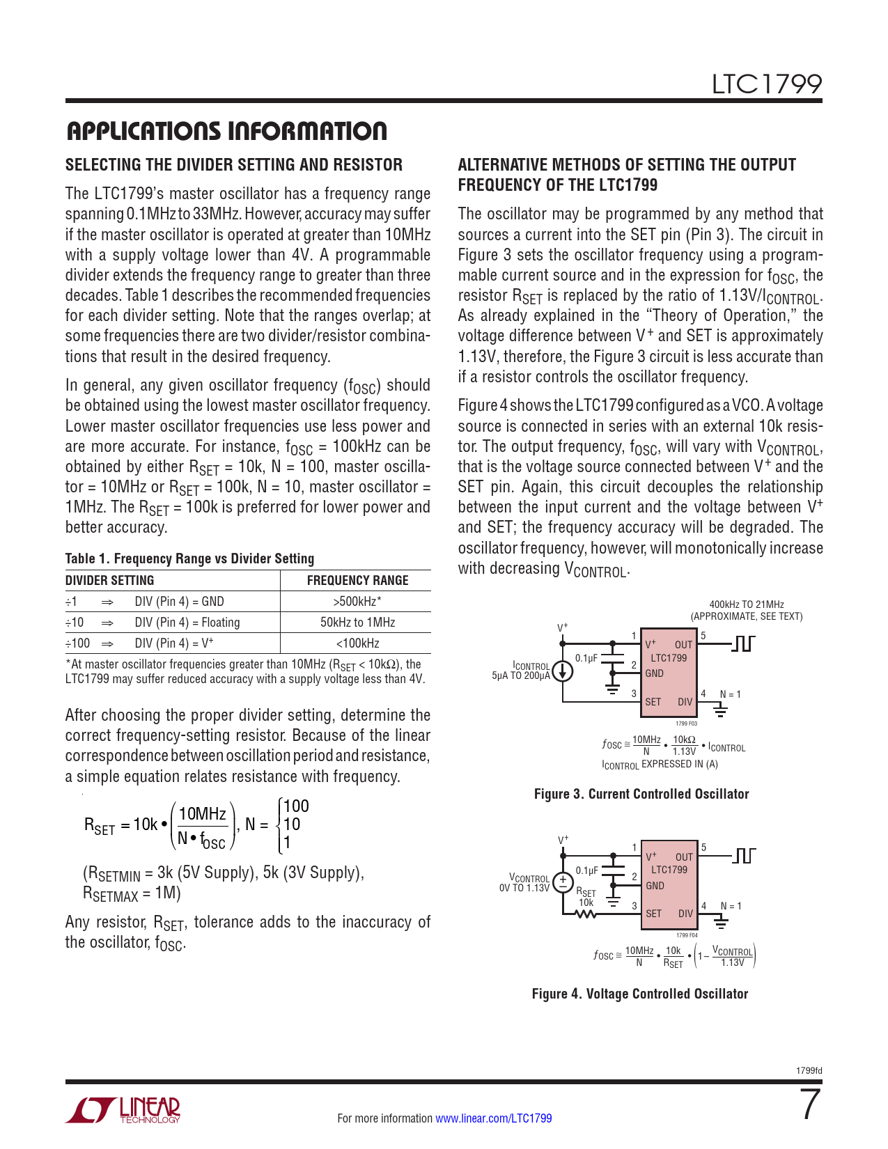 applicaTions inForMaTion SELECTING THE DIVIDER SETTING AND RESISTOR ALTERNATIVE METHODS OF SETTING THE OUTPUT FREqUENCY OF THE LTC1799