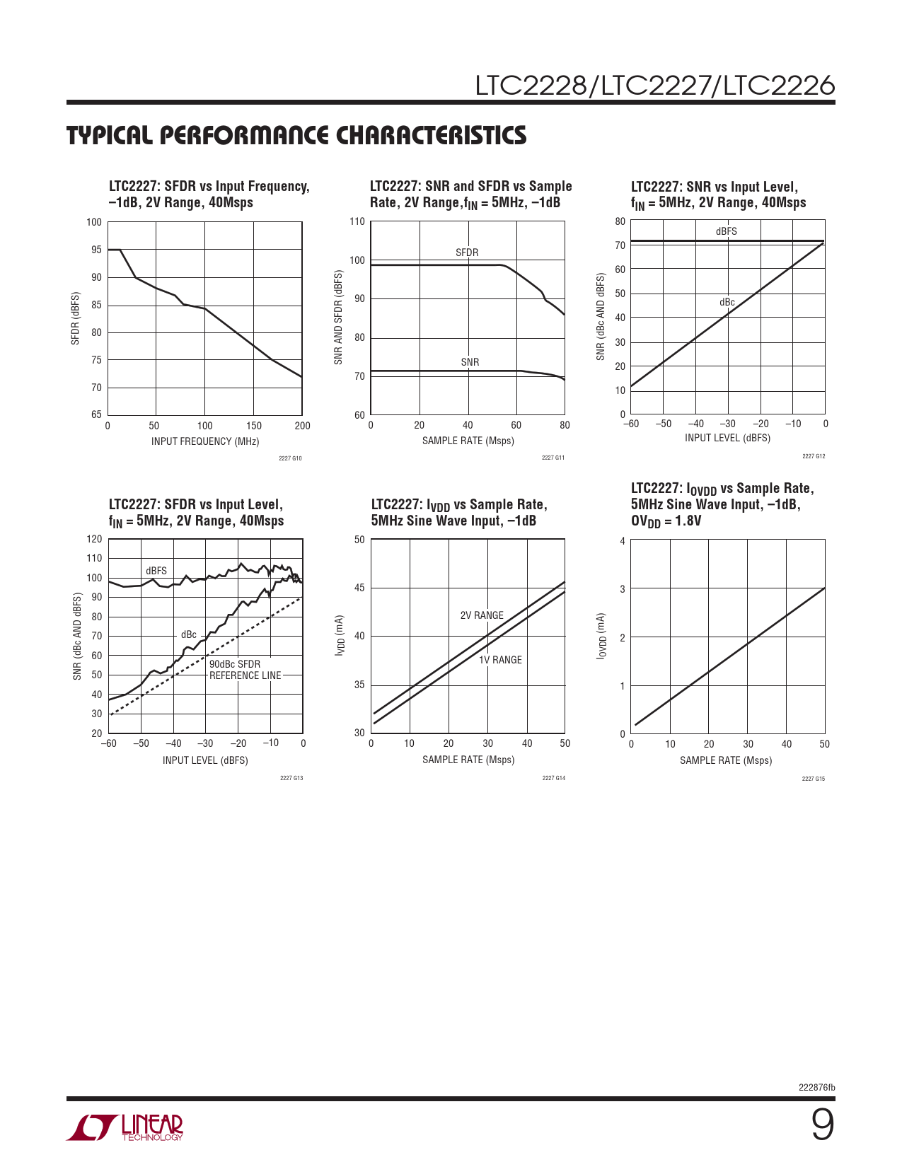 100 110 80 dBFS 95 70 SFDR 100 60 90 90 50 85 dBc 40 80 SFDR (dBFS) 80 30 75 SNR AND SFDR (dBFS) SNR (dBc AND dBFS) SNR 20 70 70 10 65 60 0 0 50 100 150 200 0 20 40 60 80 –60 –50 –40 –30 –20 –10 0 INPUT FREQUENCY (MHz) SAMPLE RATE (Msps) INPUT LEVEL (dBFS) 2227 G10 2227 G11 2227 G12