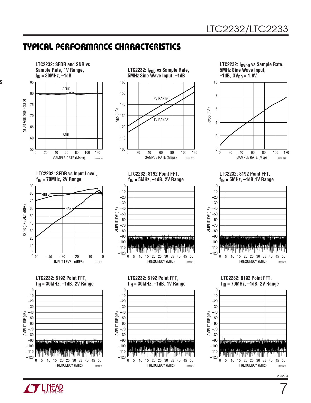 0 0 0 – 10 – 10 – 10 – 20 – 20 – 20 – 30 – 30 – 30 – 40 – 40 – 40 – 50 – 50 – 50 – 60 – 60 – 60 – 70 – 70 – 70 AMPLITUDE (dB) –80 AMPLITUDE (dB) –80 AMPLITUDE (dB) –80 – 90 – 90 – 90 – 100 – 100 – 100 – 110 – 110 – 110 – 120 – 120 – 120 0 5 10 15 20 25 30 35 40 45 50 0 5 10 15 20 25 30 35 40 45 50 0 5 10 15 20 25 30 35 40 45 50 FREQUENCY (MHz) 2232 G16 FREQUENCY (MHz) 2232 G17 FREQUENCY (MHz) 2232 G18 22323fa 7