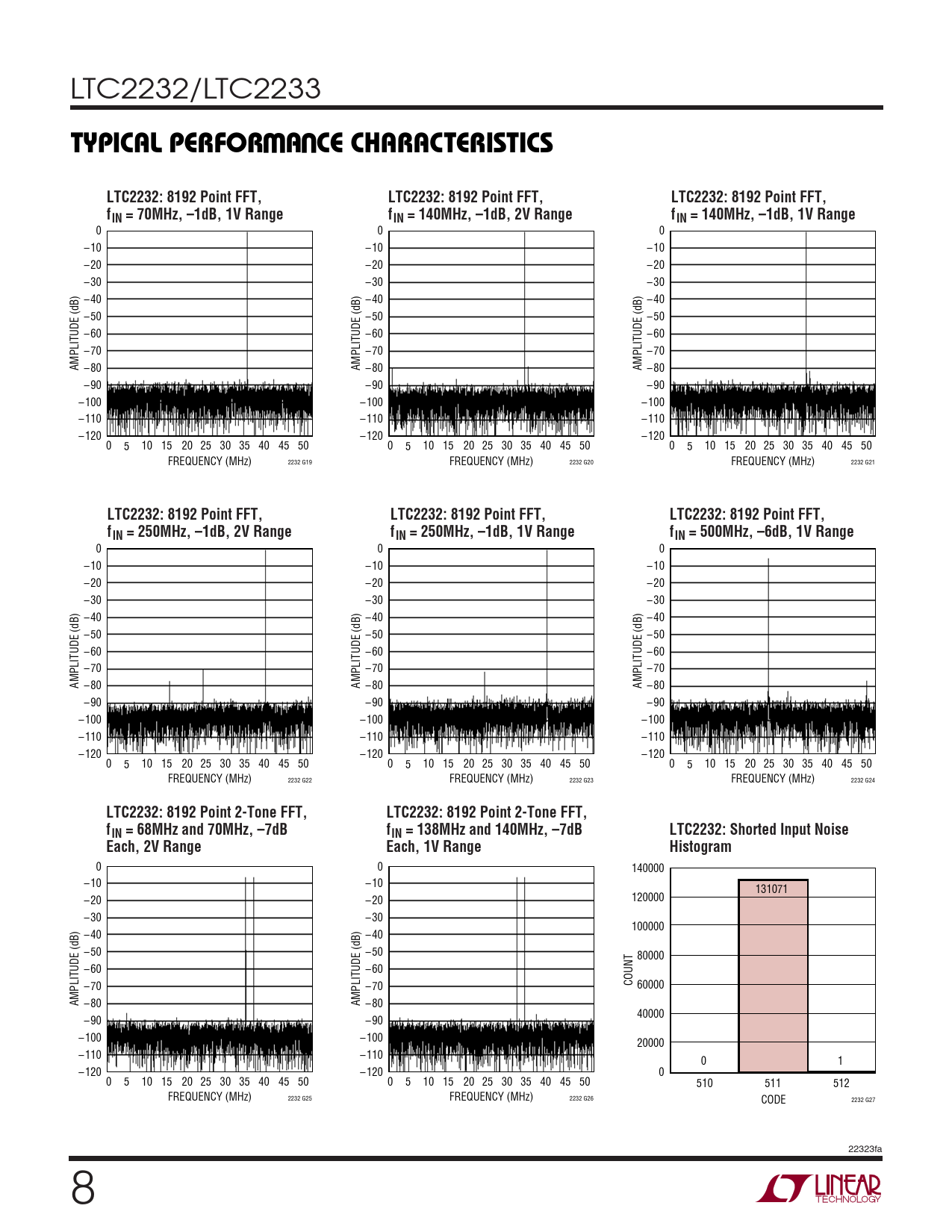0 0 140000 – 10 – 10 131071 – 20 – 20 120000 – 30 – 30 100000 – 40 – 40 – 50 – 50 80000 – 60 – 60 – 70 – 70 COUNT 60000 AMPLITUDE (dB) –80 AMPLITUDE (dB) –80 40000 – 90 – 90 – 100 – 100 20000 – 110 – 110 0 1 – 120 – 120 0 0 5 10 15 20 25 30 35 40 45 50 0 5 10 15 20 25 30 35 40 45 50 510 511 512 FREQUENCY (MHz) 2232 G25 FREQUENCY (MHz) 2232 G26 CODE 2232 G27 22323fa 8
