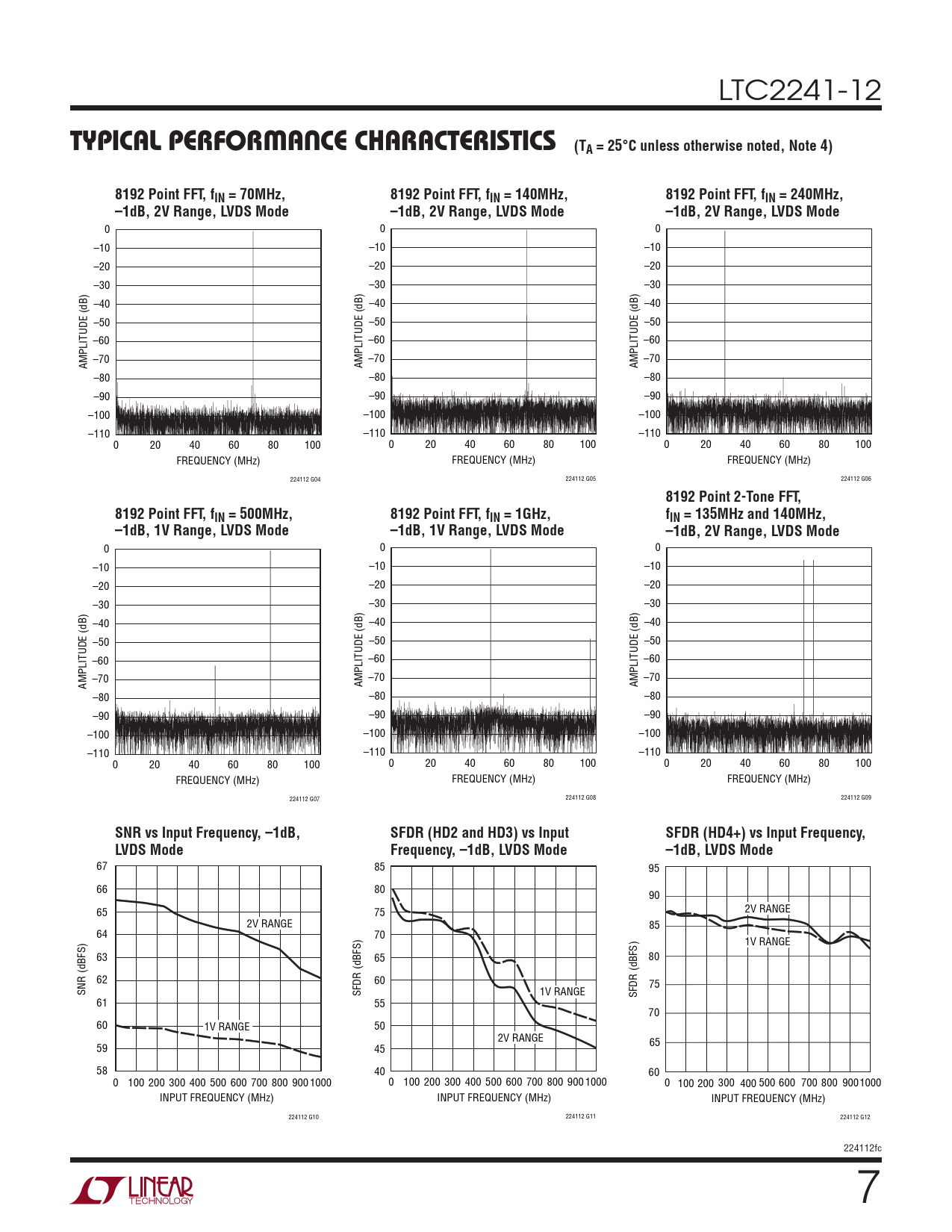 Typical perForMance characTerisTics (TA = 25°C unless otherwise noted, Note 4) 8192 Point FFT, fIN = 70MHz, 8192 Point FFT, fIN = 140MHz, 8192 Point FFT, fIN = 240MHz, –1dB, 2V Range, LVDS Mode –1dB, 2V Range, LVDS Mode –1dB, 2V Range, LVDS Mode