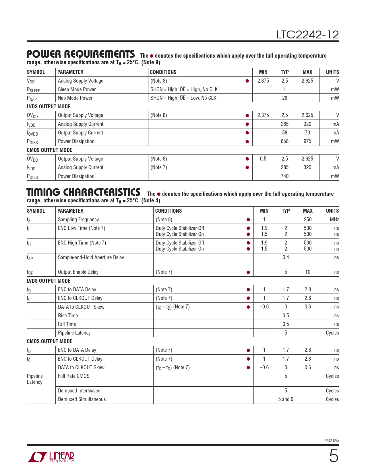 LTC2242-12 POWER REQUIREMENTS The ● denotes the specifi cations which apply over the full operating temperaturerange, otherwise specifi cations are at TA = 25°C. (Note 9)SYMBOLPARAMETERCONDITIONSMINTYPMAXUNITS V DD Analog Supply Voltage (Note 8) ● 2.375 2.5 2.625 V PSLEEP Sleep Mode Power SHDN = High, OE = High, No CLK 1 mW PNAP Nap Mode Power SHDN = High, OE = Low, No CLK 28 mW LVDS OUTPUT MODE OVDD Output Supply Voltage (Note 8) ● 2.375 2.5 2.625 V IVDD Analog Supply Current ● 285 320 mA IOVDD Output Supply Current ● 58 70 mA PDISS Power Dissipation ● 858 975 mW CMOS OUTPUT MODE OVDD Output Supply Voltage (Note 8) ● 0.5 2.5 2.625 V IVDD Analog Supply Current (Note 7) ● 285 320 mA PDISS Power Dissipation 740 mW TIMING CHARACTERISTICS The ● denotes the specifi cations which apply over the full operating temperaturerange, otherwise specifi cations are at TA = 25°C. (Note 4)SYMBOLPARAMETERCONDITIONSMINTYPMAXUNITS fS Sampling Frequency (Note 8) ● 1 250 MHz tL ENC Low Time (Note 7) Duty Cycle Stabilizer Off ● 1.9 2 500 ns Duty Cycle Stabilizer On ● 1.5 2 500 ns tH ENC High Time (Note 7) Duty Cycle Stabilizer Off ● 1.9 2 500 ns Duty Cycle Stabilizer On ● 1.5 2 500 ns tAP Sample-and-Hold Aperture Delay 0.4 ns tOE Output Enable Delay (Note 7) ● 5 10 ns LVDS OUTPUT MODE tD ENC to DATA Delay (Note 7) ● 1 1.7 2.8 ns tC ENC to CLKOUT Delay (Note 7) ● 1 1.7 2.8 ns DATA to CLKOUT Skew (tC – tD) (Note 7) ● –0.6 0 0.6 ns Rise Time 0.5 ns Fall Time 0.5 ns Pipeline Latency 5 Cycles CMOS OUTPUT MODE tD ENC to DATA Delay (Note 7) ● 1 1.7 2.8 ns tC ENC to CLKOUT Delay (Note 7) ● 1 1.7 2.8 ns DATA to CLKOUT Skew (tC – tD) (Note 7) ● –0.6 0 0.6 ns Pipeline Full Rate CMOS 5 Cycles Latency Demuxed Interleaved 5 Cycles Demuxed Simultaneous 5 and 6 Cycles 224212fc 5 Document Outline FEATURES DESCRIPTION APPLICATIONS TYPICAL APPLICATION ABSOLUTE MAXIMUM RATINGS PIN CONFIGURATION ORDER INFORMATION CONVERTER CHARACTERISTICS ANALOG INPUT DYNAMIC ACCURACY INTERNAL REFERENCE CHARACTERISTICS DIGITAL INPUTS AND DIGITAL OUTPUTS POWER REQUIREMENTS TIMING CHARACTERISTICS ELECTRICAL CHARACTERISTICS TYPICAL PERFORMANCE CHARACTERISTICS PIN FUNCTIONS FUNCTIONAL BLOCK DIAGRAM TIMING DIAGRAMS APPLICATIONS INFORMATION PACKAGE DESCRIPTION REVISION HISTORY RELATED PARTS