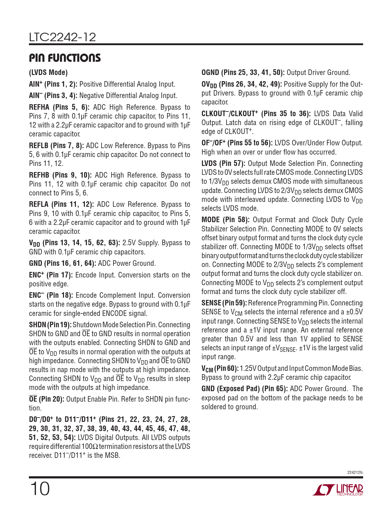 LTC2242-12 PIN FUNCTIONS(LVDS Mode)OGND (Pins 25, 33, 41, 50): Output Driver Ground. AIN+ (Pins 1, 2): Positive Differential Analog Input. OVDD (Pins 26, 34, 42, 49): Positive Supply for the Out- AIN– (Pins 3, 4): Negative Differential Analog Input. put Drivers. Bypass to ground with 0.1μF ceramic chip capacitor. REFHA (Pins 5, 6): ADC High Reference. Bypass to Pins 7, 8 with 0.1μF ceramic chip capacitor, to Pins 11, CLKOUT–/CLKOUT+ (Pins 35 to 36): LVDS Data Valid 12 with a 2.2μF ceramic capacitor and to ground with 1μF Output. Latch data on rising edge of CLKOUT–, falling ceramic capacitor. edge of CLKOUT+. REFLB (Pins 7, 8): ADC Low Reference. Bypass to Pins OF–/OF+ (Pins 55 to 56): LVDS Over/Under Flow Output. 5, 6 with 0.1μF ceramic chip capacitor. Do not connect to High when an over or under fl ow has occurred. Pins 11, 12. LVDS (Pin 57): Output Mode Selection Pin. Connecting REFHB (Pins 9, 10): ADC High Reference. Bypass to LVDS to 0V selects full rate CMOS mode. Connecting LVDS Pins 11, 12 with 0.1μF ceramic chip capacitor. Do not to 1/3VDD selects demux CMOS mode with simultaneous connect to Pins 5, 6. update. Connecting LVDS to 2/3VDD selects demux CMOS mode with interleaved update. Connecting LVDS to V REFLA (Pins 11, 12): ADC Low Reference. Bypass to DD selects LVDS mode. Pins 9, 10 with 0.1μF ceramic chip capacitor, to Pins 5, 6 with a 2.2μF ceramic capacitor and to ground with 1μF MODE (Pin 58): Output Format and Clock Duty Cycle ceramic capacitor. Stabilizer Selection Pin. Connecting MODE to 0V selects offset binary output format and turns the clock duty cycle VDD (Pins 13, 14, 15, 62, 63): 2.5V Supply. Bypass to stabilizer off. Connecting MODE to 1/3V GND with 0.1μF ceramic chip capacitors. DD selects offset binary output format and turns the clock duty cycle stabilizer GND (Pins 16, 61, 64): ADC Power Ground. on. Connecting MODE to 2/3VDD selects 2’s complement ENC+ (Pin 17): Encode Input. Conversion starts on the output format and turns the clock duty cycle stabilizer on. positive edge. Connecting MODE to VDD selects 2’s complement output format and turns the clock duty cycle stabilizer off. ENC– (Pin 18): Encode Complement Input. Conversion starts on the negative edge. Bypass to ground with 0.1μF SENSE (Pin 59): Reference Programming Pin. Connecting ceramic for single-ended ENCODE signal. SENSE to VCM selects the internal reference and a ±0.5V input range. Connecting SENSE to V SHDN (Pin 19): Shutdown Mode Selection Pin. Connecting DD selects the internal reference and a ±1V input range. An external reference SHDN to GND and OE to GND results in normal operation greater than 0.5V and less than 1V applied to SENSE with the outputs enabled. Connecting SHDN to GND and OE selects an input range of ±V to V SENSE. ±1V is the largest valid DD results in normal operation with the outputs at input range. high impedance. Connecting SHDN to VDD and OE to GND results in nap mode with the outputs at high impedance. VCM (Pin 60): 1.25V Output and Input Common Mode Bias. Connecting SHDN to V Bypass to ground with 2.2μF ceramic chip capacitor. DD and OE to VDD results in sleep mode with the outputs at high impedance. GND (Exposed Pad) (Pin 65): ADC Power Ground. The OE (Pin 20): Output Enable Pin. Refer to SHDN pin func- exposed pad on the bottom of the package needs to be tion. soldered to ground. D0–/D0+ to D11–/D11+ (Pins 21, 22, 23, 24, 27, 28, 29, 30, 31, 32, 37, 38, 39, 40, 43, 44, 45, 46, 47, 48, 51, 52, 53, 54): LVDS Digital Outputs. All LVDS outputs require differential 100Ω termination resistors at the LVDS receiver. D11–/D11+ is the MSB. 224212fc 10 Document Outline FEATURES DESCRIPTION APPLICATIONS TYPICAL APPLICATION ABSOLUTE MAXIMUM RATINGS PIN CONFIGURATION ORDER INFORMATION CONVERTER CHARACTERISTICS ANALOG INPUT DYNAMIC ACCURACY INTERNAL REFERENCE CHARACTERISTICS DIGITAL INPUTS AND DIGITAL OUTPUTS POWER REQUIREMENTS TIMING CHARACTERISTICS ELECTRICAL CHARACTERISTICS TYPICAL PERFORMANCE CHARACTERISTICS PIN FUNCTIONS FUNCTIONAL BLOCK DIAGRAM TIMING DIAGRAMS APPLICATIONS INFORMATION PACKAGE DESCRIPTION REVISION HISTORY RELATED PARTS