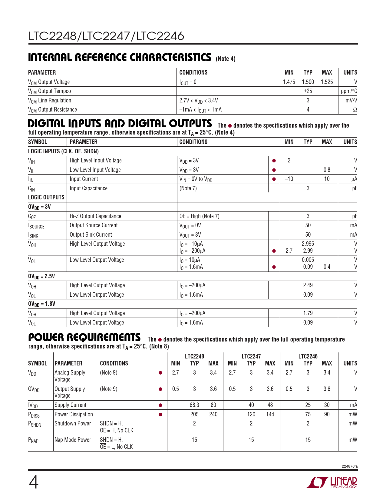 LTC2248/LTC2247/LTC2246 UUUI TER AL REFERE CE CHARACTERISTICS (Note 4)PARAMETERCONDITIONSMINTYPMAXUNITS VCM Output Voltage IOUT = 0 1.475 1.500 1.525 V VCM Output Tempco ±25 ppm/°C VCM Line Regulation 2.7V < VDD < 3.4V 3 mV/V VCM Output Resistance –1mA < I UU OUT < 1mA 4 Ω DIGITAL I PUTS A D DIGITAL OUTPUTS The ● denotes the specifications which apply over thefull operating temperature range, otherwise specifications are at TA = 25 ° C. (Note 4)SYMBOLPARAMETERCONDITIONSMINTYPMAXUNITSLOGIC INPUTS (CLK, OE, SHDN) VIH High Level Input Voltage VDD = 3V ● 2 V VIL Low Level Input Voltage VDD = 3V ● 0.8 V IIN Input Current VIN = 0V to VDD ● –10 10 µA CIN Input Capacitance (Note 7) 3 pF LOGIC OUTPUTSOVDD = 3V COZ Hi-Z Output Capacitance OE = High (Note 7) 3 pF ISOURCE Output Source Current VOUT = 0V 50 mA ISINK Output Sink Current VOUT = 3V 50 mA VOH High Level Output Voltage IO = –10µA 2.995 V IO = –200µA ● 2.7 2.99 V VOL Low Level Output Voltage IO = 10µA 0.005 V IO = 1.6mA ● 0.09 0.4 V OVDD = 2.5V VOH High Level Output Voltage IO = –200µA 2.49 V VOL Low Level Output Voltage IO = 1.6mA 0.09 V OVDD = 1.8V VOH High Level Output Voltage IO = –200µA 1.79 V VOL Low Level Output Voltage IO = 1.6mA 0.09 V WUPOWER REQUIRE E TS The ● denotes the specifications which apply over the full operating temperaturerange, otherwise specifications are at TA = 25 ° C. (Note 8)LTC2248LTC2247LTC2246SYMBOLPARAMETERCONDITIONSMINTYPMAXMINTYPMAXMINTYPMAXUNITS VDD Analog Supply (Note 9) ● 2.7 3 3.4 2.7 3 3.4 2.7 3 3.4 V Voltage OVDD Output Supply (Note 9) ● 0.5 3 3.6 0.5 3 3.6 0.5 3 3.6 V Voltage IVDD Supply Current ● 68.3 80 40 48 25 30 mA PDISS Power Dissipation ● 205 240 120 144 75 90 mW PSHDN Shutdown Power SHDN = H, 2 2 2 mW OE = H, No CLK PNAP Nap Mode Power SHDN = H, 15 15 15 mW OE = L, No CLK 224876fa 4