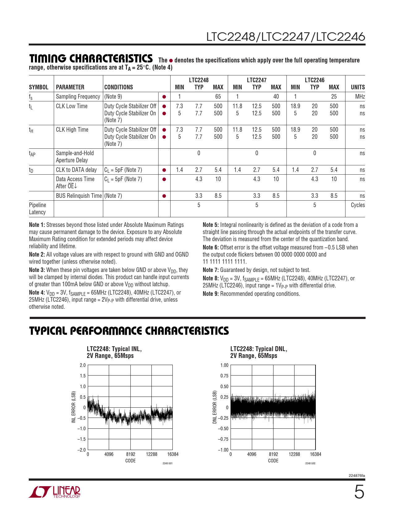 LTC2248/LTC2247/LTC2246 W UTI I G CHARACTERISTICS The ● denotes the specifications which apply over the full operating temperaturerange, otherwise specifications are at TA = 25 ° C. (Note 4)LTC2248LTC2247LTC2246SYMBOLPARAMETERCONDITIONSMINTYPMAXMINTYPMAXMINTYPMAXUNITS fs Sampling Frequency (Note 9) ● 1 65 1 40 1 25 MHz tL CLK Low Time Duty Cycle Stabilizer Off ● 7.3 7.7 500 11.8 12.5 500 18.9 20 500 ns Duty Cycle Stabilizer On ● 5 7.7 500 5 12.5 500 5 20 500 ns (Note 7) tH CLK High Time Duty Cycle Stabilizer Off ● 7.3 7.7 500 11.8 12.5 500 18.9 20 500 ns Duty Cycle Stabilizer On ● 5 7.7 500 5 12.5 500 5 20 500 ns (Note 7) tAP Sample-and-Hold 0 0 0 ns Aperture Delay tD CLK to DATA delay CL = 5pF (Note 7) ● 1.4 2.7 5.4 1.4 2.7 5.4 1.4 2.7 5.4 ns Data Access Time CL = 5pF (Note 7) ● 4.3 10 4.3 10 4.3 10 ns After OE↓ BUS Relinquish Time (Note 7) ● 3.3 8.5 3.3 8.5 3.3 8.5 ns Pipeline 5 5 5 Cycles Latency Note 1: Stresses beyond those listed under Absolute Maximum Ratings Note 5: Integral nonlinearity is defined as the deviation of a code from a may cause permanent damage to the device. Exposure to any Absolute straight line passing through the actual endpoints of the transfer curve. Maximum Rating condition for extended periods may affect device The deviation is measured from the center of the quantization band. reliability and lifetime. Note 6: Offset error is the offset voltage measured from –0.5 LSB when Note 2: All voltage values are with respect to ground with GND and OGND the output code flickers between 00 0000 0000 0000 and wired together (unless otherwise noted). 11 1111 1111 1111. Note 3: When these pin voltages are taken below GND or above VDD, they Note 7: Guaranteed by design, not subject to test. will be clamped by internal diodes. This product can handle input currents Note 8: VDD = 3V, fSAMPLE = 65MHz (LTC2248), 40MHz (LTC2247), or of greater than 100mA below GND or above VDD without latchup. 25MHz (LTC2246), input range = 1VP-P with differential drive. Note 4: VDD = 3V, fSAMPLE = 65MHz (LTC2248), 40MHz (LTC2247), or Note 9: Recommended operating conditions. 25MHz (LTC2246), input range = 2VP-P with differential drive, unless otherwise noted. WUTYPICAL PERFOR A CE CHARACTERISTICSLTC2248: Typical INL,LTC2248: Typical DNL,2V Range, 65Msps2V Range, 65Msps 2.0 1.00 1.5 0.75 1.0 0.50 0.5 0.25 0 0 –0.5 –0.25 INL ERROR (LSB) DNL ERROR (LSB) –1.0 –0.50 –1.5 –0.75 –2.0 –1.00 0 4096 8192 12288 16384 0 4096 8192 12288 16384 CODE CODE 2248 G01 2248 G02 224876fa 5