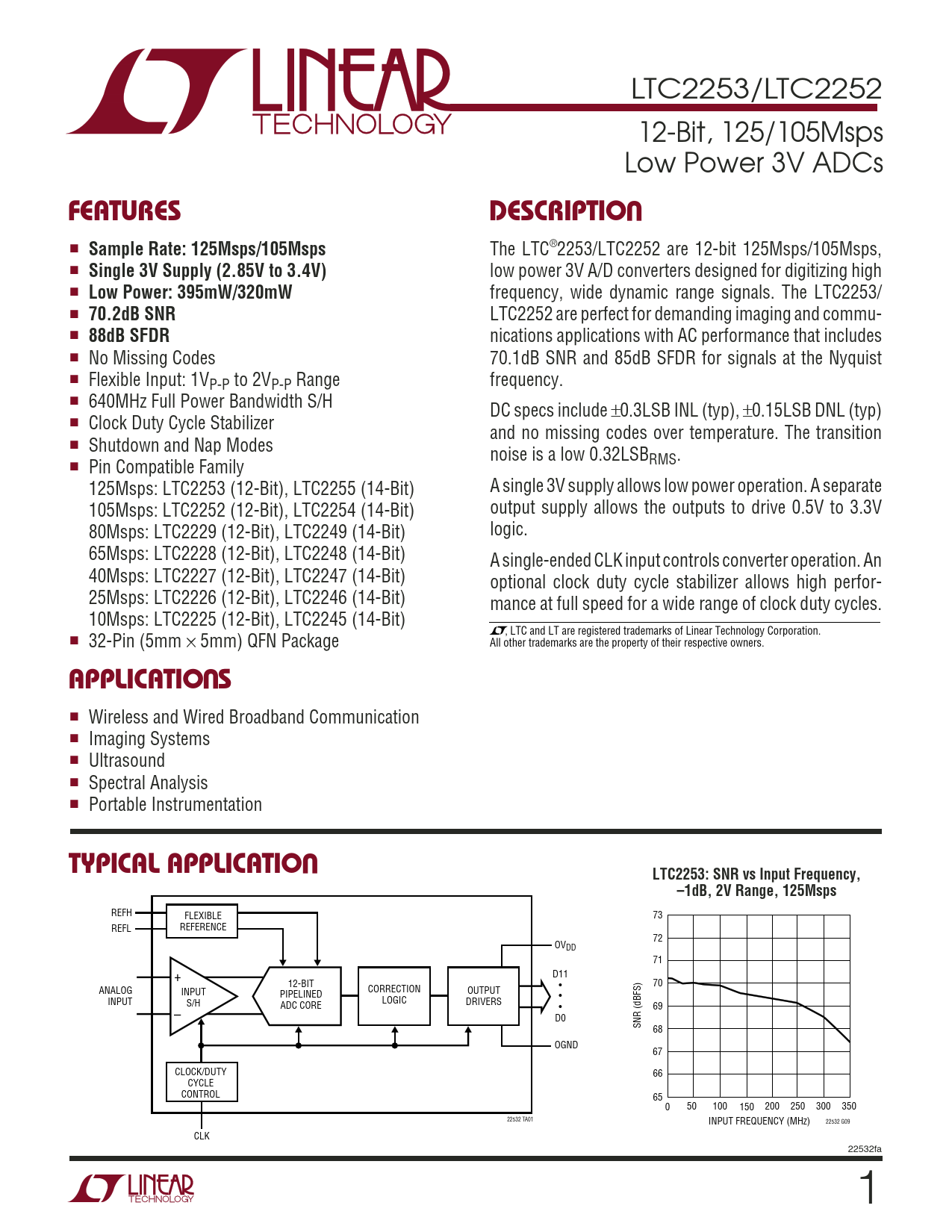 LTC2253/LTC2252 12-Bit, 125/105Msps Low Power 3V ADCs UFEATURESDESCRIPTIO ■ Sample Rate: 125Msps/105Msps The LTC®2253/LTC2252 are 12-bit 125Msps/105Msps, ■ Single 3V Supply (2.85V to 3.4V) low power 3V A/D converters designed for digitizing high ■ Low Power: 395mW/320mW frequency, wide dynamic range signals. The LTC2253/ ■ 70.2dB SNR LTC2252 are perfect for demanding imaging and commu- ■ 88dB SFDR nications applications with AC performance that includes ■ No Missing Codes 70.1dB SNR and 85dB SFDR for signals at the Nyquist ■ Flexible Input: 1VP-P to 2VP-P Range frequency. ■ 640MHz Full Power Bandwidth S/H DC specs include ±0.3LSB INL (typ), ±0.15LSB DNL (typ) ■ Clock Duty Cycle Stabilizer and no missing codes over temperature. The transition ■ Shutdown and Nap Modes noise is a low 0.32LSB ■ Pin Compatible Family RMS. 125Msps: LTC2253 (12-Bit), LTC2255 (14-Bit) A single 3V supply allows low power operation. A separate 105Msps: LTC2252 (12-Bit), LTC2254 (14-Bit) output supply allows the outputs to drive 0.5V to 3.3V 80Msps: LTC2229 (12-Bit), LTC2249 (14-Bit) logic. 65Msps: LTC2228 (12-Bit), LTC2248 (14-Bit) A single-ended CLK input controls converter operation. An 40Msps: LTC2227 (12-Bit), LTC2247 (14-Bit) optional clock duty cycle stabilizer allows high perfor- 25Msps: LTC2226 (12-Bit), LTC2246 (14-Bit) mance at full speed for a wide range of clock duty cycles. 10Msps: LTC2225 (12-Bit), LTC2245 (14-Bit) , LTC and LT are registered trademarks of Linear Technology Corporation. ■ 32-Pin (5mm × 5mm) QFN Package All other trademarks are the property of their respective owners. UAPPLICATIO S ■ Wireless and Wired Broadband Communication ■ Imaging Systems ■ Ultrasound ■ Spectral Analysis ■ Portable Instrumentation UTYPICAL APPLICATIOLTC2253: SNR vs Input Frequency,–1dB, 2V Range, 125Msps REFH FLEXIBLE 73 REFL REFERENCE 72 OVDD 71 + D11 12-BIT • 70 ANALOG INPUT CORRECTION OUTPUT PIPELINED • INPUT S/H LOGIC DRIVERS ADC CORE • 69 – D0 SNR (dBFS) 68 OGND 67 CLOCK/DUTY 66 CYCLE CONTROL 65 0 50 100 150 200 250 300 350 22532 TA01 INPUT FREQUENCY (MHz) 22532 G09 CLK 22532fa 1