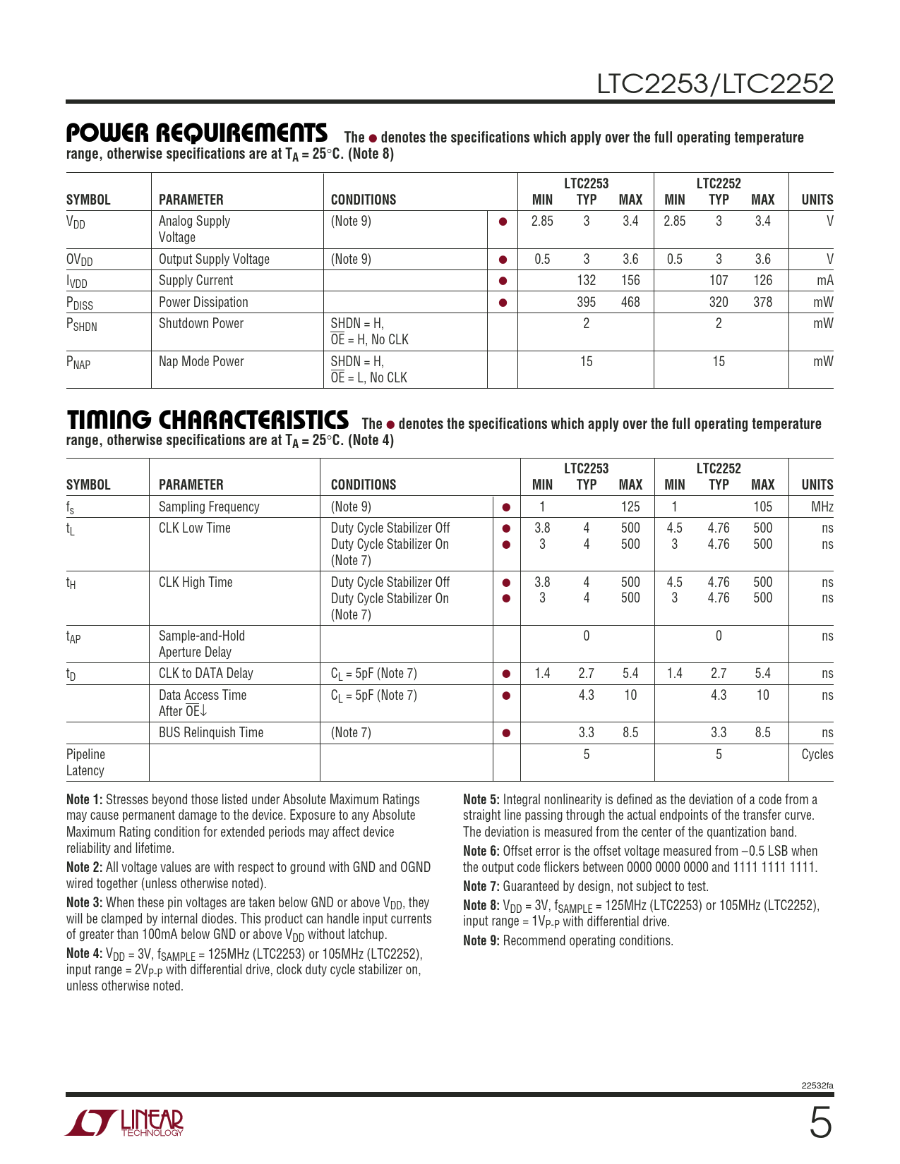 LTC2253/LTC2252 WUPOWER REQUIRE E TS The ● denotes the specifications which apply over the full operating temperaturerange, otherwise specifications are at TA = 25 ° C. (Note 8)LTC2253LTC2252SYMBOLPARAMETERCONDITIONSMINTYPMAXMINTYPMAXUNITS VDD Analog Supply (Note 9) ● 2.85 3 3.4 2.85 3 3.4 V Voltage OVDD Output Supply Voltage (Note 9) ● 0.5 3 3.6 0.5 3 3.6 V IVDD Supply Current ● 132 156 107 126 mA PDISS Power Dissipation ● 395 468 320 378 mW PSHDN Shutdown Power SHDN = H, 2 2 mW OE = H, No CLK PNAP Nap Mode Power SHDN = H, 15 15 mW OE = L, No CLK W UTI I G CHARACTERISTICS The ● denotes the specifications which apply over the full operating temperaturerange, otherwise specifications are at TA = 25 ° C. (Note 4)LTC2253LTC2252SYMBOLPARAMETERCONDITIONSMINTYPMAXMINTYPMAXUNITS fs Sampling Frequency (Note 9) ● 1 125 1 105 MHz tL CLK Low Time Duty Cycle Stabilizer Off ● 3.8 4 500 4.5 4.76 500 ns Duty Cycle Stabilizer On ● 3 4 500 3 4.76 500 ns (Note 7) tH CLK High Time Duty Cycle Stabilizer Off ● 3.8 4 500 4.5 4.76 500 ns Duty Cycle Stabilizer On ● 3 4 500 3 4.76 500 ns (Note 7) tAP Sample-and-Hold 0 0 ns Aperture Delay tD CLK to DATA Delay CL = 5pF (Note 7) ● 1.4 2.7 5.4 1.4 2.7 5.4 ns Data Access Time CL = 5pF (Note 7) ● 4.3 10 4.3 10 ns After OE↓ BUS Relinquish Time (Note 7) ● 3.3 8.5 3.3 8.5 ns Pipeline 5 5 Cycles Latency Note 1: Stresses beyond those listed under Absolute Maximum Ratings Note 5: Integral nonlinearity is defined as the deviation of a code from a may cause permanent damage to the device. Exposure to any Absolute straight line passing through the actual endpoints of the transfer curve. Maximum Rating condition for extended periods may affect device The deviation is measured from the center of the quantization band. reliability and lifetime. Note 6: Offset error is the offset voltage measured from –0.5 LSB when Note 2: All voltage values are with respect to ground with GND and OGND the output code flickers between 0000 0000 0000 and 1111 1111 1111. wired together (unless otherwise noted). Note 7: Guaranteed by design, not subject to test. Note 3: When these pin voltages are taken below GND or above VDD, they Note 8: VDD = 3V, fSAMPLE = 125MHz (LTC2253) or 105MHz (LTC2252), will be clamped by internal diodes. This product can handle input currents input range = 1VP-P with differential drive. of greater than 100mA below GND or above VDD without latchup. Note 9: Recommend operating conditions. Note 4: VDD = 3V, fSAMPLE = 125MHz (LTC2253) or 105MHz (LTC2252), input range = 2VP-P with differential drive, clock duty cycle stabilizer on, unless otherwise noted. 22532fa 5