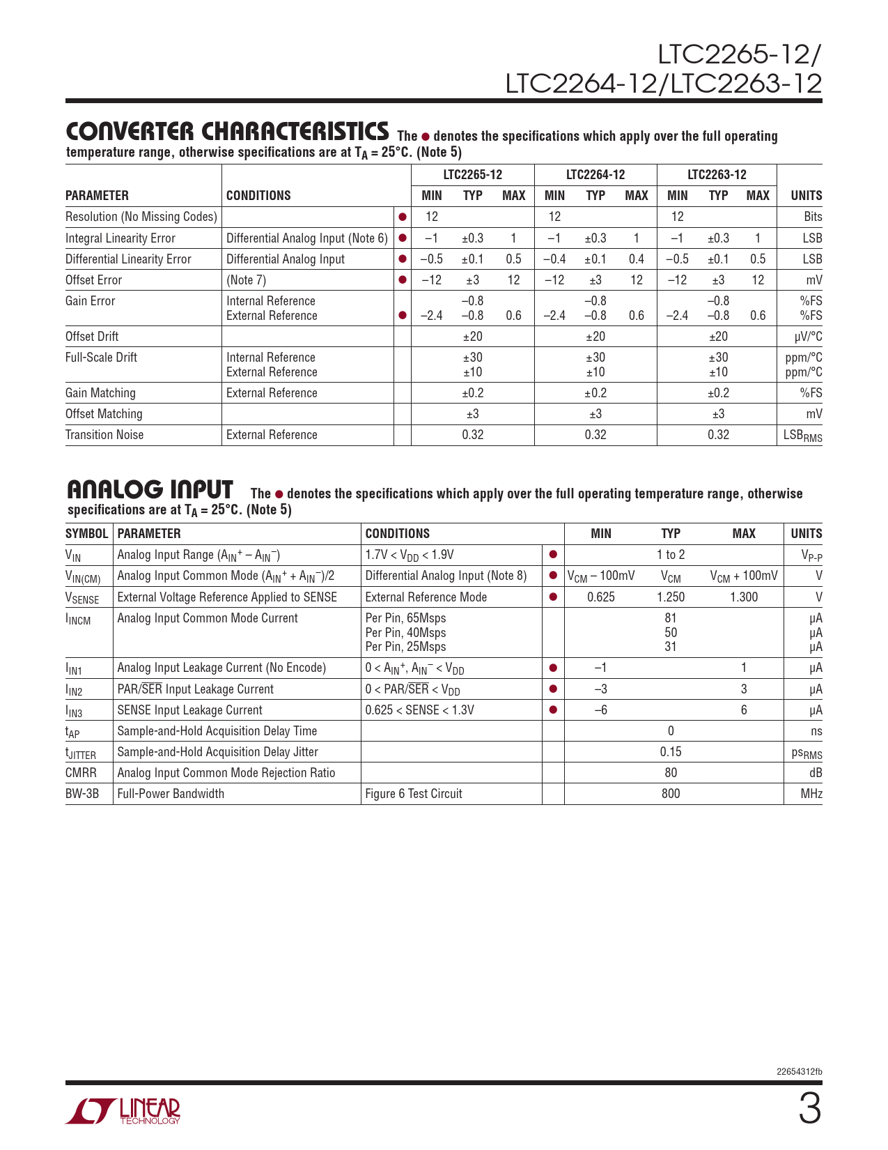 LTC2265-12/ LTC2264-12/LTC2263-12 CONVERTER CHARACTERISTICSThe l denotes the specifications which apply over the full operatingtemperature range, otherwise specifications are at TA = 25°C. (Note 5)LTC2265-12LTC2264-12LTC2263-12PARAMETERCONDITIONSMINTYPMAXMINTYPMAXMINTYPMAXUNITS Resolution (No Missing Codes) l 12 12 12 Bits Integral Linearity Error Differential Analog Input (Note 6) l –1 ±0.3 1 –1 ±0.3 1 –1 ±0.3 1 LSB Differential Linearity Error Differential Analog Input l –0.5 ±0.1 0.5 –0.4 ±0.1 0.4 –0.5 ±0.1 0.5 LSB Offset Error (Note 7) l –12 ±3 12 –12 ±3 12 –12 ±3 12 mV Gain Error Internal Reference –0.8 –0.8 –0.8 %FS External Reference l –2.4 –0.8 0.6 –2.4 –0.8 0.6 –2.4 –0.8 0.6 %FS Offset Drift ±20 ±20 ±20 µV/°C Full-Scale Drift Internal Reference ±30 ±30 ±30 ppm/°C External Reference ±10 ±10 ±10 ppm/°C Gain Matching External Reference ±0.2 ±0.2 ±0.2 %FS Offset Matching ±3 ±3 ±3 mV Transition Noise External Reference 0.32 0.32 0.32 LSBRMS ANALOG INPUTThe l denotes the specifications which apply over the full operating temperature range, otherwisespecifications are at TA = 25°C. (Note 5)SYMBOL PARAMETERCONDITIONSMINTYPMAXUNITS V + – IN Analog Input Range (AIN – AIN ) 1.7V < VDD < 1.9V l 1 to 2 VP-P V + – IN(CM) Analog Input Common Mode (AIN + AIN )/2 Differential Analog Input (Note 8) l VCM – 100mV VCM VCM + 100mV V VSENSE External Voltage Reference Applied to SENSE External Reference Mode l 0.625 1.250 1.300 V IINCM Analog Input Common Mode Current Per Pin, 65Msps 81 µA Per Pin, 40Msps 50 µA Per Pin, 25Msps 31 µA I + – IN1 Analog Input Leakage Current (No Encode) 0 < AIN , AIN < VDD l –1 1 µA IIN2 PAR/SER Input Leakage Current 0 < PAR/SER < VDD l –3 3 µA IIN3 SENSE Input Leakage Current 0.625 < SENSE < 1.3V l –6 6 µA tAP Sample-and-Hold Acquisition Delay Time 0 ns tJITTER Sample-and-Hold Acquisition Delay Jitter 0.15 psRMS CMRR Analog Input Common Mode Rejection Ratio 80 dB BW-3B Full-Power Bandwidth Figure 6 Test Circuit 800 MHz 22654312fb 3 Document Outline Features Applications Description Typical Application Absolute Maximum Ratings Pin Configuration Order Information Converter Characteristics Analog Input Dynamic Accuracy Internal Reference Characteristics Digital Inputs And Outputs Power Requirements Timing Characteristics Timing Diagrams Typical Performance Characteristics Pin Functions Functional Block Diagram Applications Information Typical Applications Package Description Revision History Related Parts