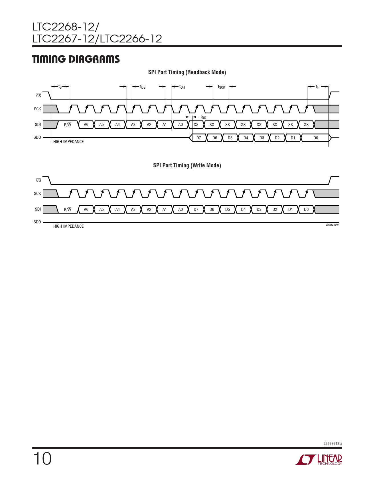 CS SCK SDI R/W A6 A5 A4 A3 A2 A1 A0 D7 D6 D5 D4 D3 D2 D1 D0 SDO 226812 TD07 HIGH IMPEDANCE 22687612fa 10 Document Outline Features Description Applications Typical Application Absolute Maximum Ratings Pin Configuration Order Information Converter Characteristics Analog Input Digital Accuracy Internal Reference Characteristics Digital Inputs and Outputs Power Requirements Timing Characteristics Electrical Characteristics Timing Diagrams Typical Performance Characteristics Pin Functions Block Diagram Applications Information Typical Applications Package Description Revision History Related Parts