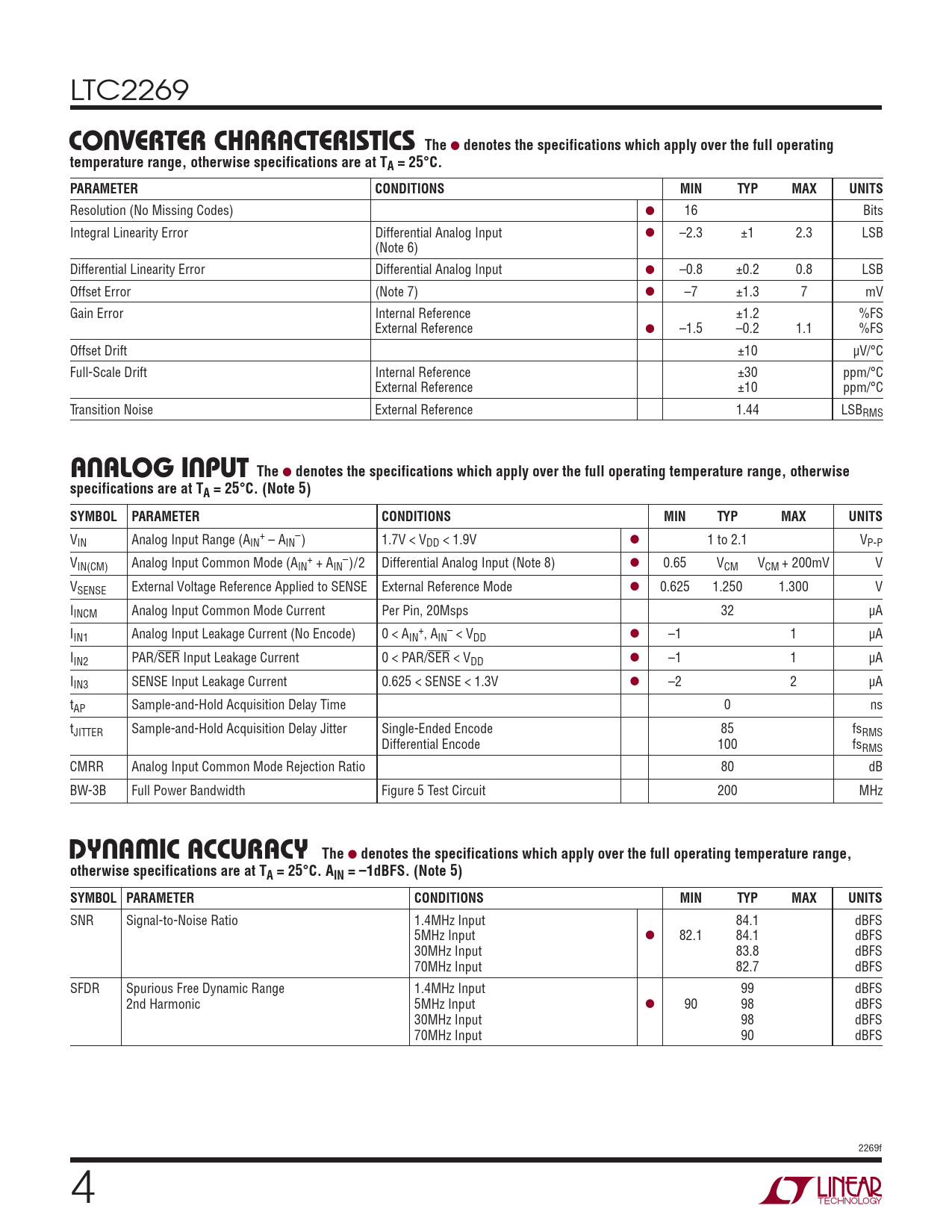 SNR Signal-to-Noise Ratio 1.4MHz Input 84.1 dBFS 5MHz Input l 82.1 84.1 dBFS 30MHz Input 83.8 dBFS 70MHz Input 82.7 dBFS SFDR Spurious Free Dynamic Range 1.4MHz Input 99 dBFS 2nd Harmonic 5MHz Input l 90 98 dBFS 30MHz Input 98 dBFS 70MHz Input 90 dBFS 2269f 4