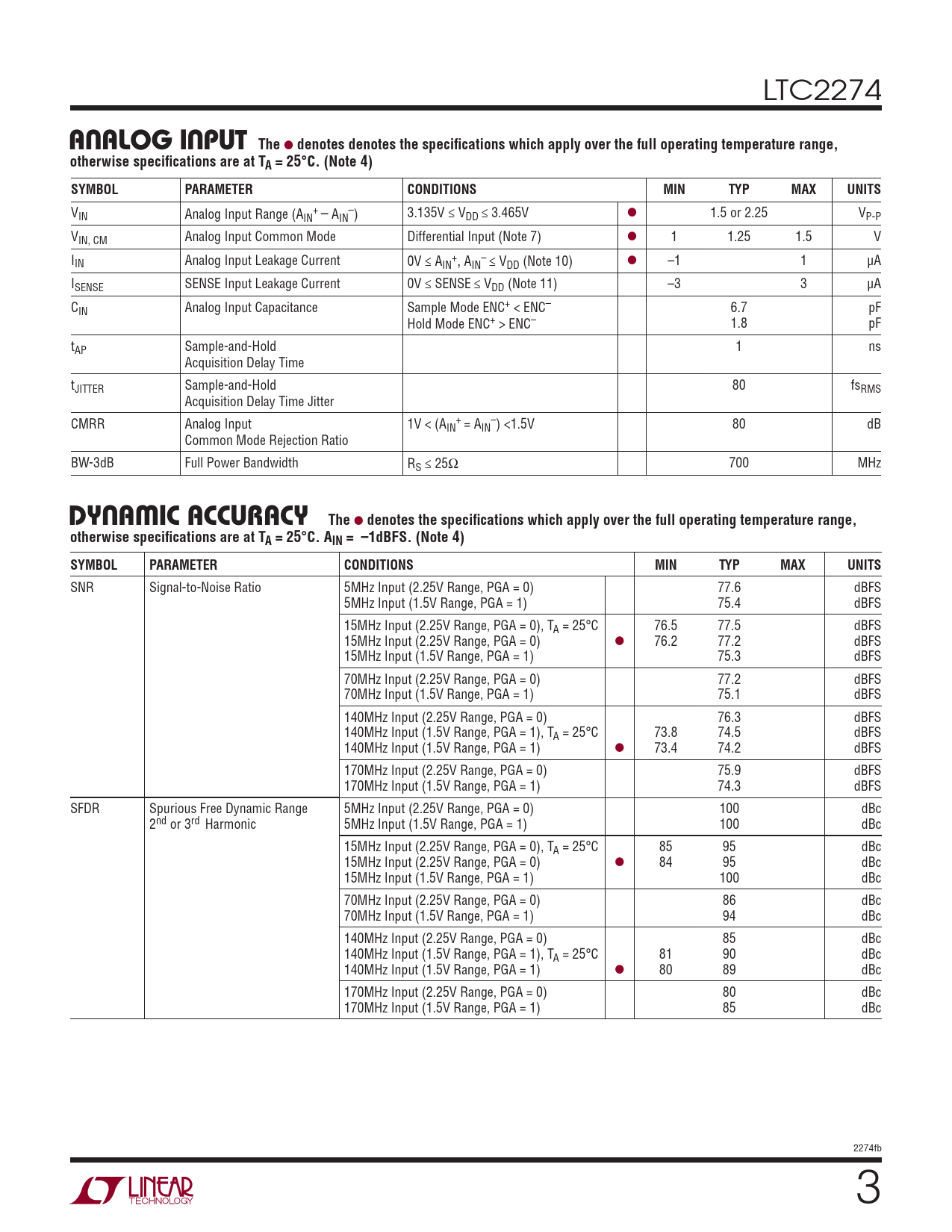 SNR Signal-to-Noise Ratio 5MHz Input (2.25V Range, PGA = 0) 77.6 dBFS 5MHz Input (1.5V Range, PGA = 1) 75.4 dBFS 15MHz Input (2.25V Range, PGA = 0), TA = 25°C 76.5 77.5 dBFS 15MHz Input (2.25V Range, PGA = 0) l 76.2 77.2 dBFS 15MHz Input (1.5V Range, PGA = 1) 75.3 dBFS 70MHz Input (2.25V Range, PGA = 0) 77.2 dBFS 70MHz Input (1.5V Range, PGA = 1) 75.1 dBFS 140MHz Input (2.25V Range, PGA = 0) 76.3 dBFS 140MHz Input (1.5V Range, PGA = 1), TA = 25°C 73.8 74.5 dBFS 140MHz Input (1.5V Range, PGA = 1) l 73.4 74.2 dBFS 170MHz Input (2.25V Range, PGA = 0) 75.9 dBFS 170MHz Input (1.5V Range, PGA = 1) 74.3 dBFS SFDR Spurious Free Dynamic Range 5MHz Input (2.25V Range, PGA = 0) 100 dBc 2nd or 3rd Harmonic 5MHz Input (1.5V Range, PGA = 1) 100 dBc 15MHz Input (2.25V Range, PGA = 0), TA = 25°C 85 95 dBc 15MHz Input (2.25V Range, PGA = 0) l 84 95 dBc 15MHz Input (1.5V Range, PGA = 1) 100 dBc 70MHz Input (2.25V Range, PGA = 0) 86 dBc 70MHz Input (1.5V Range, PGA = 1) 94 dBc 140MHz Input (2.25V Range, PGA = 0) 85 dBc 140MHz Input (1.5V Range, PGA = 1), TA = 25°C 81 90 dBc 140MHz Input (1.5V Range, PGA = 1) l 80 89 dBc 170MHz Input (2.25V Range, PGA = 0) 80 dBc 170MHz Input (1.5V Range, PGA = 1) 85 dBc 2274fb 3