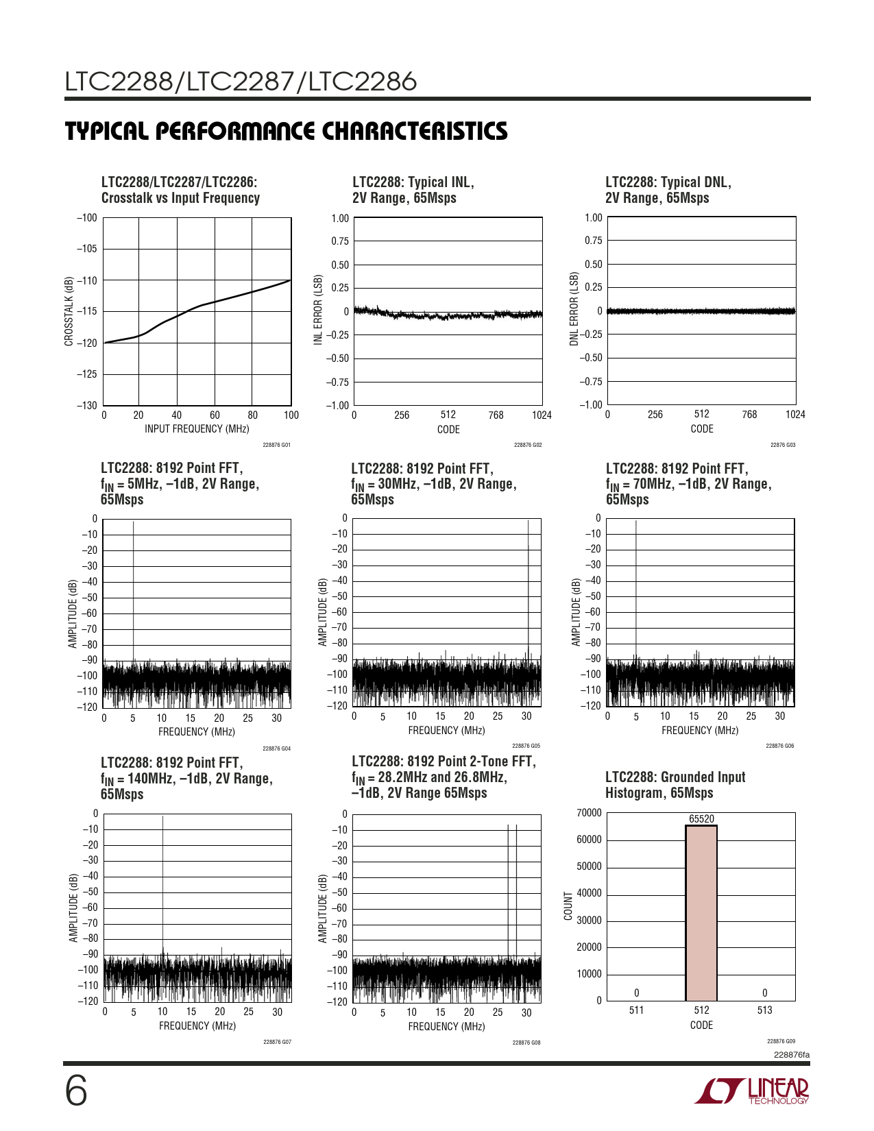 W U TYPICAL PERFOR A CE CHARACTERISTICS LTC2288/LTC2287/LTC2286: LTC2288: Typical INL, LTC2288: Typical DNL, Crosstalk vs Input Frequency 2V Range, 65Msps 2V Range, 65Msps
