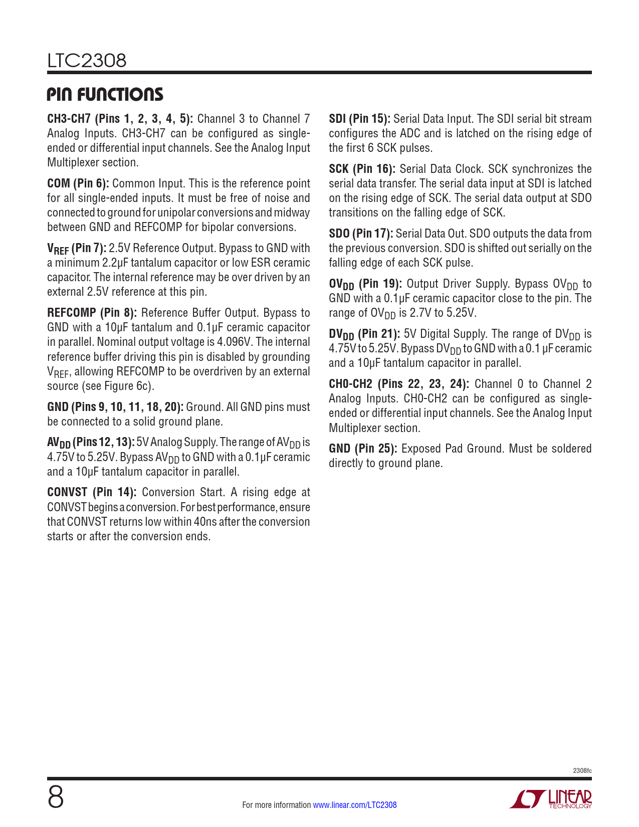 LTC2308 PIN FUNCTIONSCH3-CH7 (Pins 1, 2, 3, 4, 5): Channel 3 to Channel 7 SDI (Pin 15): Serial Data Input. The SDI serial bit stream Analog Inputs. CH3-CH7 can be configured as single- configures the ADC and is latched on the rising edge of ended or differential input channels. See the Analog Input the first 6 SCK pulses. Multiplexer section. SCK (Pin 16): Serial Data Clock. SCK synchronizes the COM (Pin 6): Common Input. This is the reference point serial data transfer. The serial data input at SDI is latched for all single-ended inputs. It must be free of noise and on the rising edge of SCK. The serial data output at SDO connected to ground for unipolar conversions and midway transitions on the falling edge of SCK. between GND and REFCOMP for bipolar conversions. SDO (Pin 17): Serial Data Out. SDO outputs the data from VREF (Pin 7): 2.5V Reference Output. Bypass to GND with the previous conversion. SDO is shifted out serially on the a minimum 2.2µF tantalum capacitor or low ESR ceramic falling edge of each SCK pulse. capacitor. The internal reference may be over driven by an OV external 2.5V reference at this pin. DD (Pin 19): Output Driver Supply. Bypass OVDD to GND with a 0.1µF ceramic capacitor close to the pin. The REFCOMP (Pin 8): Reference Buffer Output. Bypass to range of OVDD is 2.7V to 5.25V. GND with a 10µF tantalum and 0.1µF ceramic capacitor DV in parallel. Nominal output voltage is 4.096V. The internal DD (Pin 21): 5V Digital Supply. The range of DVDD is 4.75V to 5.25V. Bypass DV reference buffer driving this pin is disabled by grounding DD to GND with a 0.1 µF ceramic and a 10µF tantalum capacitor in parallel. VREF , allowing REFCOMP to be overdriven by an external source (see Figure 6c). CH0-CH2 (Pins 22, 23, 24): Channel 0 to Channel 2 Analog Inputs. CH0-CH2 can be configured as single- GND (Pins 9, 10, 11, 18, 20): Ground. All GND pins must ended or differential input channels. See the Analog Input be connected to a solid ground plane. Multiplexer section. AVDD (Pins 12, 13): 5V Analog Supply. The range of AVDD is GND (Pin 25): Exposed Pad Ground. Must be soldered 4.75V to 5.25V. Bypass AVDD to GND with a 0.1µF ceramic directly to ground plane. and a 10µF tantalum capacitor in parallel. CONVST (Pin 14): Conversion Start. A rising edge at CONVST begins a conversion. For best performance, ensure that CONVST returns low within 40ns after the conversion starts or after the conversion ends. 2308fc 8 For more information www.linear.com/LTC2308