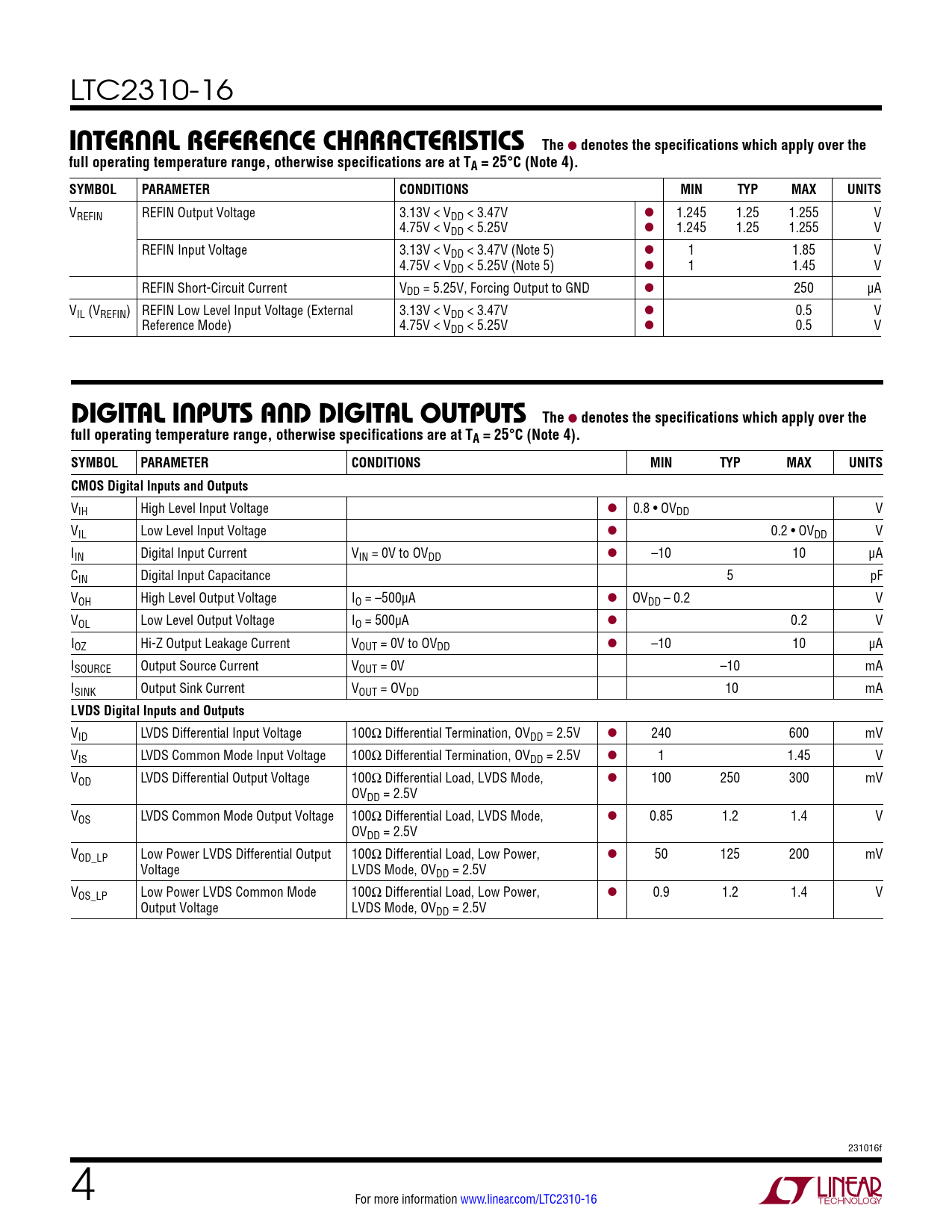 LTC2310-16 inTernal reFerence characTerisTicsThe l denotes the specifications which apply over thefull operating temperature range, otherwise specifications are at TA = 25°C (Note 4). SYMBOLPARAMETERCONDITIONSMINTYPMAXUNITS VREFIN REFIN Output Voltage 3.13V < VDD < 3.47V l 1.245 1.25 1.255 V 4.75V < VDD < 5.25V l 1.245 1.25 1.255 V REFIN Input Voltage 3.13V < VDD < 3.47V (Note 5) l 1 1.85 V 4.75V < VDD < 5.25V (Note 5) l 1 1.45 V REFIN Short-Circuit Current VDD = 5.25V, Forcing Output to GND l 250 µA VIL (VREFIN) REFIN Low Level Input Voltage (External 3.13V < VDD < 3.47V l 0.5 V Reference Mode) 4.75V < VDD < 5.25V l 0.5 V DigiTal inpuTs anD DigiTal ouTpuTsThe l denotes the specifications which apply over thefull operating temperature range, otherwise specifications are at TA = 25°C (Note 4). SYMBOLPARAMETERCONDITIONSMINTYPMAXUNITSCMOS Digital Inputs and Outputs VIH High Level Input Voltage l 0.8 • OVDD V VIL Low Level Input Voltage l 0.2 • OVDD V IIN Digital Input Current VIN = 0V to OVDD l –10 10 μA CIN Digital Input Capacitance 5 pF VOH High Level Output Voltage IO = –500µA l OVDD – 0.2 V VOL Low Level Output Voltage IO = 500µA l 0.2 V IOZ Hi-Z Output Leakage Current VOUT = 0V to OVDD l –10 10 µA ISOURCE Output Source Current VOUT = 0V –10 mA ISINK Output Sink Current VOUT = OVDD 10 mA LVDS Digital Inputs and Outputs VID LVDS Differential Input Voltage 100Ω Differential Termination, OVDD = 2.5V l 240 600 mV VIS LVDS Common Mode Input Voltage 100Ω Differential Termination, OVDD = 2.5V l 1 1.45 V VOD LVDS Differential Output Voltage 100Ω Differential Load, LVDS Mode, l 100 250 300 mV OVDD = 2.5V VOS LVDS Common Mode Output Voltage 100Ω Differential Load, LVDS Mode, l 0.85 1.2 1.4 V OVDD = 2.5V VOD_LP Low Power LVDS Differential Output 100Ω Differential Load, Low Power, l 50 125 200 mV Voltage LVDS Mode, OVDD = 2.5V VOS_LP Low Power LVDS Common Mode 100Ω Differential Load, Low Power, l 0.9 1.2 1.4 V Output Voltage LVDS Mode, OVDD = 2.5V 231016f 4 For more information www.linear.com/LTC2310-16 Document Outline Features Applications Description Typical Application Absolute Maximum Ratings Pin Configuration Electrical Characteristics Converter Characteristics Dynamic Accuracy Internal Reference Characteristics Digital Inputs And Digital Outputs Power Requirements ADC Timing Characteristics Typical Performance Characteristics Functional Block Diagram Timing Diagram Applications Information Package Description Related Parts