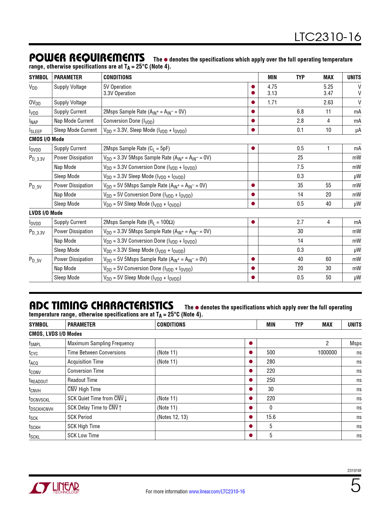 LTC2310-16 power requireMenTsThe l denotes the specifications which apply over the full operating temperaturerange, otherwise specifications are at TA = 25°C (Note 4). SYMBOL PARAMETERCONDITIONSMINTYPMAXUNITS VDD Supply Voltage 5V Operation l 4.75 5.25 V 3.3V Operation l 3.13 3.47 V OVDD Supply Voltage l 1.71 2.63 V IVDD Supply Current 2Msps Sample Rate (AIN+ = AIN– = 0V) l 6.8 11 mA INAP Nap Mode Current Conversion Done (IVDD) l 2.8 4 mA ISLEEP Sleep Mode Current VDD = 3.3V, Sleep Mode (IVDD + IOVDD) l 0.1 10 μA CMOS I/O Mode IOVDD Supply Current 2Msps Sample Rate (CL = 5pF) l 0.5 1 mA PD_3.3V Power Dissipation VDD = 3.3V 5Msps Sample Rate (AIN+ = AIN– = 0V) 25 mW Nap Mode VDD = 3.3V Conversion Done (IVDD + IOVDD) 7.5 mW Sleep Mode VDD = 3.3V Sleep Mode (IVDD + IOVDD) 0.3 μW PD_5V Power Dissipation VDD = 5V 5Msps Sample Rate (AIN+ = AIN– = 0V) l 35 55 mW Nap Mode VDD = 5V Conversion Done (IVDD + IOVDD) l 14 20 mW Sleep Mode VDD = 5V Sleep Mode (IVDD + IOVDD) l 0.5 40 μW LVDS I/O Mode IOVDD Supply Current 2Msps Sample Rate (RL = 100Ω) l 2.7 4 mA PD_3.3V Power Dissipation VDD = 3.3V 5Msps Sample Rate (AIN+ = AIN– = 0V) 30 mW Nap Mode VDD = 3.3V Conversion Done (IVDD + IOVDD) 14 mW Sleep Mode VDD = 3.3V Sleep Mode (IVDD + IOVDD) 0.3 µW PD_5V Power Dissipation VDD = 5V 5Msps Sample Rate (AIN+ = AIN– = 0V) l 40 60 mW Nap Mode VDD = 5V Conversion Done (IVDD + IOVDD) l 20 30 mW Sleep Mode VDD = 5V Sleep Mode (IVDD + IOVDD) l 0.5 50 µW aDc TiMing characTerisTicsThe l denotes the specifications which apply over the full operatingtemperature range, otherwise specifications are at TA = 25°C (Note 4). SYMBOLPARAMETERCONDITIONSMINTYPMAXUNITSCMOS, LVDS I/O Modes fSMPL Maximum Sampling Frequency l 2 Msps tCYC Time Between Conversions (Note 11) l 500 1000000 ns tACQ Acquisition Time (Note 11) l 280 ns tCONV Conversion Time l 220 ns tREADOUT Readout Time l 250 ns tCNVH CNV High Time l 30 ns tDCNVSCKL SCK Quiet Time from CNV↓ (Note 11) l 220 ns tDSCKHCNVH SCK Delay Time to CNV↑ (Note 11) l 0 ns tSCK SCK Period (Notes 12, 13) l 15.6 ns tSCKH SCK High Time l 5 ns tSCKL SCK Low Time l 5 ns 231016f For more information www.linear.com/LTC2310-16 5 Document Outline Features Applications Description Typical Application Absolute Maximum Ratings Pin Configuration Electrical Characteristics Converter Characteristics Dynamic Accuracy Internal Reference Characteristics Digital Inputs And Digital Outputs Power Requirements ADC Timing Characteristics Typical Performance Characteristics Functional Block Diagram Timing Diagram Applications Information Package Description Related Parts