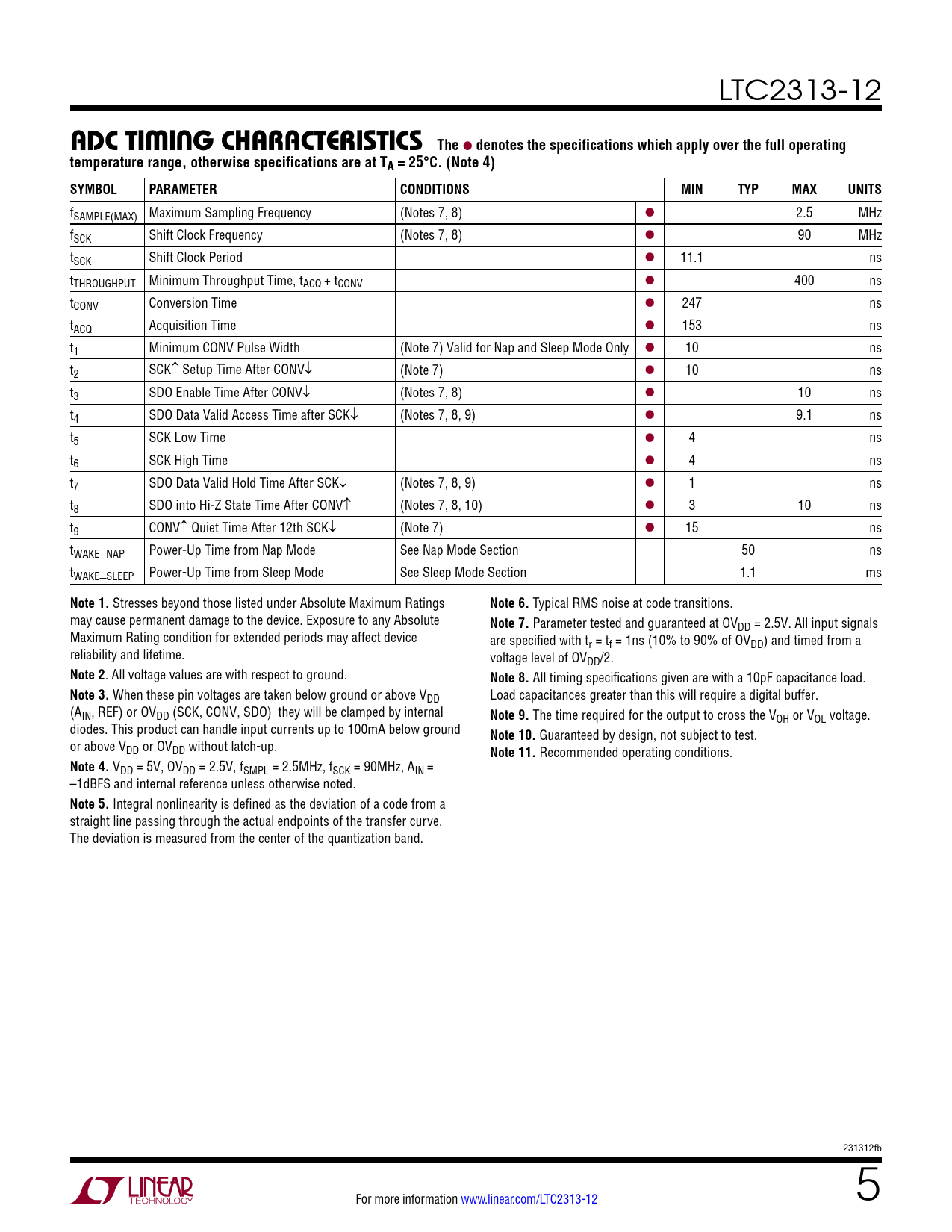 fSAMPLE(MAX) Maximum Sampling Frequency (Notes 7, 8) l 2.5 MHz fSCK Shift Clock Frequency (Notes 7, 8) l 90 MHz tSCK Shift Clock Period l 11.1 ns tTHROUGHPUT Minimum Throughput Time, tACQ + tCONV l 400 ns tCONV Conversion Time l 247 ns tACQ Acquisition Time l 153 ns t1 Minimum CONV Pulse Width (Note 7) Valid for Nap and Sleep Mode Only l 10 ns t2 SCK↑ Setup Time After CONV↓ (Note 7) l 10 ns t3 SDO Enable Time After CONV↓ (Notes 7, 8) l 10 ns t4 SDO Data Valid Access Time after SCK↓ (Notes 7, 8, 9) l 9.1 ns t5 SCK Low Time l 4 ns t6 SCK High Time l 4 ns t7 SDO Data Valid Hold Time After SCK↓ (Notes 7, 8, 9) l 1 ns t8 SDO into Hi-Z State Time After CONV↑ (Notes 7, 8, 10) l 3 10 ns t9 CONV↑ Quiet Time After 12th SCK↓ (Note 7) l 15 ns tWAKE_NAP Power-Up Time from Nap Mode See Nap Mode Section 50 ns tWAKE_SLEEP Power-Up Time from Sleep Mode See Sleep Mode Section 1.1 ms