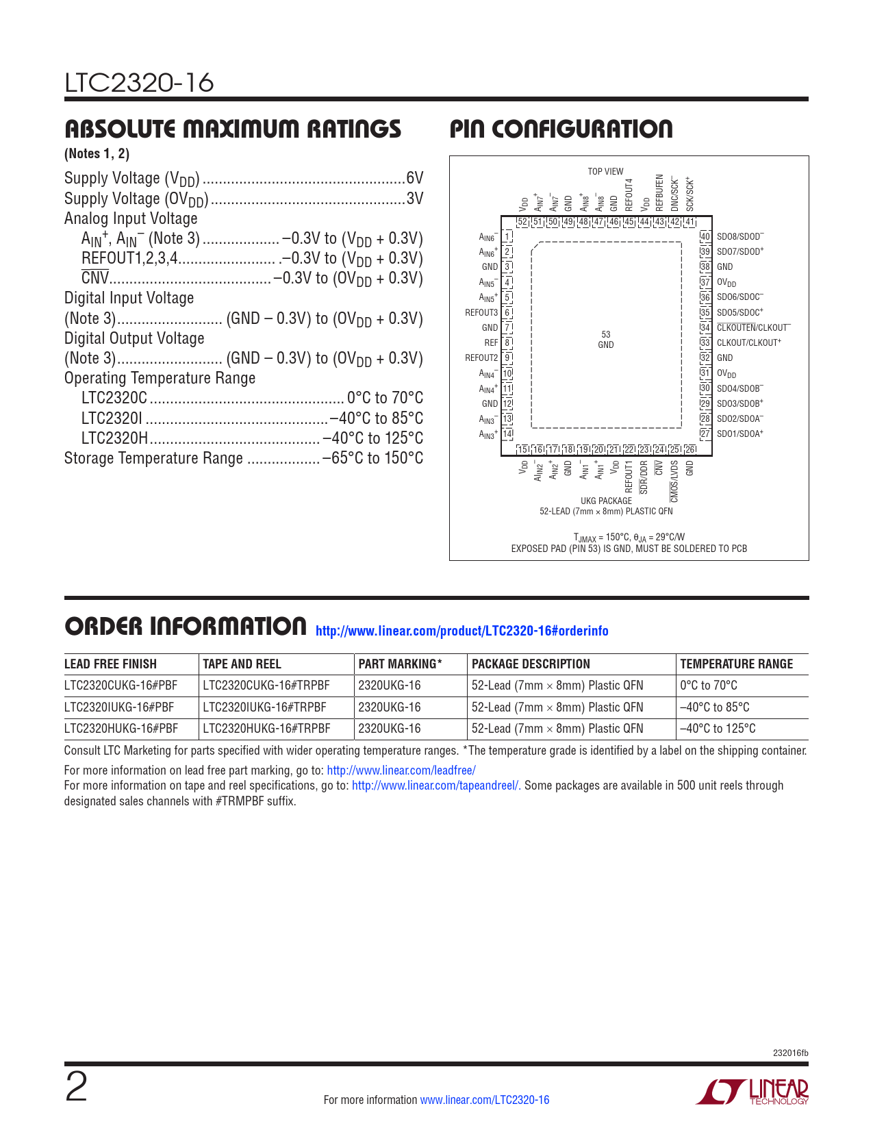 LTC2320CUKG-16#PBF LTC2320CUKG-16#TRPBF 2320UKG-16 52-Lead (7mm × 8mm) Plastic QFN 0°C to 70°C LTC2320IUKG-16#PBF LTC2320IUKG-16#TRPBF 2320UKG-16 52-Lead (7mm × 8mm) Plastic QFN –40°C to 85°C LTC2320HUKG-16#PBF LTC2320HUKG-16#TRPBF 2320UKG-16 52-Lead (7mm × 8mm) Plastic QFN –40°C to 125°C Consult LTC Marketing for parts specified with wider operating temperature ranges. *The temperature grade is identified by a label on the shipping container. For more information on lead free part marking, go to: http://www.linear.com/leadfree/ For more information on tape and reel specifications, go to: http://www.linear.com/tapeandreel/. Some packages are available in 500 unit reels through designated sales channels with #TRMPBF suffix. 232016fb 2 For more information www.linear.com/LTC2320-16 Document Outline Features Applications Description Typical Application Absolute Maximum Ratings Pin Configuration Order Information Electrical Characteristics Converter Characteristics Dynamic Accuracy Internal Reference Characteristics Digital Inputs And Digital Outputs Power Requirements ADC Timing Characteristics Typical Performance Characteristics Pin Functions Functional Block Diagram Timing Diagram Applications Information Package Description Related Parts .32673 Applications Typical Application Description Absolute Maximum Ratings Order Information Pin Configuration Electrical Characteristics Converter Characteristics Digital Inputs And Digital Outputs Power Requirements ADC Timing Characteristics ADC Timing Characteristics ADC Timing Characteristics Typical Performance Characteristics Pin Functions CMOS data output option (CMOS/LVDS = low) LVDS data output option (CMOS/LVDS = high or FLOAT) Functional Block Diagram Timing Diagram Applications Information OVERVIEW CONVERTER OPERATION TRANSFER FUNCTION INPUT DRIVE CIRCUITS ADC REFERENCE DYNAMIC PERFORMANCE POWER CONSIDERATIONS TIMING AND CONTROL DIGITAL INTERFACE BOARD LAYOUT Package Description Typical Application Related Parts