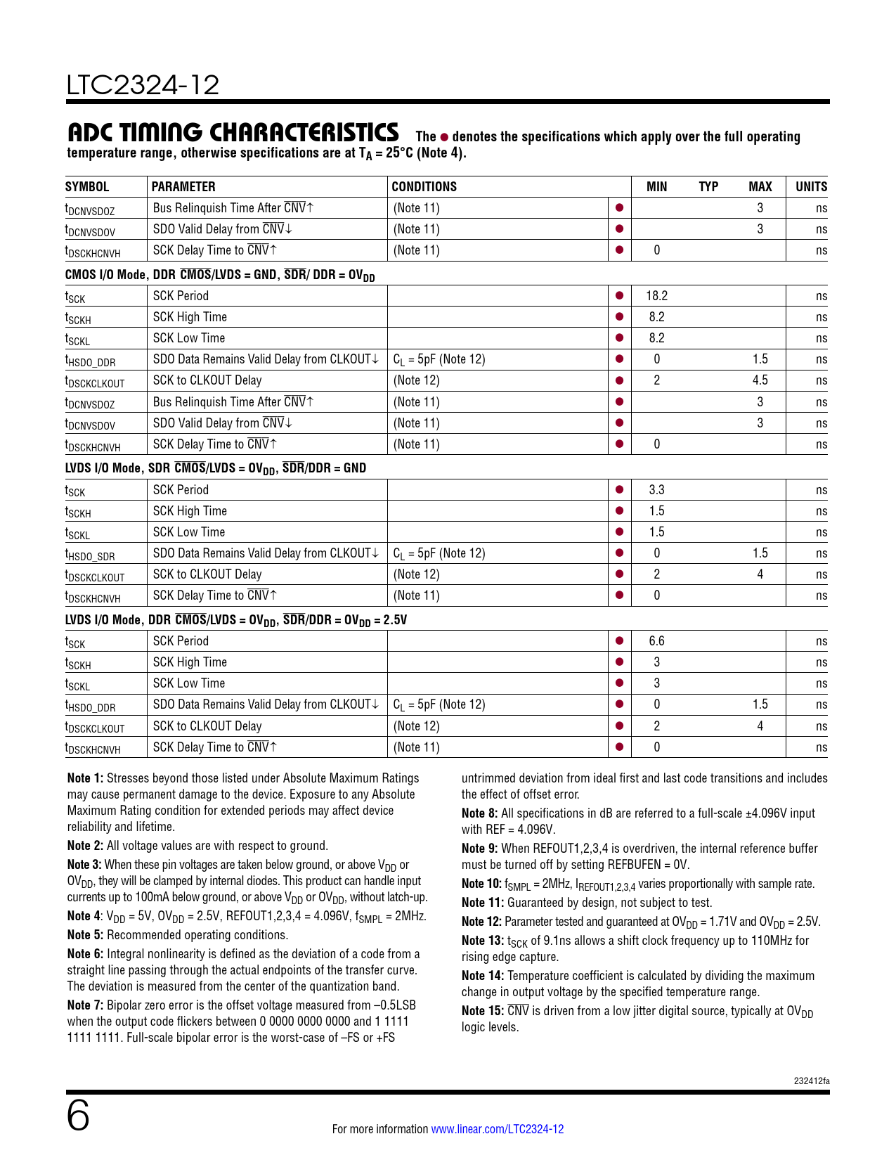 LTC2324-12 aDc TiMing characTerisTicsThe l denotes the specifications which apply over the full operatingtemperature range, otherwise specifications are at TA = 25°C (Note 4).SYMBOLPARAMETERCONDITIONSMINTYPMAXUNITS tDCNVSDOZ Bus Relinquish Time After CNV (Note 11) l 3 ns tDCNVSDOV SDO Valid Delay from CNV (Note 11) l 3 ns tDSCKHCNVH SCK Delay Time to CNV (Note 11) l 0 ns CMOS I/O Mode, DDR CMOS/LVDS = GND, SDR/ DDR = OVDD tSCK SCK Period l 18.2 ns tSCKH SCK High Time l 8.2 ns tSCKL SCK Low Time l 8.2 ns tHSDO_DDR SDO Data Remains Valid Delay from CLKOUT CL = 5pF (Note 12) l 0 1.5 ns tDSCKCLKOUT SCK to CLKOUT Delay (Note 12) l 2 4.5 ns tDCNVSDOZ Bus Relinquish Time After CNV (Note 11) l 3 ns tDCNVSDOV SDO Valid Delay from CNV (Note 11) l 3 ns tDSCKHCNVH SCK Delay Time to CNV (Note 11) l 0 ns LVDS I/O Mode, SDR CMOS/LVDS = OVDD, SDR/DDR = GND tSCK SCK Period l 3.3 ns tSCKH SCK High Time l 1.5 ns tSCKL SCK Low Time l 1.5 ns tHSDO_SDR SDO Data Remains Valid Delay from CLKOUT CL = 5pF (Note 12) l 0 1.5 ns tDSCKCLKOUT SCK to CLKOUT Delay (Note 12) l 2 4 ns tDSCKHCNVH SCK Delay Time to CNV (Note 11) l 0 ns LVDS I/O Mode, DDR CMOS/LVDS = OVDD, SDR/DDR = OVDD = 2.5V tSCK SCK Period l 6.6 ns tSCKH SCK High Time l 3 ns tSCKL SCK Low Time l 3 ns tHSDO_DDR SDO Data Remains Valid Delay from CLKOUT CL = 5pF (Note 12) l 0 1.5 ns tDSCKCLKOUT SCK to CLKOUT Delay (Note 12) l 2 4 ns tDSCKHCNVH SCK Delay Time to CNV (Note 11) l 0 ns Note 1: Stresses beyond those listed under Absolute Maximum Ratings untrimmed deviation from ideal first and last code transitions and includes may cause permanent damage to the device. Exposure to any Absolute the effect of offset error. Maximum Rating condition for extended periods may affect device Note 8: All specifications in dB are referred to a full-scale ±4.096V input reliability and lifetime. with REF = 4.096V. Note 2: All voltage values are with respect to ground. Note 9: When REFOUT1,2,3,4 is overdriven, the internal reference buffer Note 3: When these pin voltages are taken below ground, or above VDD or must be turned off by setting REFBUFEN = 0V. OVDD, they will be clamped by internal diodes. This product can handle input Note 10: fSMPL = 2MHz, IREFOUT1,2,3,4 varies proportionally with sample rate. currents up to 100mA below ground, or above VDD or OVDD, without latch-up. Note 11: Guaranteed by design, not subject to test. Note 4 : VDD = 5V, OVDD = 2.5V, REFOUT1,2,3,4 = 4.096V, fSMPL = 2MHz. Note 12: Parameter tested and guaranteed at OVDD = 1.71V and OVDD = 2.5V. Note 5: Recommended operating conditions. Note 13: tSCK of 9.1ns allows a shift clock frequency up to 110MHz for Note 6: Integral nonlinearity is defined as the deviation of a code from a rising edge capture. straight line passing through the actual endpoints of the transfer curve. Note 14: Temperature coefficient is calculated by dividing the maximum The deviation is measured from the center of the quantization band. change in output voltage by the specified temperature range. Note 7: Bipolar zero error is the offset voltage measured from –0.5LSB Note 15: CNV is driven from a low jitter digital source, typically at OV when the output code flickers between 0 0000 0000 0000 and 1 1111 DD logic levels. 1111 1111. Full-scale bipolar error is the worst-case of –FS or +FS 232412fa 6 For more information www.linear.com/LTC2324-12 Document Outline Features Applications Description Typical Application Absolute Maximum Ratings Pin Configuration Order Information Electrical Characteristics Converter Characteristics Dynamic Accuracy Internal Reference Characteristics Digital Inputs And Digital Outputs Power Requirements ADC Timing Characteristics Typical Performance Characteristics Pin Functions Functional Block Diagram Timing Diagram Applications Information Package Description Related Parts