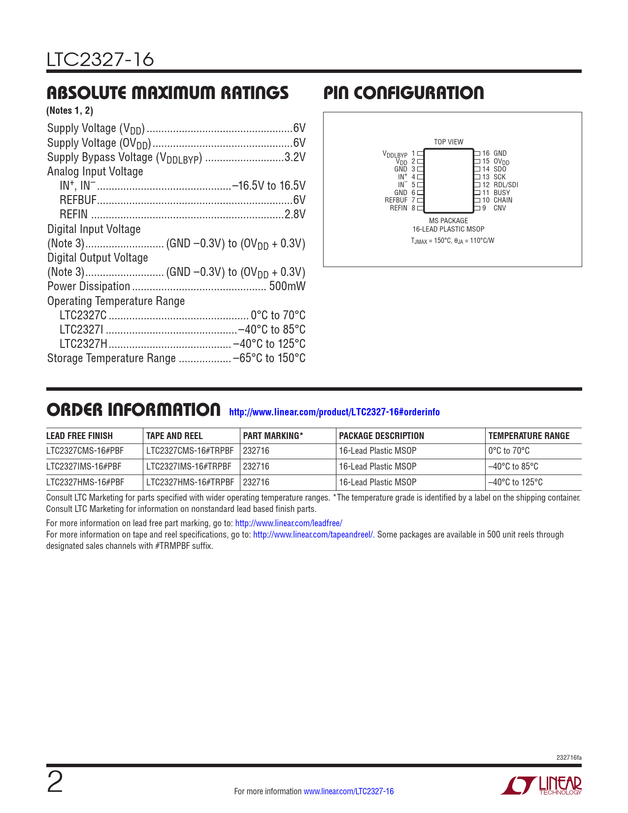 orDer inForMaTion http://www.linear.com/product/LTC2327-16#orderinfo LEAD FREE FINISH TAPE AND REEL PART MARKING* PACKAGE DESCRIPTION TEMPERATURE RANGE