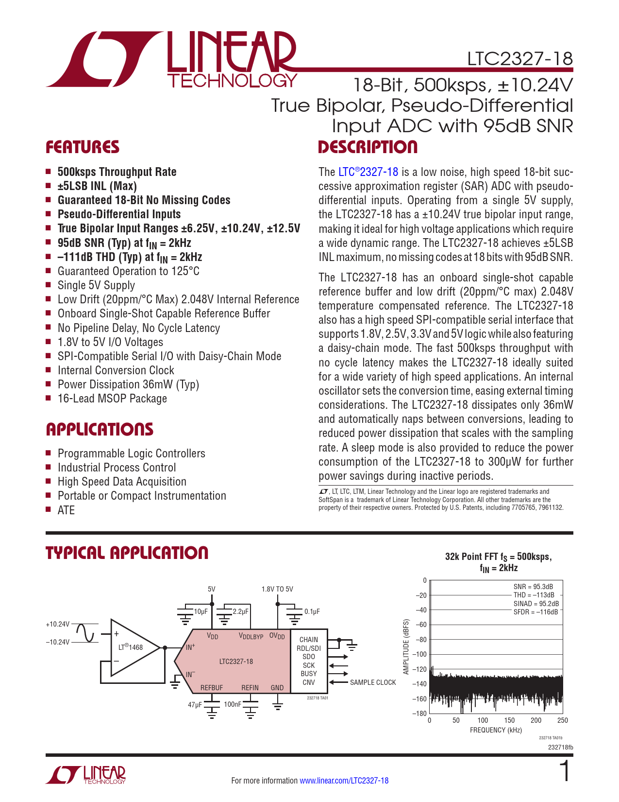 LTC2327-18 18-Bit, 500ksps, ±10.24V True Bipolar, Pseudo-Differential Input ADC with 95dB SNR FeaTuresDescripTion n 500ksps Throughput Rate The LTC®2327-18 is a low noise, high speed 18-bit suc- n ±5LSB INL (Max) cessive approximation register (SAR) ADC with pseudo- n Guaranteed 18-Bit No Missing Codes differential inputs. Operating from a single 5V supply, n Pseudo-Differential Inputs the LTC2327-18 has a ±10.24V true bipolar input range, n True Bipolar Input Ranges ±6.25V, ±10.24V, ±12.5V making it ideal for high voltage applications which require n 95dB SNR (Typ) at fIN = 2kHz a wide dynamic range. The LTC2327-18 achieves ±5LSB n –111dB THD (Typ) at fIN = 2kHz INL maximum, no missing codes at 18 bits with 95dB SNR. n Guaranteed Operation to 125°C The LTC2327-18 has an onboard single-shot capable n Single 5V Supply reference buffer and low drift (20ppm/°C max) 2.048V n Low Drift (20ppm/°C Max) 2.048V Internal Reference temperature compensated reference. The LTC2327-18 n Onboard Single-Shot Capable Reference Buffer also has a high speed SPI-compatible serial interface that n No Pipeline Delay, No Cycle Latency supports 1.8V, 2.5V, 3.3V and 5V logic while also featuring n 1.8V to 5V I/O Voltages a daisy-chain mode. The fast 500ksps throughput with n SPI-Compatible Serial I/O with Daisy-Chain Mode no cycle latency makes the LTC2327-18 ideally suited n Internal Conversion Clock for a wide variety of high speed applications. An internal n Power Dissipation 36mW (Typ) oscillator sets the conversion time, easing external timing n 16-Lead MSOP Package considerations. The LTC2327-18 dissipates only 36mW and automatically naps between conversions, leading to applicaTions reduced power dissipation that scales with the sampling n rate. A sleep mode is also provided to reduce the power Programmable Logic Controllers n consumption of the LTC2327-18 to 300μW for further Industrial Process Control n power savings during inactive periods. High Speed Data Acquisition L, LT, LTC, LTM, Linear Technology and the Linear logo are registered trademarks and n Portable or Compact Instrumentation SoftSpan is a trademark of Linear Technology Corporation. All other trademarks are the n property of their respective owners. Protected by U.S. Patents, including 7705765, 7961132. ATE Typical applicaTion32k Point FFT fS = 500ksps,fIN = 2kHz 0 5V 1.8V TO 5V SNR = 95.3dB –20 THD = –113dB SINAD = 95.2dB 10µF 2.2µF 0.1µF –40 SFDR = –116dB +10.24V –60 + VDD VDDLBYP OVDD –10.24V CHAIN –80 LT®1468 IN+ RDL/SDI –100 – SDO LTC2327-18 SCK –120 IN– BUSY AMPLITUDE (dBFS) CNV SAMPLE CLOCK REF REFBUF REFIN GND –140 232718 TA01 –160 47µF 100nF –180 0 50 100 150 200 250 FREQUENCY (kHz) 232718 TA01b 232718fb For more information www.linear.com/LTC2327-18 1 Document Outline Features Applications Typical Application Description Absolute Maximum Ratings Order Information Pin Configuration Electrical Characteristics Converter Characteristics Dynamic Accuracy Internal Reference Characteristics Reference Buffer Characteristics Digital Inputs and Digital Outputs Power Requirements ADC Timing Characteristics Typical Performance Characteristics Pin Functions Functional Block Diagram Timing Diagram Applications Information Board Layout Package Description Revision History Typical Application Related Parts