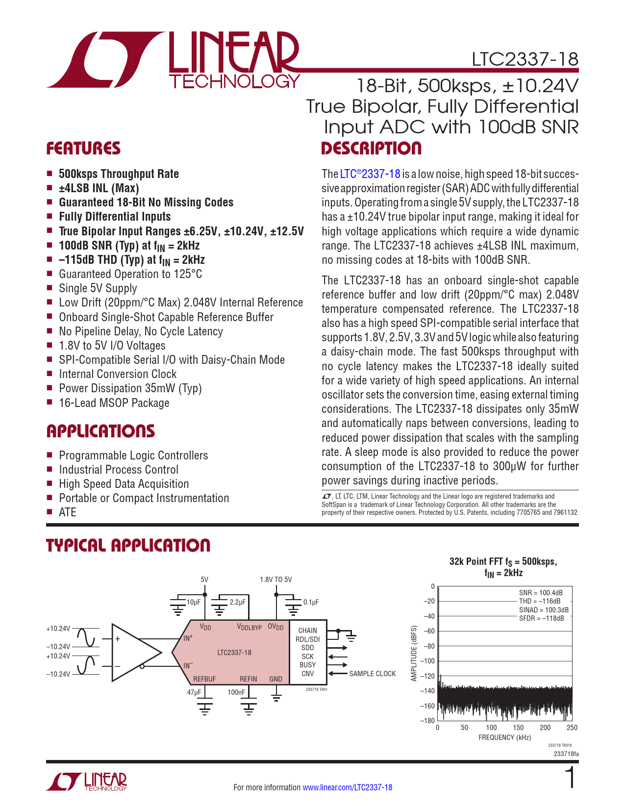 LTC2337-18 18-Bit, 500ksps, ±10.24V True Bipolar, Fully Differential Input ADC with 100dB SNR FEATURESDESCRIPTION n 500ksps Throughput Rate The LTC®2337-18 is a low noise, high speed 18-bit succes- n ±4LSB INL (Max) sive approximation register (SAR) ADC with fully differential n Guaranteed 18-Bit No Missing Codes inputs. Operating from a single 5V supply, the LTC2337-18 n Fully Differential Inputs has a ±10.24V true bipolar input range, making it ideal for n True Bipolar Input Ranges ±6.25V, ±10.24V, ±12.5V high voltage applications which require a wide dynamic n 100dB SNR (Typ) at fIN = 2kHz range. The LTC2337-18 achieves ±4LSB INL maximum, n –115dB THD (Typ) at fIN = 2kHz no missing codes at 18-bits with 100dB SNR. n Guaranteed Operation to 125°C The LTC2337-18 has an onboard single-shot capable n Single 5V Supply reference buffer and low drift (20ppm/°C max) 2.048V n Low Drift (20ppm/°C Max) 2.048V Internal Reference temperature compensated reference. The LTC2337-18 n Onboard Single-Shot Capable Reference Buffer also has a high speed SPI-compatible serial interface that n No Pipeline Delay, No Cycle Latency supports 1.8V, 2.5V, 3.3V and 5V logic while also featuring n 1.8V to 5V I/O Voltages a daisy-chain mode. The fast 500ksps throughput with n SPI-Compatible Serial I/O with Daisy-Chain Mode no cycle latency makes the LTC2337-18 ideally suited n Internal Conversion Clock for a wide variety of high speed applications. An internal n Power Dissipation 35mW (Typ) oscillator sets the conversion time, easing external timing n 16-Lead MSOP Package considerations. The LTC2337-18 dissipates only 35mW and automatically naps between conversions, leading to APPLICATIONS reduced power dissipation that scales with the sampling n rate. A sleep mode is also provided to reduce the power Programmable Logic Controllers n consumption of the LTC2337-18 to 300μW for further Industrial Process Control n power savings during inactive periods. High Speed Data Acquisition L n , LT, LTC, LTM, Linear Technology and the Linear logo are registered trademarks and Portable or Compact Instrumentation SoftSpan is a trademark of Linear Technology Corporation. All other trademarks are the n ATE property of their respective owners. Protected by U.S. Patents, including 7705765 and 7961132 TYPICAL APPLICATION32k Point FFT fS = 500ksps,fIN = 2kHz 5V 1.8V TO 5V 0 SNR = 100.4dB 10µF 2.2µF 0.1µF –20 THD = –116dB SINAD = 100.3dB –40 SFDR = –118dB +10.24V VDD VDDLBYP OVDD CHAIN –60 + IN+ RDL/SDI –10.24V SDO –80 +10.24V LTC2337-18 SCK – –100 IN– BUSY –10.24V CNV SAMPLE CLOCK REF REFBUF REFIN GND AMPLITUDE (dBFS) –120 233718 TA01 47µF 100nF –140 –160 –180 0 50 100 150 200 250 FREQUENCY (kHz) 233718 TA01b 233718fa For more information www.linear.com/LTC2337-18 1 Document Outline Features Applications Typical Application Description Absolute Maximum Ratings Order Information Pin Configuration Electrical Characteristics Converter Characteristics Dynamic Accuracy Internal Reference Characteristics Reference Buffer Characteristics Digital Inputs and Digital Outputs Power Requirements ADC Timing Characteristics Typical Performance Characteristics Pin Functions Functional Block Diagram Timing Diagram Applications Information Board Layout Package Description Revision History Typical Application Related Parts
