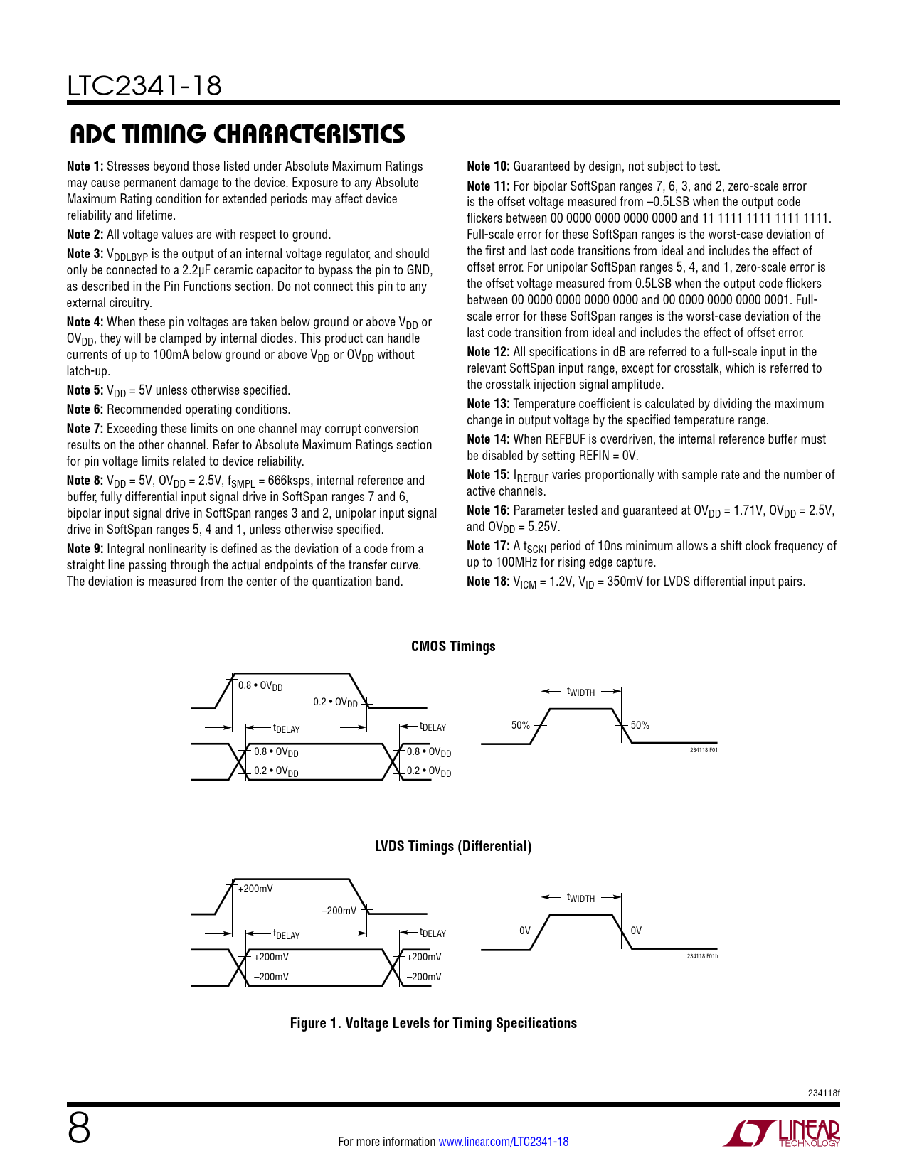 LTC2341-18 aDc TiMing characTerisTicsNote 1: Stresses beyond those listed under Absolute Maximum Ratings Note 10: Guaranteed by design, not subject to test. may cause permanent damage to the device. Exposure to any Absolute Note 11: For bipolar SoftSpan ranges 7, 6, 3, and 2, zero-scale error Maximum Rating condition for extended periods may affect device is the offset voltage measured from –0.5LSB when the output code reliability and lifetime. flickers between 00 0000 0000 0000 0000 and 11 1111 1111 1111 1111. Note 2: All voltage values are with respect to ground. Full-scale error for these SoftSpan ranges is the worst-case deviation of Note 3: V the first and last code transitions from ideal and includes the effect of DDLBYP is the output of an internal voltage regulator, and should only be connected to a 2.2μF ceramic capacitor to bypass the pin to GND, offset error. For unipolar SoftSpan ranges 5, 4, and 1, zero-scale error is as described in the Pin Functions section. Do not connect this pin to any the offset voltage measured from 0.5LSB when the output code flickers external circuitry. between 00 0000 0000 0000 0000 and 00 0000 0000 0000 0001. Full- Note 4: When these pin voltages are taken below ground or above V scale error for these SoftSpan ranges is the worst-case deviation of the DD or OV last code transition from ideal and includes the effect of offset error. DD, they will be clamped by internal diodes. This product can handle currents of up to 100mA below ground or above V Note 12: All specifications in dB are referred to a full-scale input in the DD or OVDD without latch-up. relevant SoftSpan input range, except for crosstalk, which is referred to Note 5: V the crosstalk injection signal amplitude. DD = 5V unless otherwise specified. Note 6: Recommended operating conditions. Note 13: Temperature coefficient is calculated by dividing the maximum change in output voltage by the specified temperature range. Note 7: Exceeding these limits on one channel may corrupt conversion results on the other channel. Refer to Absolute Maximum Ratings section Note 14: When REFBUF is overdriven, the internal reference buffer must for pin voltage limits related to device reliability. be disabled by setting REFIN = 0V. Note 8: V Note 15: I DD = 5V, OVDD = 2.5V, fSMPL = 666ksps, internal reference and REFBUF varies proportionally with sample rate and the number of buffer, fully differential input signal drive in SoftSpan ranges 7 and 6, active channels. bipolar input signal drive in SoftSpan ranges 3 and 2, unipolar input signal Note 16: Parameter tested and guaranteed at OVDD = 1.71V, OVDD = 2.5V, drive in SoftSpan ranges 5, 4 and 1, unless otherwise specified. and OVDD = 5.25V. Note 9: Integral nonlinearity is defined as the deviation of a code from a Note 17: A tSCKI period of 10ns minimum allows a shift clock frequency of straight line passing through the actual endpoints of the transfer curve. up to 100MHz for rising edge capture. The deviation is measured from the center of the quantization band. Note 18: VICM = 1.2V, VID = 350mV for LVDS differential input pairs. CMOS Timings 0.8 • OVDD tWIDTH 0.2 • OVDD t tDELAY 50% 50% DELAY 234118 F01 0.8 • OVDD 0.8 • OVDD 0.2 • OVDD 0.2 • OVDD LVDS Timings (Differential) +200mV tWIDTH –200mV t tDELAY 0V 0V DELAY 234118 F01b +200mV +200mV –200mV –200mV Figure 1. Voltage Levels for Timing Specifications 234118f 8 For more information www.linear.com/LTC2341-18 Document Outline Features Applications Typical Application Description Absolute Maximum Ratings Order Information Pin Configuration Electrical Characteristics Converter Characteristics Dynamic Accuracy Internal Reference Characteristics Reference Buffer Characteristics Digital Inputs and Digital Outputs Power Requirements ADC Timing Characteristics ADC Timing Characteristics ADC Timing Characteristics Typical Performance Characteristics Pin Functions Configuration Tables Functional Block Diagram Timing Diagram Applications Information Board Layout Package Description Typical Application Related Parts