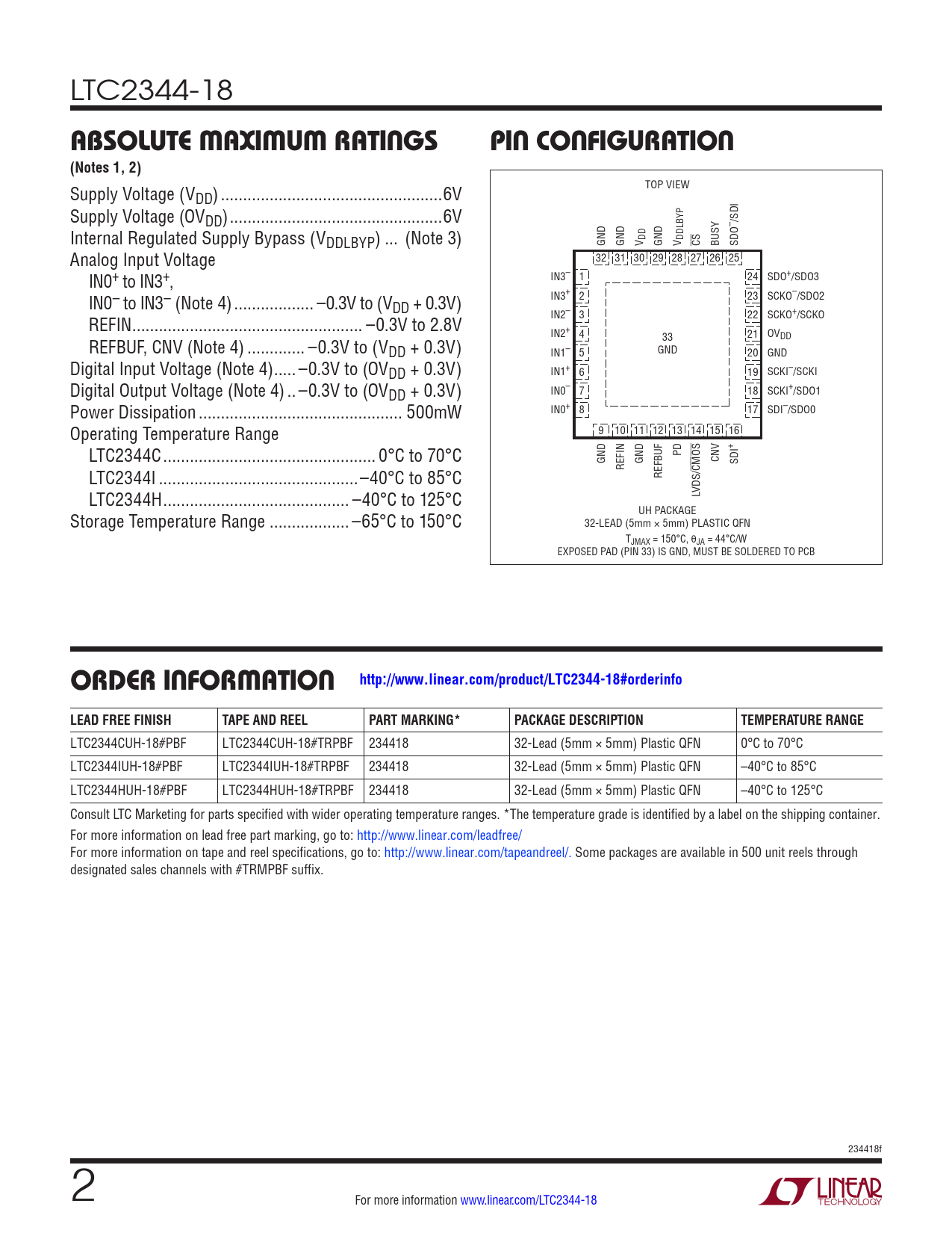 LTC2344-18 ABSOLUTE MAXIMUM RATINGSPIN CONFIGURATION(Notes 1, 2) Supply Voltage (V TOP VIEW DD) ..6V Supply Voltage (OVDD) ..6V – /SDI Internal Regulated Supply Bypass (VDDLBYP) ... (Note 3) GND GND V DD GND V DDLBYP CS BUSY SDO Analog Input Voltage 32 31 30 29 28 27 26 25 IN0+ to IN3+, IN3– 1 24 SDO+/SDO3 IN0– to IN3– (Note 4) .. –0.3V to (V IN3+ 2 23 SCKO–/SDO2 DD + 0.3V) REFIN .. –0.3V to 2.8V IN2– 3 22 SCKO+/SCKO IN2+ 4 21 OV REFBUF, CNV (Note 4) ... –0.3V to (V 33 DD DD + 0.3V) GND IN1– 5 20 GND Digital Input Voltage (Note 4) ... –0.3V to (OVDD + 0.3V) IN1+ 6 19 SCKI–/SCKI Digital Output Voltage (Note 4) .. –0.3V to (OVDD + 0.3V) IN0– 7 18 SCKI+/SDO1 Power Dissipation .. 500mW IN0+ 8 17 SDI–/SDO0 Operating Temperature Range 9 10 11 12 13 14 15 16 LTC2344C .. 0°C to 70°C + PD GND CNV SDI LTC2344I ...–40°C to 85°C REFIN GND CMOS REFBUF LTC2344H .. –40°C to 125°C LVDS/ Storage Temperature Range .. –65°C to 150°C UH PACKAGE 32-LEAD (5mm × 5mm) PLASTIC QFN TJMAX = 150°C, θJA = 44°C/W EXPOSED PAD (PIN 33) IS GND, MUST BE SOLDERED TO PCB ORDER INFORMATION http://www.linear.com/product/LTC2344-18#orderinfoLEAD FREE FINISHTAPE AND REELPART MARKING*PACKAGE DESCRIPTIONTEMPERATURE RANGE LTC2344CUH-18#PBF LTC2344CUH-18#TRPBF 234418 32-Lead (5mm × 5mm) Plastic QFN 0°C to 70°C LTC2344IUH-18#PBF LTC2344IUH-18#TRPBF 234418 32-Lead (5mm × 5mm) Plastic QFN –40°C to 85°C LTC2344HUH-18#PBF LTC2344HUH-18#TRPBF 234418 32-Lead (5mm × 5mm) Plastic QFN –40°C to 125°C Consult LTC Marketing for parts specified with wider operating temperature ranges. *The temperature grade is identified by a label on the shipping container. For more information on lead free part marking, go to: http://www.linear.com/leadfree/ For more information on tape and reel specifications, go to: http://www.linear.com/tapeandreel/. Some packages are available in 500 unit reels through designated sales channels with #TRMPBF suffix. 234418f 2 For more information www.linear.com/LTC2344-18 Document Outline Features Applications Typical Application Description Absolute Maximum Ratings Order Information Pin Configuration Electrical Characteristics Converter Characteristics Dynamic Accuracy Internal Reference Characteristics Reference Buffer Characteristics Digital Inputs and Digital Outputs Power Requirements ADC Timing Characteristics Typical Performance Characteristics Pin Functions Configuration Tables Functional Block Diagram Timing Diagram Applications Information Board Layout Package Description Typical Application Related Parts