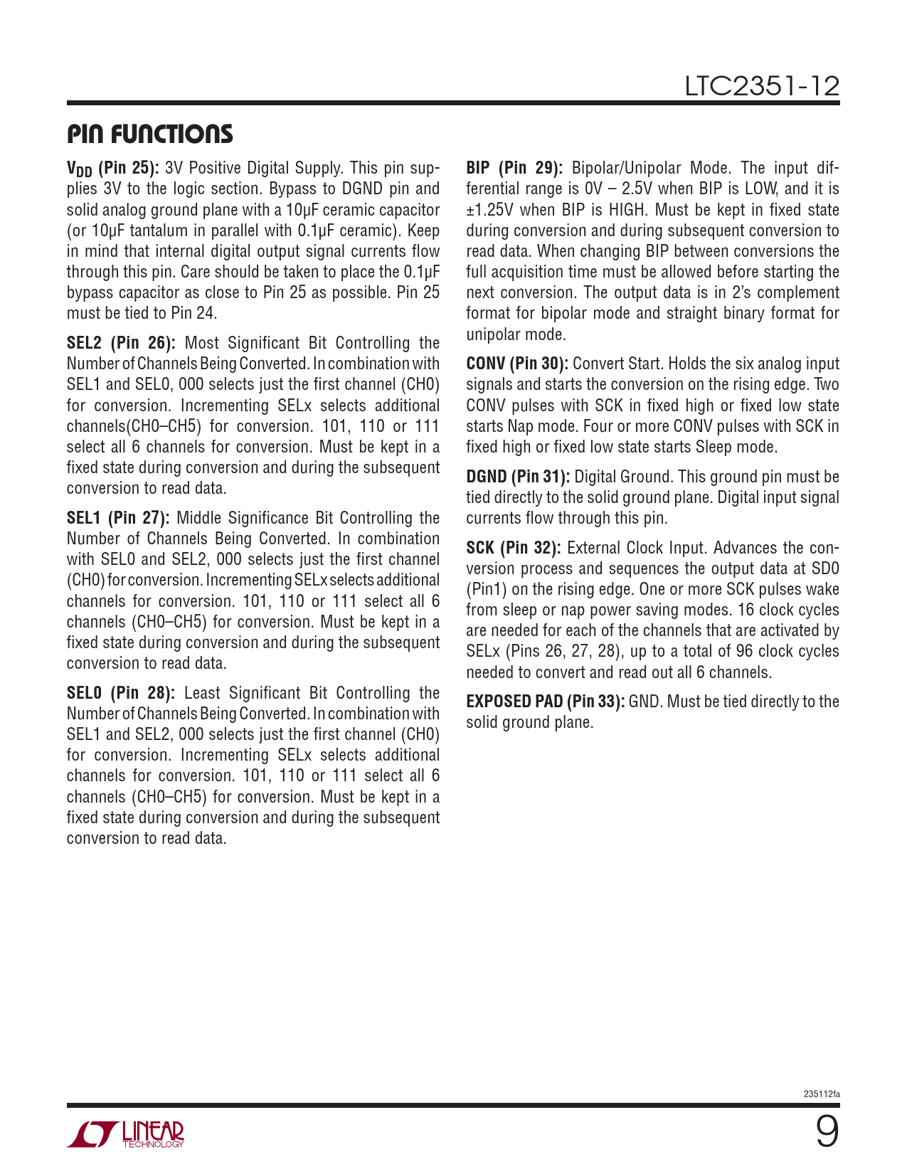页数 / 页20 / 9 — PIN FUNCTIONS. VDD (Pin 25):. BIP (Pin 29):. SEL2 (Pin 26):. CONV (Pin …