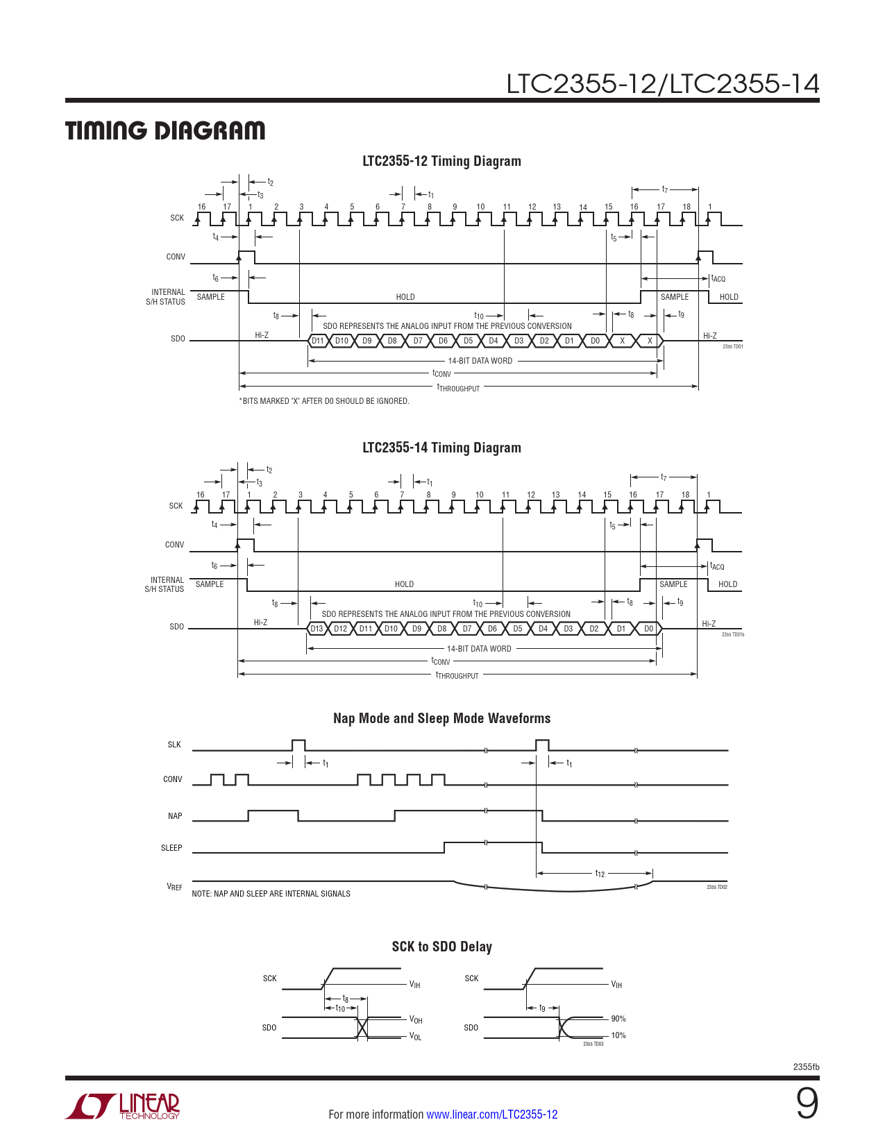 | 页数 / 页 | 18 / 9 — TIMING DIAGRAM. LTC2355-12 Timing Diagram. LTC2355-14 Timing Diagram. Nap … |