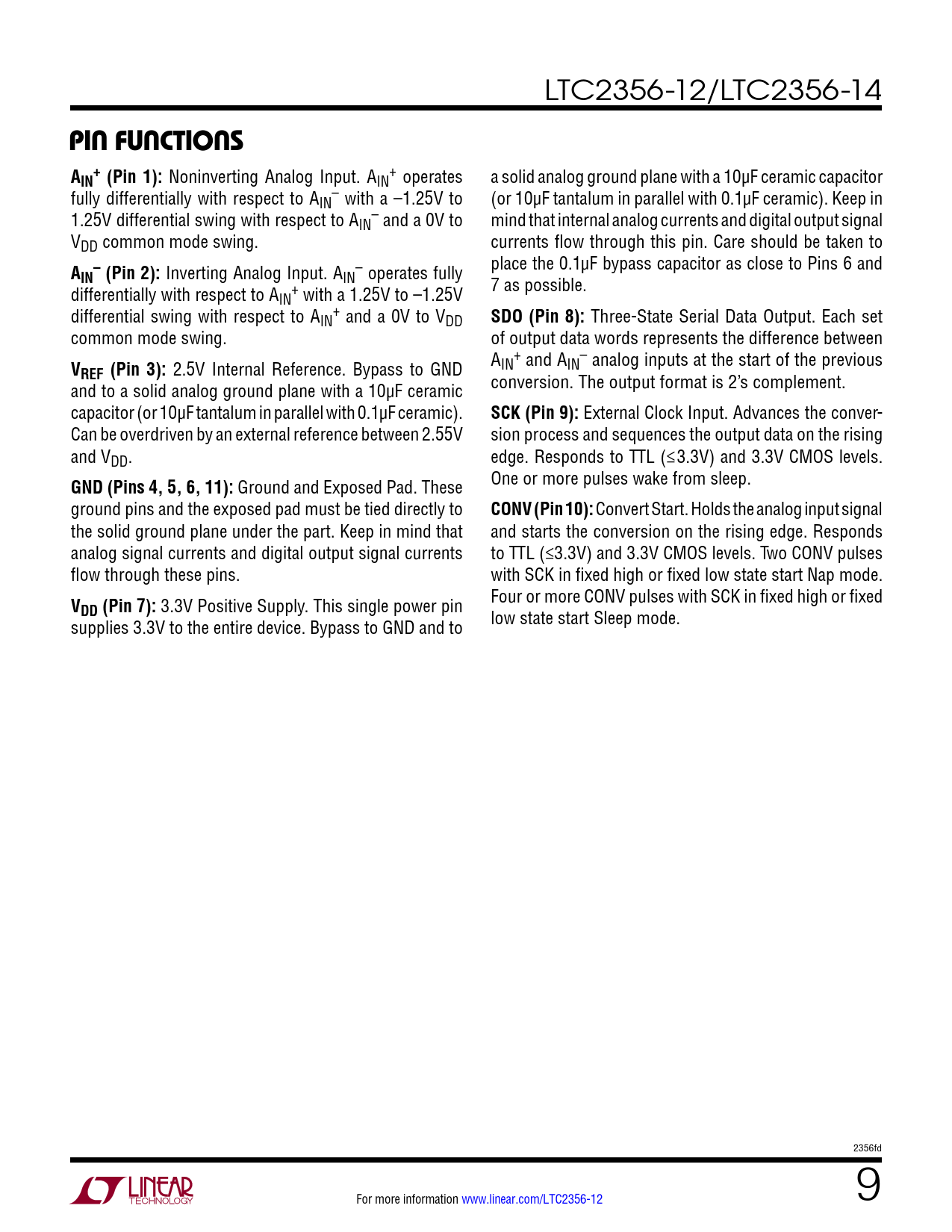 3.3V Positive Supply. This single power pin supplies 3.3V to the entire device. Bypass to GND and to low state start Sleep mode. 2356fd For more information www.linear.com/LTC2356-12 9 Document Outline Features Description Applications Block Diagram Absolute Maximum Ratings Pin Configuration Order Information Converter Characteristics Analog Input Dynamic Accuracy Internal Reference Characteristics Digital Inputs and Digital Outputs Power Requirements Timing Characteristics Typical Performance Characteristics Pin Functions Block Diagram Timing Diagram Applications Information Revision History Typical Application Related Parts