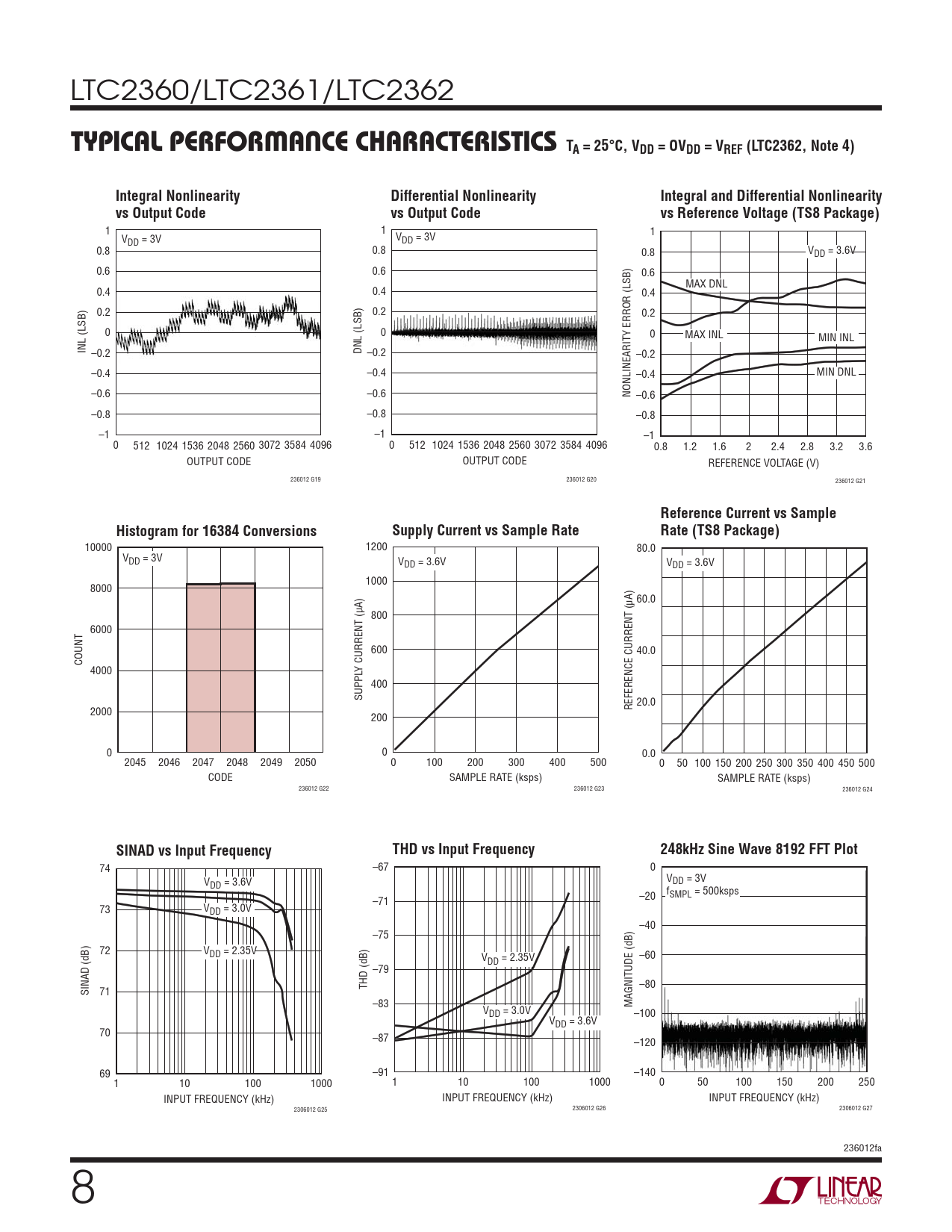 74 –67 0 V V DD = 3.6V DD = 3V fSMPL = 500ksps –71 –20 73 VDD = 3.0V –40 –75 72 VDD = 2.35V V –60 DD = 2.35V –79 THD (dB) –80 SINAD (dB) 71 –83 MAGNITUDE (dB) VDD = 3.0V –100 VDD = 3.6V 70 –87 –120 69 –91 –140 1 10 100 1000 1 10 100 1000 0 50 100 150 200 250 INPUT FREQUENCY (kHz) INPUT FREQUENCY (kHz) INPUT FREQUENCY (kHz) 2306012 G25 2306012 G26 2306012 G27 236012fa 8