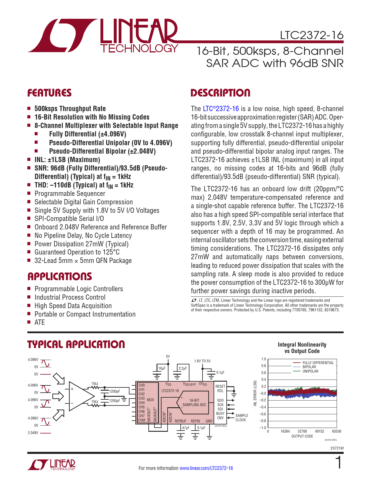 LTC2372-16 16-Bit, 500ksps, 8-Channel SAR ADC with 96dB SNR FeaTuresDescripTion n 500ksps Throughput Rate The LTC®2372-16 is a low noise, high speed, 8-channel n 16-Bit Resolution with No Missing Codes 16-bit successive approximation register (SAR) ADC. Oper- n 8-Channel Multiplexer with Selectable Input Range ating from a single 5V supply, the LTC2372-16 has a highly n Fully Differential (±4.096V) configurable, low crosstalk 8-channel input multiplexer, n Pseudo-Differential Unipolar (0V to 4.096V) supporting fully differential, pseudo-differential unipolar n Pseudo-Differential Bipolar (±2.048V) and pseudo-differential bipolar analog input ranges. The n INL: ±1LSB (Maximum) LTC2372-16 achieves ±1LSB INL (maximum) in all input n SNR: 96dB (Fully Differential)/93.5dB (Pseudo- ranges, no missing codes at 16-bits and 96dB (fully Differential) (Typical) at fIN = 1kHz differential)/93.5dB (pseudo-differential) SNR (typical). n THD: –110dB (Typical) at fIN = 1kHz The LTC2372-16 has an onboard low drift (20ppm/°C n Programmable Sequencer max) 2.048V temperature-compensated reference and n Selectable Digital Gain Compression a single-shot capable reference buffer. The LTC2372-16 n Single 5V Supply with 1.8V to 5V I/O Voltages also has a high speed SPI-compatible serial interface that n SPI-Compatible Serial I/O supports 1.8V, 2.5V, 3.3V and 5V logic through which a n Onboard 2.048V Reference and Reference Buffer sequencer with a depth of 16 may be programmed. An n No Pipeline Delay, No Cycle Latency internal oscillator sets the conversion time, easing external n Power Dissipation 27mW (Typical) timing considerations. The LTC2372-16 dissipates only n Guaranteed Operation to 125°C 27mW and automatically naps between conversions, n 32-Lead 5mm × 5mm QFN Package leading to reduced power dissipation that scales with the applicaTions sampling rate. A sleep mode is also provided to reduce the power consumption of the LTC2372-16 to 300μW for n Programmable Logic Controllers further power savings during inactive periods. n Industrial Process Control L, LT, LTC, LTM, Linear Technology and the Linear logo are registered trademarks and n SoftSpan is a trademark of Linear Technology Corporation. All other trademarks are the property High Speed Data Acquisition of their respective owners. Protected by U.S. Patents, including 7705765, 7961132, 8319673. n Portable or Compact Instrumentation n ATE Typical applicaTionIntegral Nonlinearityvs Output Code 5V 4.096V 1.8V TO 5V 1.0 FULLY DIFFERENTIAL 0V 0.8 10µF 2.2µF BIPOLAR 0.1µF UNIPOLAR 0V 0.6 0.4 10Ω 4.096V CH0 VDD VDDLBYP OVDD RESET + 0.2 1200pF CH1 LTC2372-16 RDL 0V CH2 –0.0 CH3 + 4.096V 10Ω 1200pF MUX 16-BIT SDO – –0.2 CH4 SAMPLING ADC SCK 0V CH5 INL ERROR (LSB) – + – SDI –0.4 CH6 + – BUSY CH7 SAMPLE –0.6 4.096V CNV COM MUXOUT MUXOUT CLOCK ADCIN ADCIN REFBUF REFIN GND –0.8 0V 237216 TA01a 47µF 0.1µF –1.0 2.048V 0 16384 32768 49152 65536 OUTPUT CODE 237216 TA01b 237216f For more information www.linear.com/LTC2372-16 1 Document Outline Features Applications Typical Application Description Absolute Maximum Ratings Order Information Pin Configuration Electrical Characteristics Converter Characteristics Dynamic Accuracy Internal Reference Characteristics Reference Buffer Characteristics Digital Inputs and Digital Outputs Power Requirements ADC Timing Characteristics Electrical Characteristics Typical Performance Characteristics Pin Functions Functional Block Diagram Timing Diagram Applications Information Timing Diagrams Board Layout Schematics Package Description Typical Application Related Parts