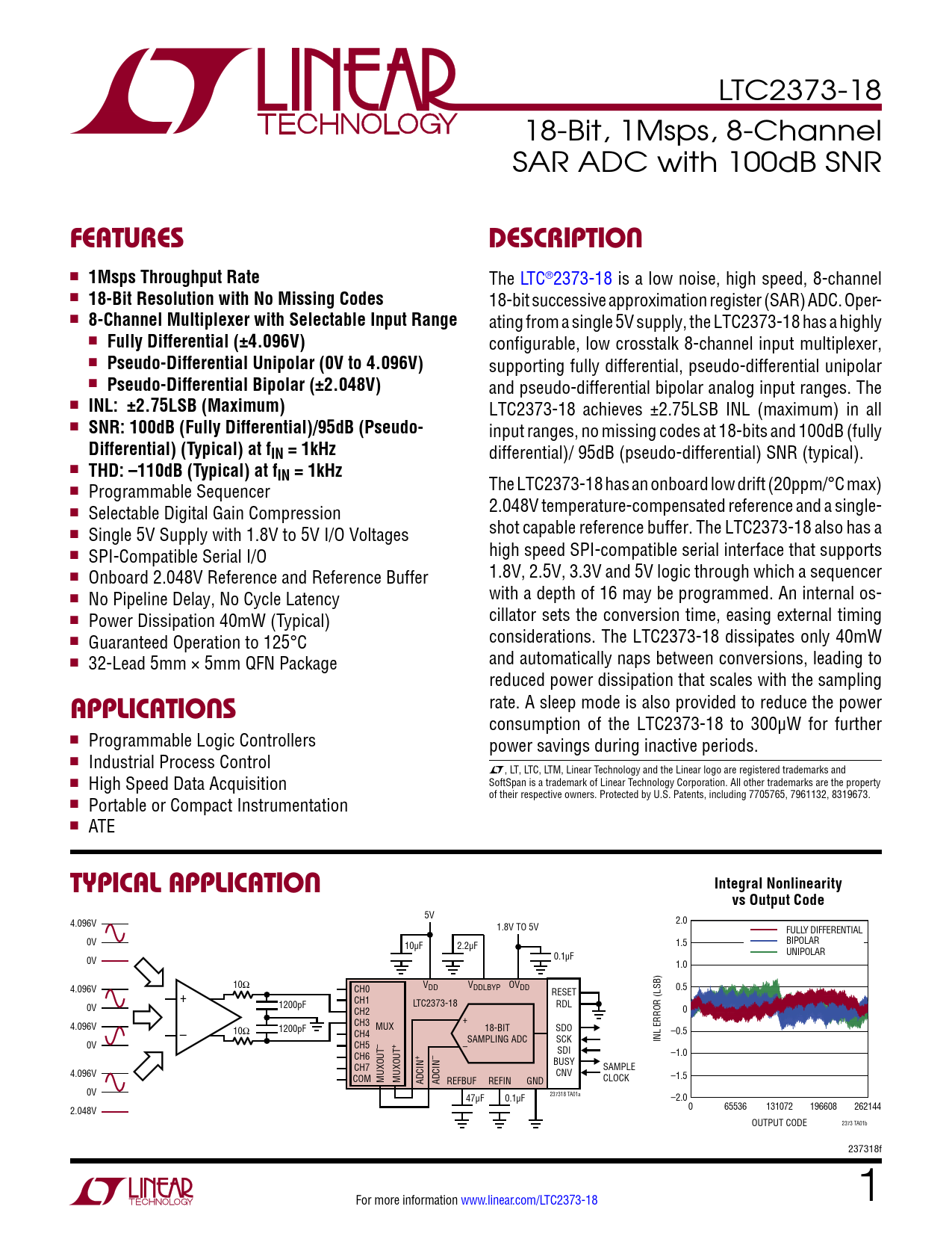 LTC2373-18 18-Bit, 1Msps, 8-Channel SAR ADC with 100dB SNR FeaTuresDescripTion n 1Msps Throughput Rate The LTC®2373-18 is a low noise, high speed, 8-channel n 18-Bit Resolution with No Missing Codes 18-bit successive approximation register (SAR) ADC. Oper- n 8-Channel Multiplexer with Selectable Input Range ating from a single 5V supply, the LTC2373-18 has a highly n Fully Differential (±4.096V) configurable, low crosstalk 8-channel input multiplexer, n Pseudo-Differential Unipolar (0V to 4.096V) supporting fully differential, pseudo-differential unipolar n Pseudo-Differential Bipolar (±2.048V) and pseudo-differential bipolar analog input ranges. The n INL: ±2.75LSB (Maximum) LTC2373-18 achieves ±2.75LSB INL (maximum) in all n SNR: 100dB (Fully Differential)/95dB (Pseudo- input ranges, no missing codes at 18-bits and 100dB (fully Differential) (Typical) at fIN = 1kHz differential)/ 95dB (pseudo-differential) SNR (typical). n THD: –110dB (Typical) at fIN = 1kHz n The LTC2373-18 has an onboard low drift (20ppm/°C max) Programmable Sequencer n 2.048V temperature-compensated reference and a single- Selectable Digital Gain Compression n shot capable reference buffer. The LTC2373-18 also has a Single 5V Supply with 1.8V to 5V I/O Voltages n high speed SPI-compatible serial interface that supports SPI-Compatible Serial I/O n 1.8V, 2.5V, 3.3V and 5V logic through which a sequencer Onboard 2.048V Reference and Reference Buffer n with a depth of 16 may be programmed. An internal os- No Pipeline Delay, No Cycle Latency n cillator sets the conversion time, easing external timing Power Dissipation 40mW (Typical) n considerations. The LTC2373-18 dissipates only 40mW Guaranteed Operation to 125°C n and automatically naps between conversions, leading to 32-Lead 5mm × 5mm QFN Package reduced power dissipation that scales with the sampling applicaTions rate. A sleep mode is also provided to reduce the power consumption of the LTC2373-18 to 300μW for further n Programmable Logic Controllers power savings during inactive periods. n Industrial Process Control L, LT, LTC, LTM, Linear Technology and the Linear logo are registered trademarks and n SoftSpan is a trademark of Linear Technology Corporation. All other trademarks are the property High Speed Data Acquisition of their respective owners. Protected by U.S. Patents, including 7705765, 7961132, 8319673. n Portable or Compact Instrumentation n ATE Typical applicaTionIntegral Nonlinearityvs Output Code 5V 4.096V 2.0 1.8V TO 5V FULLY DIFFERENTIAL 0V 10µF 2.2µF 1.5 BIPOLAR 0.1µF UNIPOLAR 0V 1.0 10Ω 4.096V CH0 VDD VDDLBYP OVDD RESET 0.5 + 1200pF CH1 LTC2373-18 RDL 0V CH2 0 CH3 + 4.096V 10Ω 1200pF MUX 18-BIT SDO – CH4 –0.5 SAMPLING ADC SCK INL ERROR (LSB) 0V CH5 – + – SDI CH6 + – –1.0 BUSY CH7 SAMPLE 4.096V CNV COM MUXOUT MUXOUT CLOCK ADCIN ADCIN REFBUF REFIN GND –1.5 0V 237318 TA01a 47µF 0.1µF –2.0 2.048V 0 65536 131072 196608 262144 OUTPUT CODE 2373 TA01b 237318f For more information www.linear.com/LTC2373-18 1 Document Outline Features Applications Description Typical Application Absolute Maximum Ratings Pin Configuration Order Information Electrical Characteristics Converter Characteristics Dynamic Accuracy Internal Reference Characteristics Reference Buffer Characteristics Digital Inputs and Digital Outputs Power Requirements ADC Timing Characteristics Typical Performance Characteristics Pin Functions Functional Block Diagram Timing Diagram