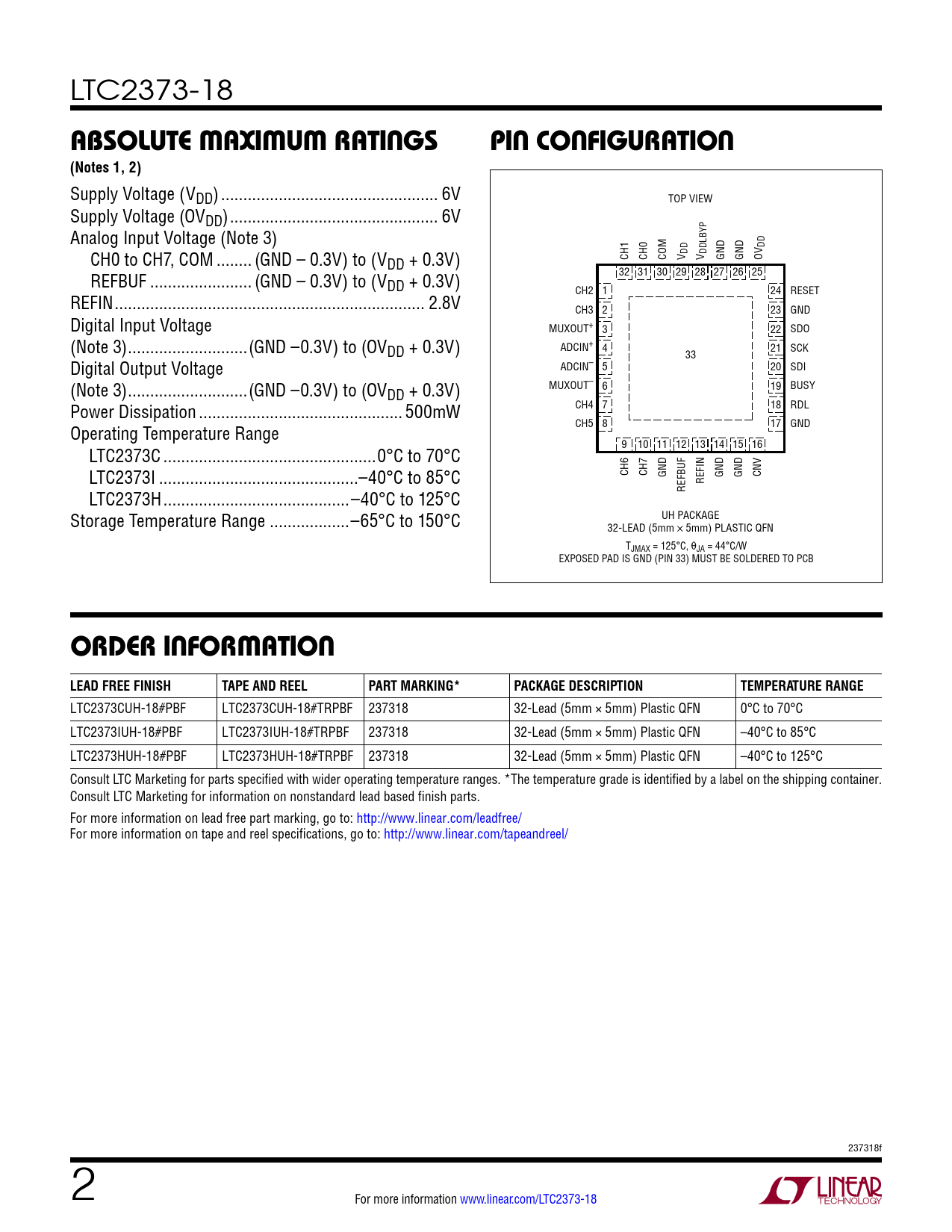 LTC2373-18 absoluTe MaxiMuM raTingspin conFiguraTion(Notes 1, 2) Supply Voltage (VDD) ... 6V TOP VIEW Supply Voltage (OVDD) ... 6V Analog Input Voltage (Note 3) DD CH1 CH0 COM V DD V DDLBYP GND GND OV CH0 to CH7, COM .. (GND – 0.3V) to (VDD + 0.3V) 32 31 30 29 28 27 26 25 REFBUF ... (GND – 0.3V) to (VDD + 0.3V) CH2 1 24 RESET REFIN .. 2.8V CH3 2 23 GND Digital Input Voltage MUXOUT+ 3 22 SDO (Note 3) ...(GND –0.3V) to (OV ADCIN+ 4 SCK DD + 0.3V) 33 21 ADCIN– 5 20 SDI Digital Output Voltage MUXOUT– 6 19 BUSY (Note 3) ...(GND –0.3V) to (OVDD + 0.3V) CH4 7 18 RDL Power Dissipation .. 500mW CH5 8 17 GND Operating Temperature Range 9 10 11 12 13 14 15 16 LTC2373C ..0°C to 70°C CH6 CH7 GND LTC2373I ...–40°C to 85°C REFIN GND GND CNV REFBUF LTC2373H ..–40°C to 125°C UH PACKAGE Storage Temperature Range ..–65°C to 150°C 32-LEAD (5mm × 5mm) PLASTIC QFN TJMAX = 125°C, θJA = 44°C/W EXPOSED PAD IS GND (PIN 33) MUST BE SOLDERED TO PCB orDer inForMaTion LEAD FREE FINISHTAPE AND REELPART MARKING*PACKAGE DESCRIPTIONTEMPERATURE RANGE LTC2373CUH-18#PBF LTC2373CUH-18#TRPBF 237318 32-Lead (5mm × 5mm) Plastic QFN 0°C to 70°C LTC2373IUH-18#PBF LTC2373IUH-18#TRPBF 237318 32-Lead (5mm × 5mm) Plastic QFN –40°C to 85°C LTC2373HUH-18#PBF LTC2373HUH-18#TRPBF 237318 32-Lead (5mm × 5mm) Plastic QFN –40°C to 125°C Consult LTC Marketing for parts specified with wider operating temperature ranges. *The temperature grade is identified by a label on the shipping container. Consult LTC Marketing for information on nonstandard lead based finish parts. For more information on lead free part marking, go to: http://www.linear.com/leadfree/ For more information on tape and reel specifications, go to: http://www.linear.com/tapeandreel/ 237318f 2 For more information www.linear.com/LTC2373-18 Document Outline Features Applications Description Typical Application Absolute Maximum Ratings Pin Configuration Order Information Electrical Characteristics Converter Characteristics Dynamic Accuracy Internal Reference Characteristics Reference Buffer Characteristics Digital Inputs and Digital Outputs Power Requirements ADC Timing Characteristics Typical Performance Characteristics Pin Functions Functional Block Diagram Timing Diagram