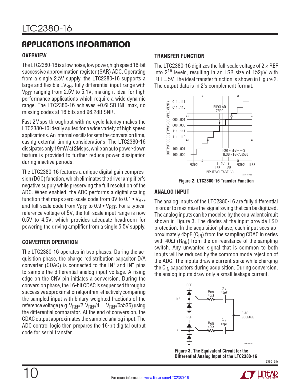 APPLICATIONS INFORMATION OVERVIEW TRANSFER FUNCTION Figure 2 LTC2380-16 Transfer Function ANALOG INPUT CONVERTER OPERATION